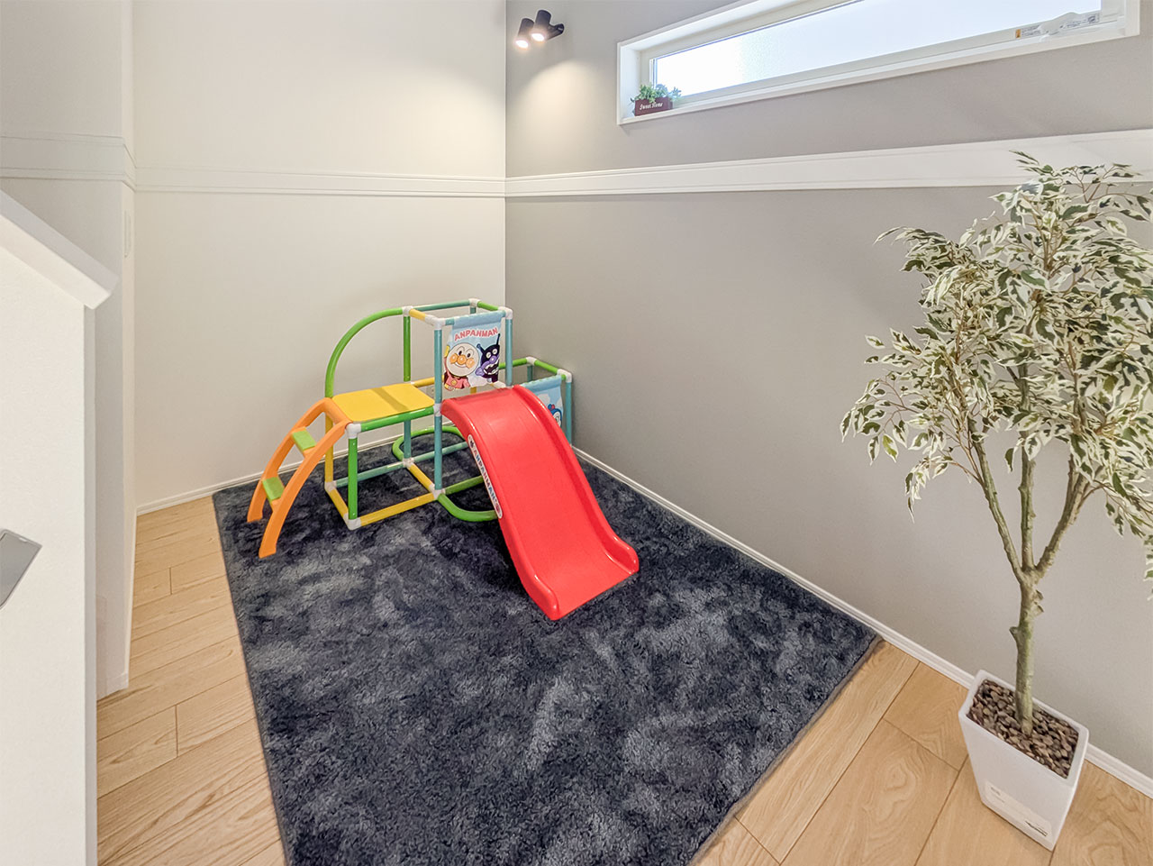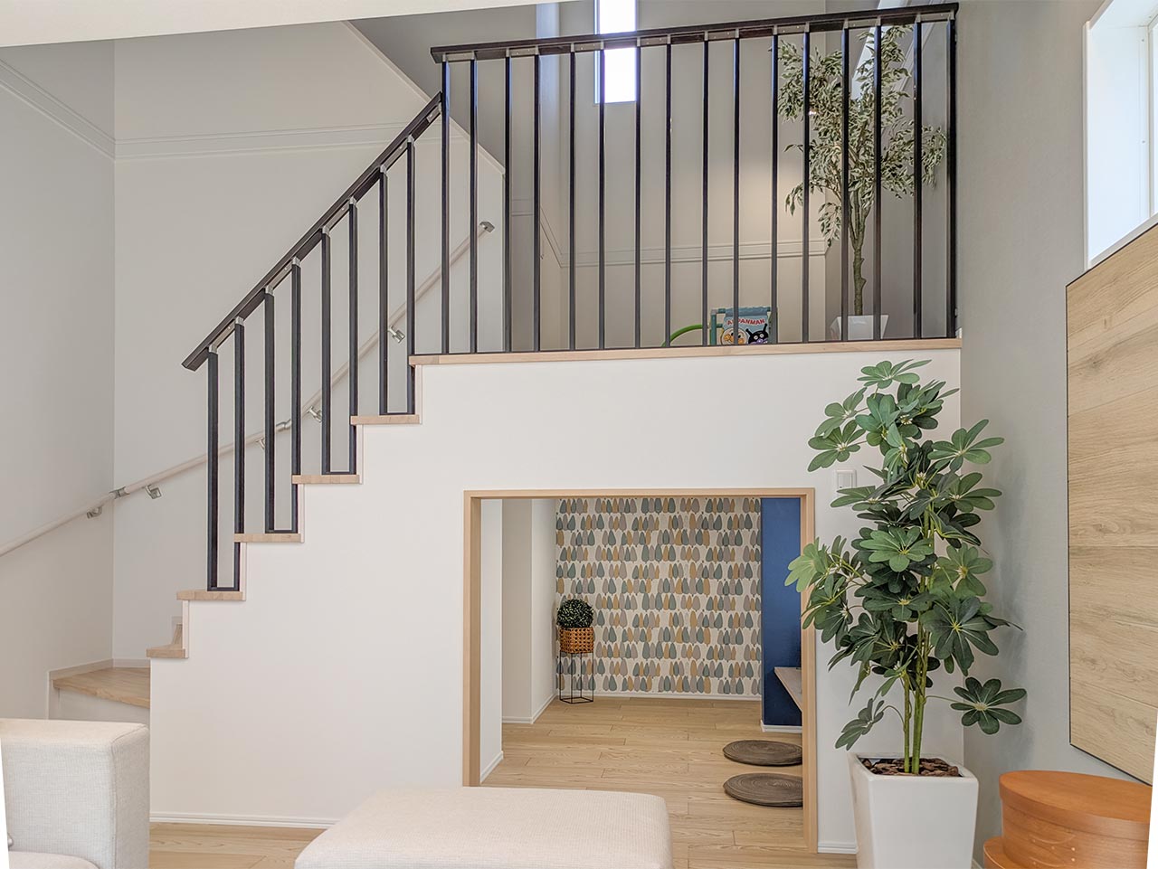 リビング階段の踊り場を利用したステージリビング。子どもが遊んだり、リビング学習をしたりと、リビングに子ども達の居場所を創るスペースです。もちろん、家族が自由に使えるスペースとして、様々なライフシーンを個性的に紡ぐアイデア空間です。