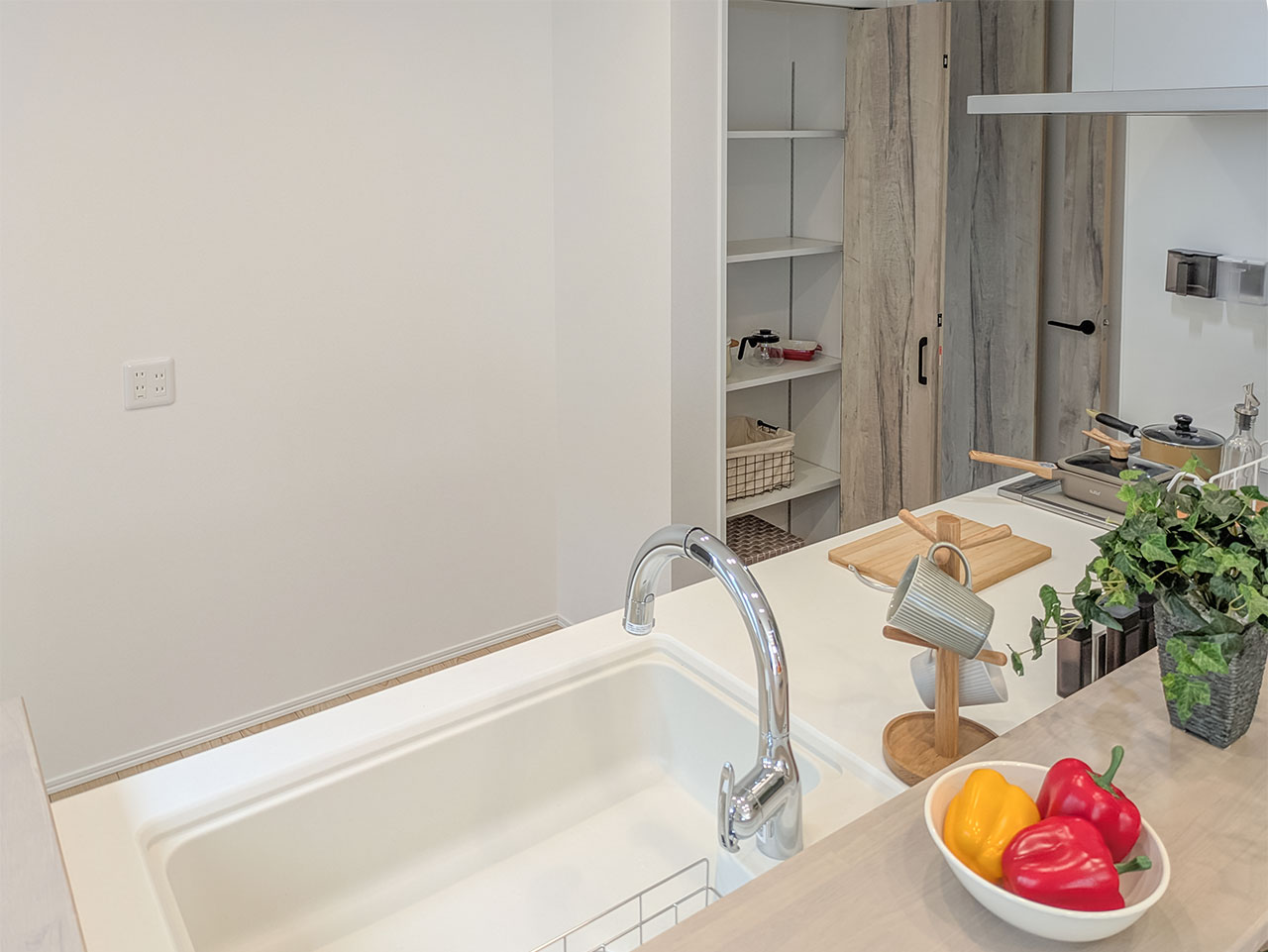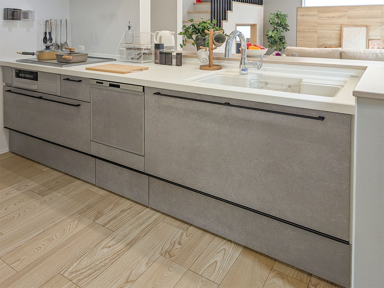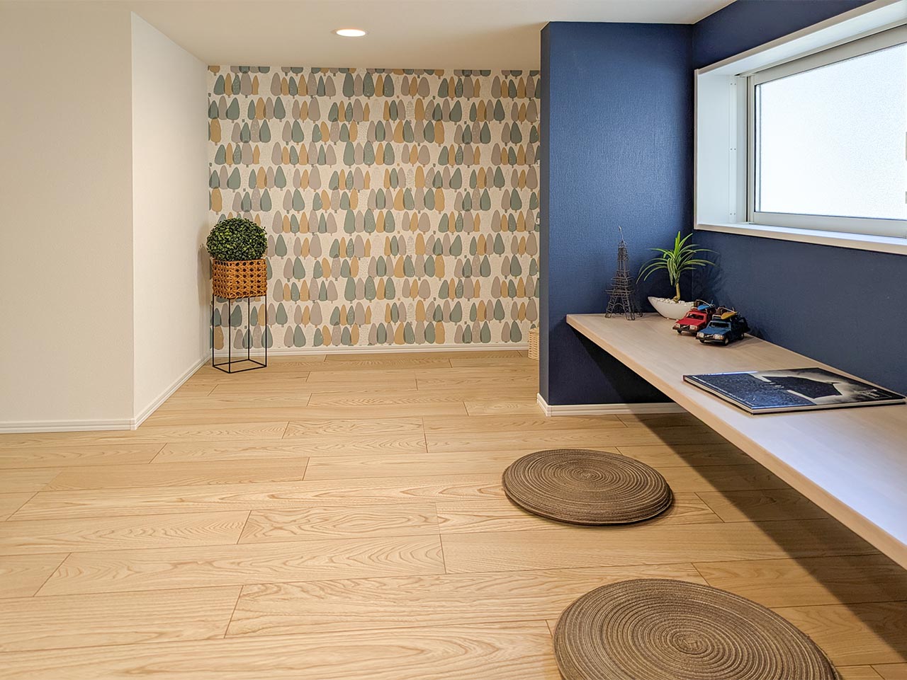 リビングの背面に、机と収納を備えたアトリエスペースを設置しました。買い置きの収納や、ワークスペースとしてもお使いいただけます。