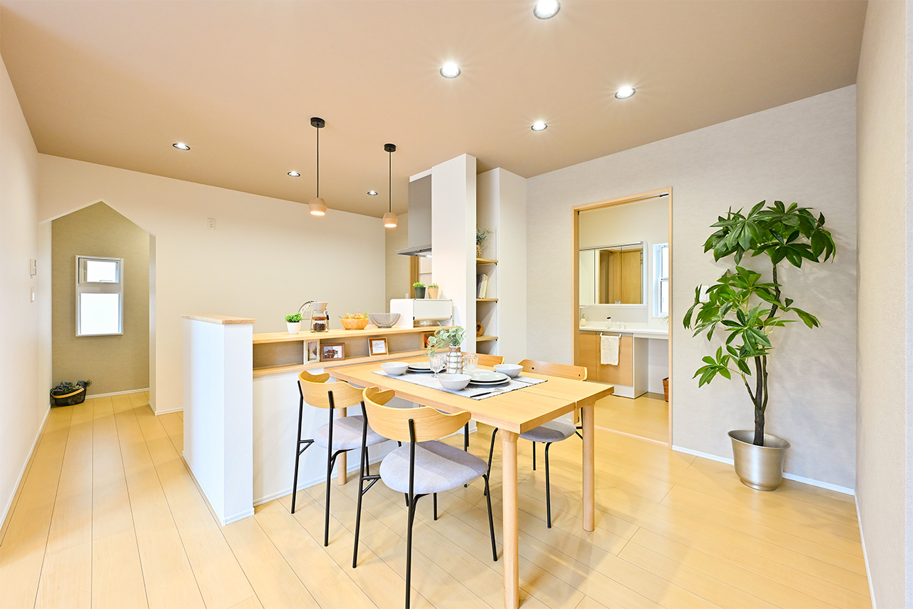 ご家族の団らんや寛ぎの中心となるリビング空間をさらに際立たせる吹抜け天井プラン。2階天井まで続くその圧倒的な存在感と広がりが訪れた方を驚きを持ってお迎えします。大切にしたいご家族やゲストをもてなす上質な空間です。