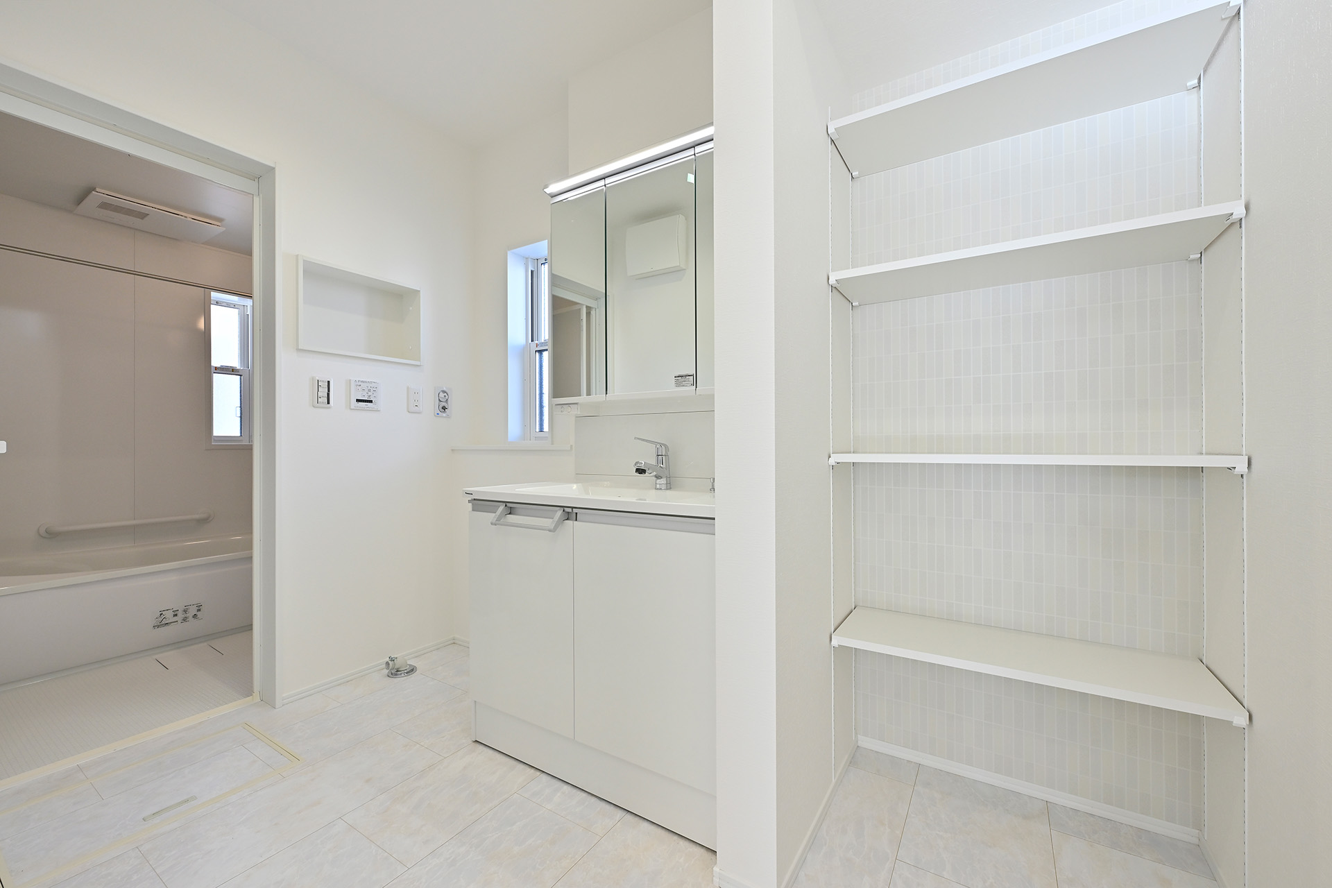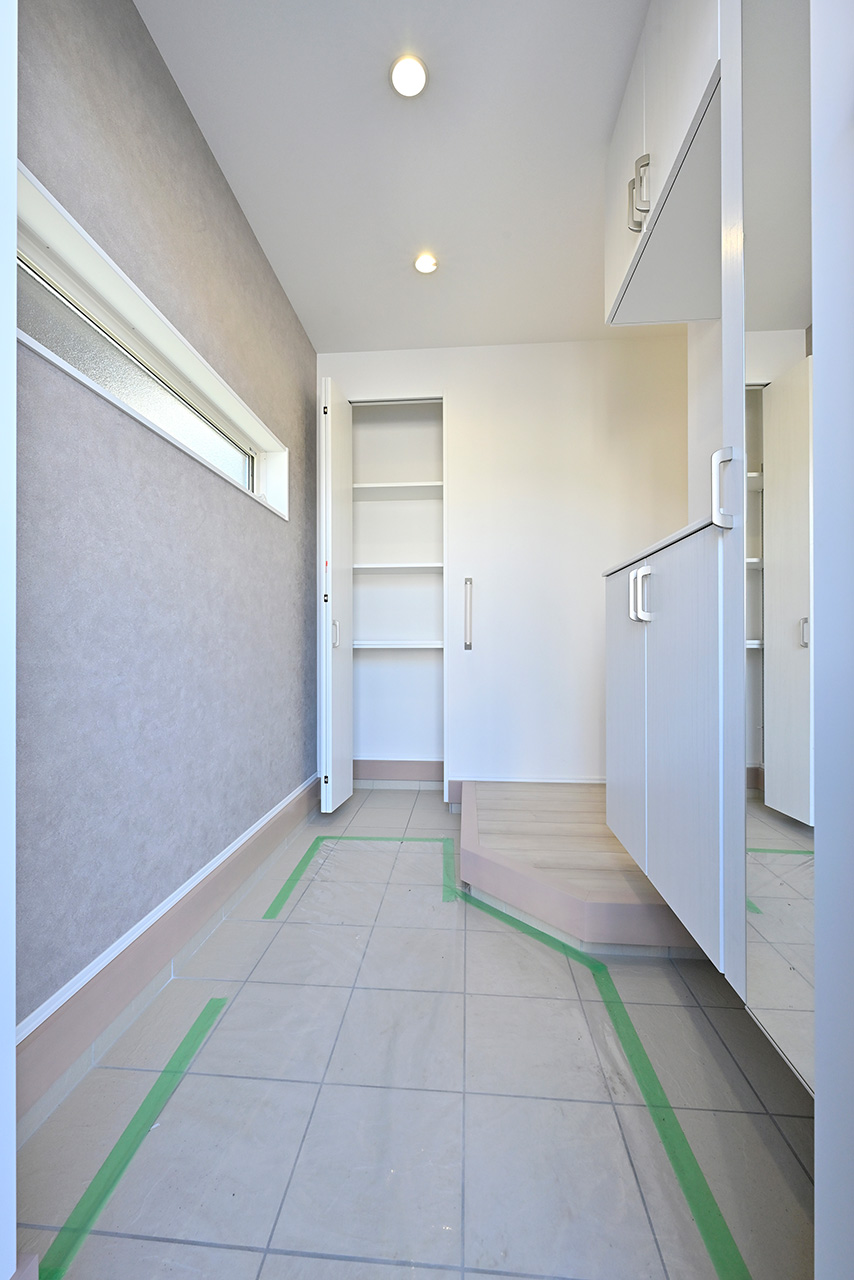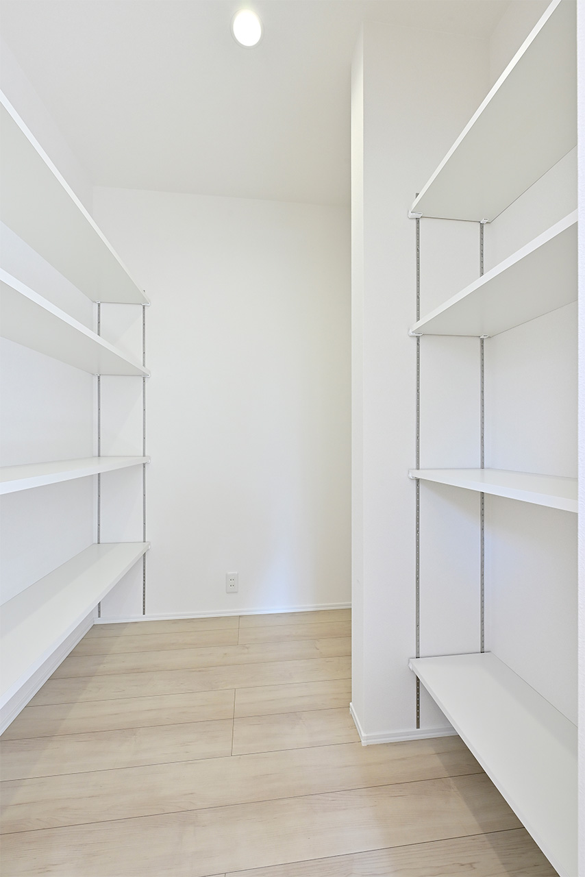 リビングそばに、家族がみんなが使いやすいたっぷり収納できるストレージをご用意。日用品や生活雑貨はもちろん、お子様のおもちゃなど、様々な収納に活用できます。日常の収納以外にも、来客時には、散らかった雑誌やおもちゃなども手早く片づける事ができます。