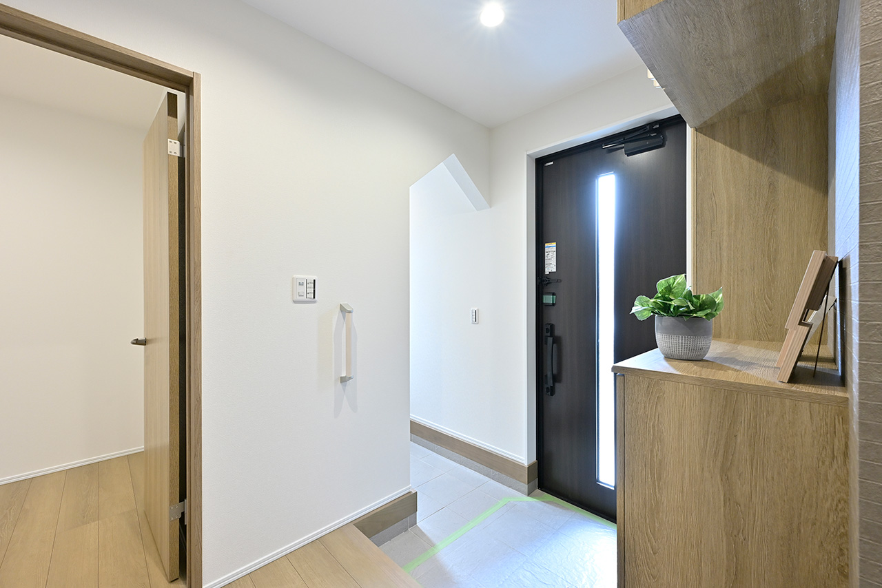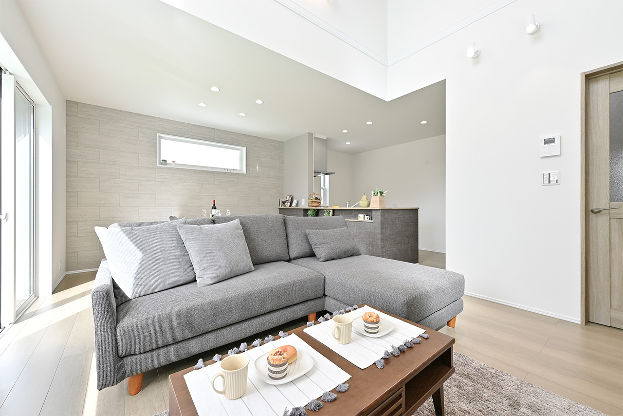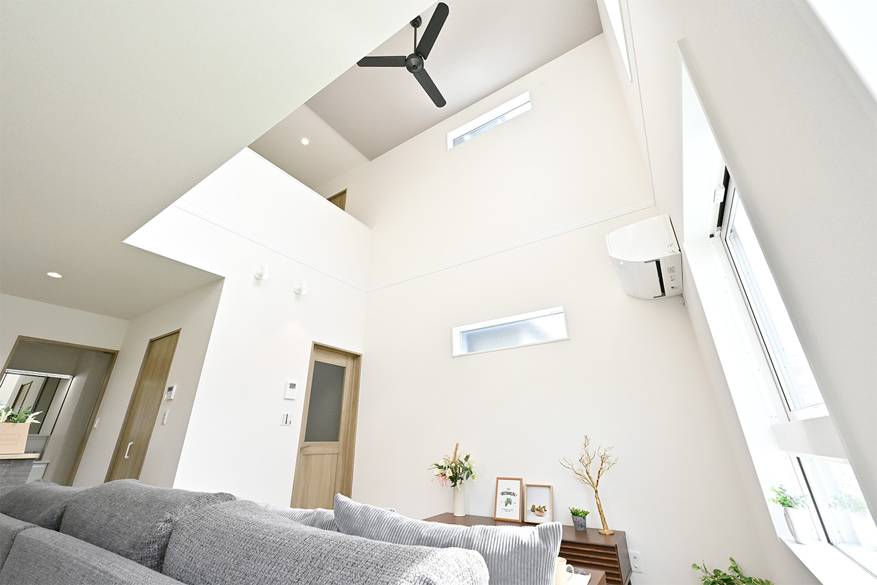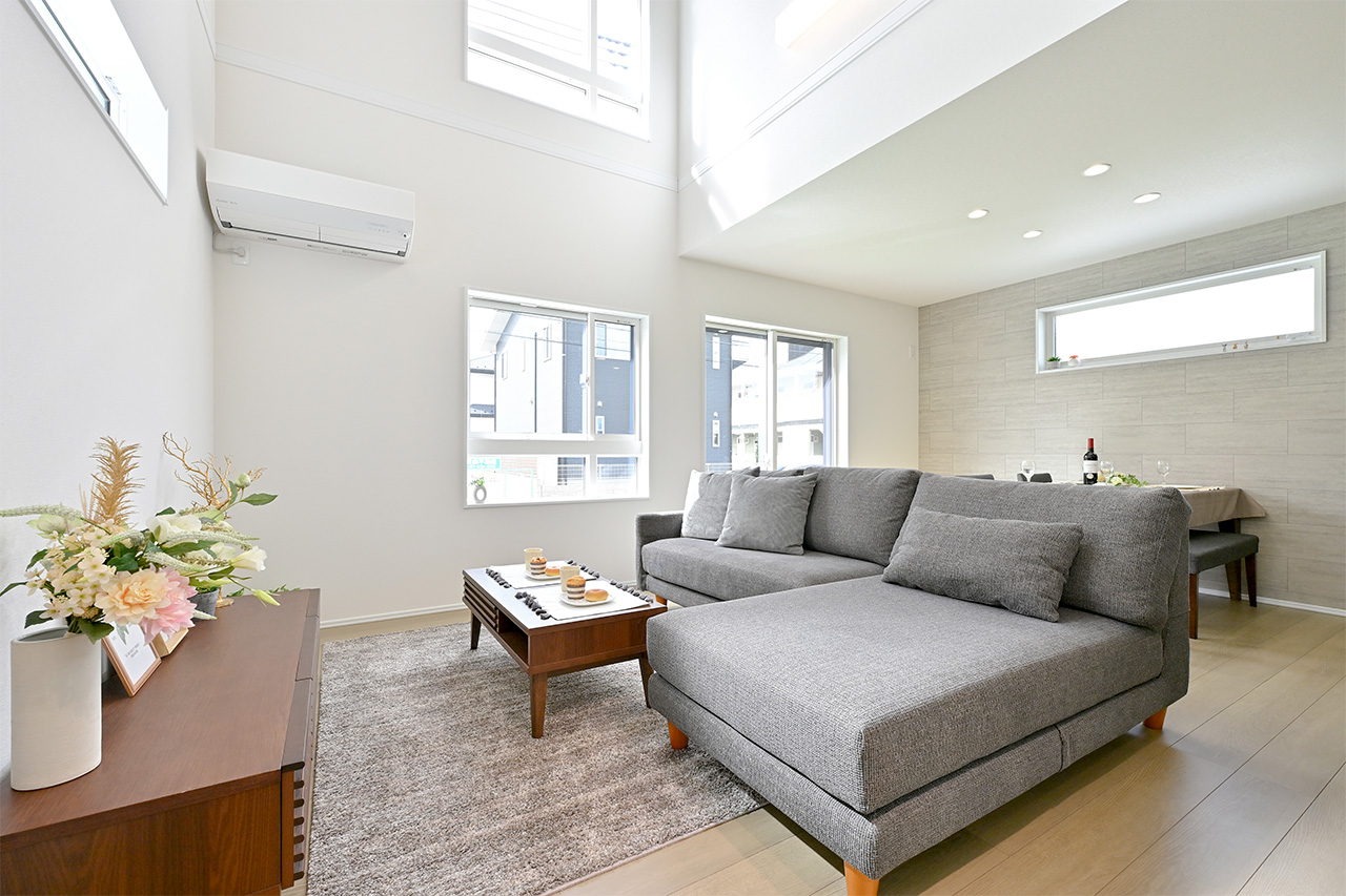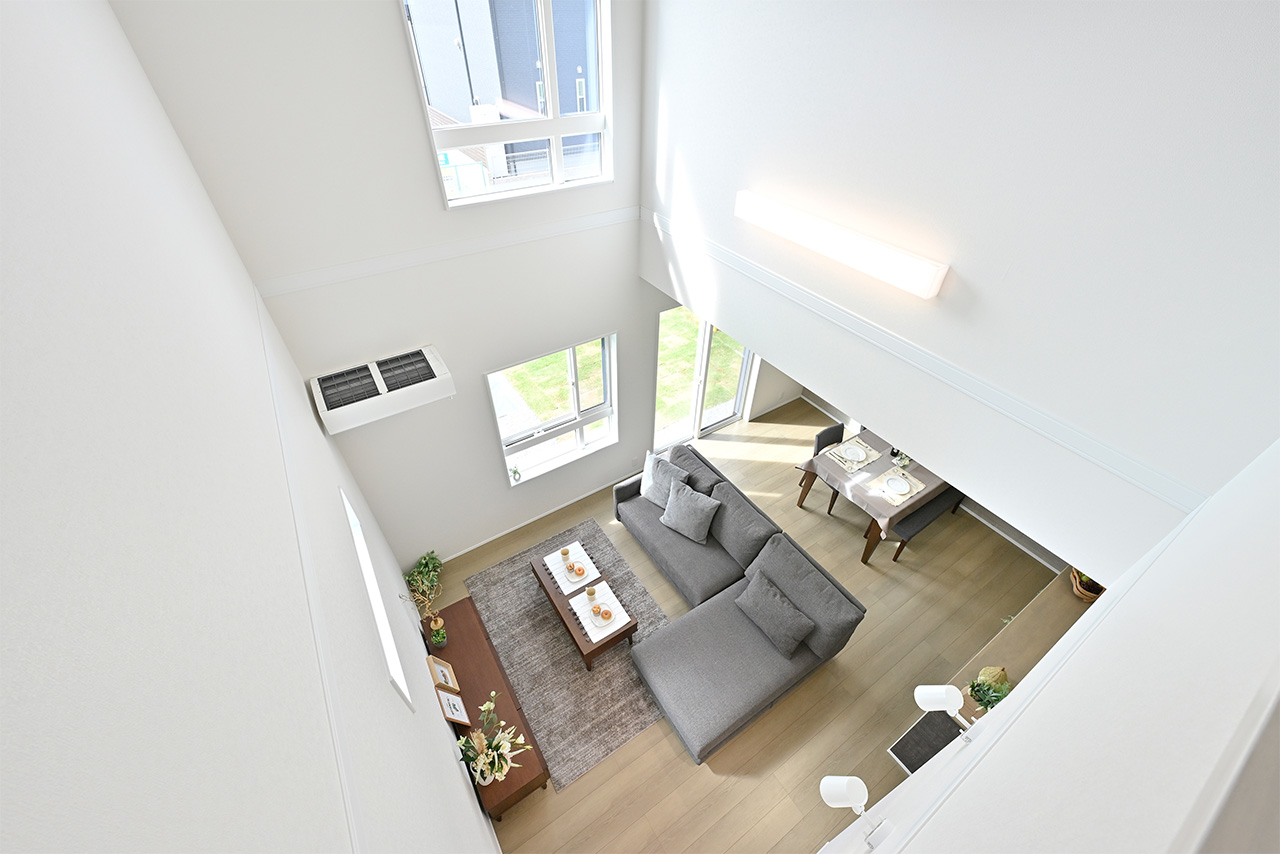 ご家族の団らんや寛ぎの中心となるリビング空間をさらに際立たせる吹抜け天井プラン。2階天井まで続くその圧倒的な存在感と広がりが訪れた方を驚きを持ってお迎えします。大切にしたいご家族やゲストをもてなす上質な空間です。
