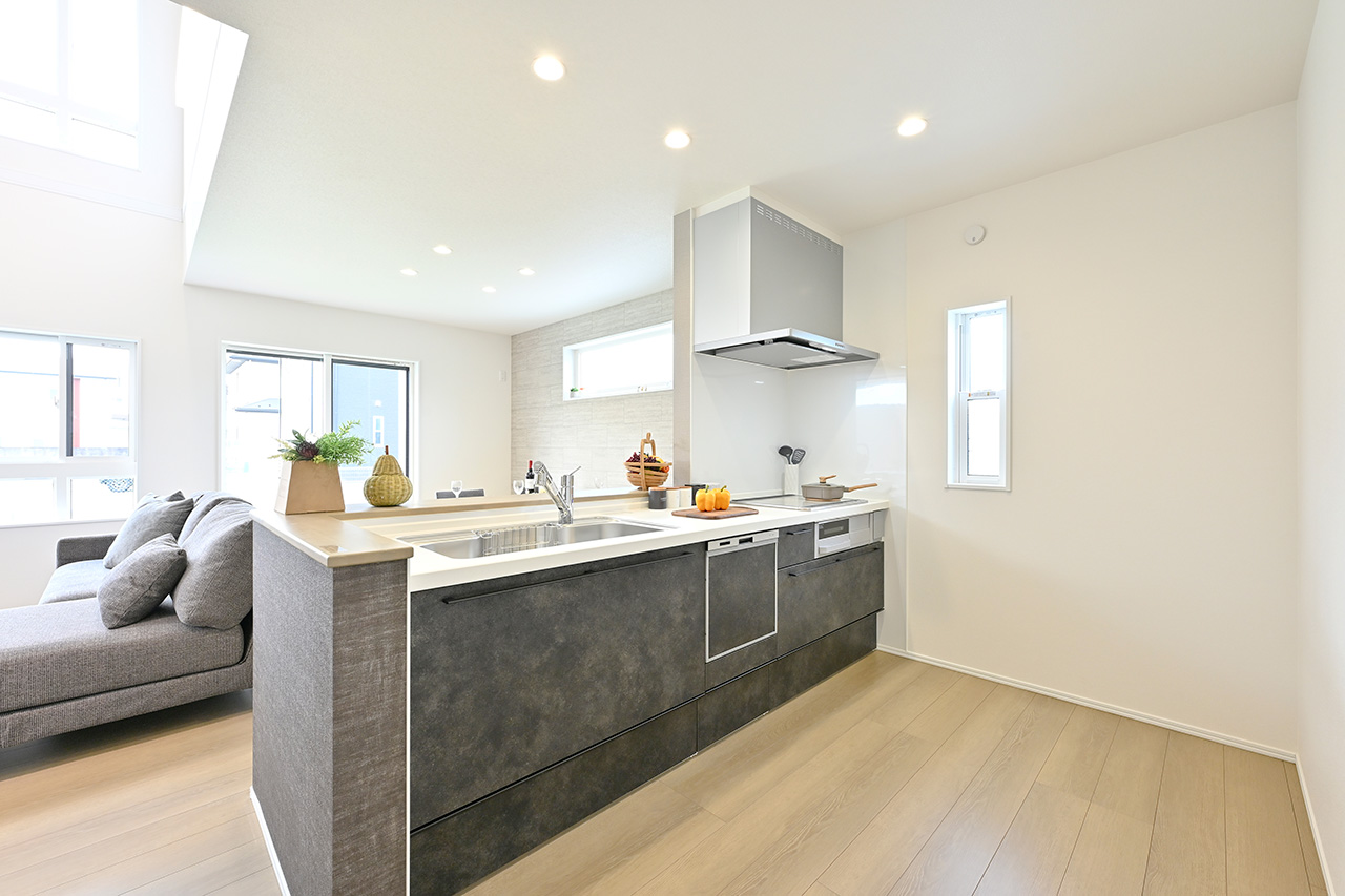 家族でのコミュニケーションがとれる対面型システムキッチンです。横一列にシンクとコンロをまとめたシンプルな形です。動きやすさとスタイリッシュなデザインが魅力です。