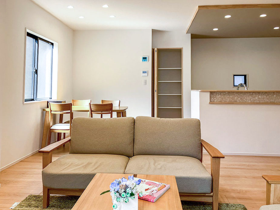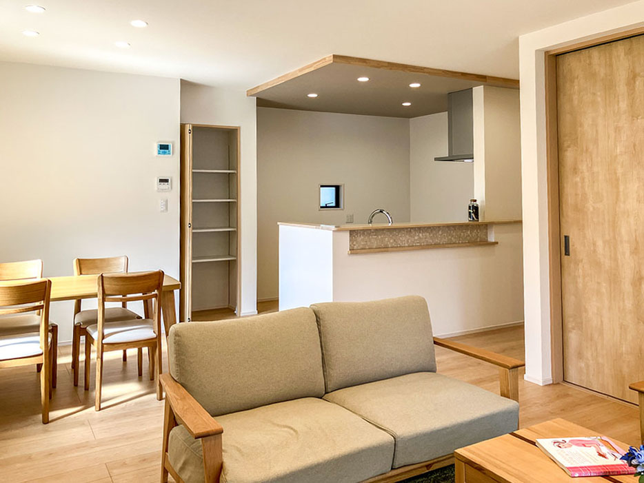 システムキッチンのすぐそばに配置したパントリー。ストック食品や調味料やお酒のほか、非常食や水のペットボトルなどの防災用品も収納できます。キッチンからすぐ手が届く場所にあるから、整理整頓もテキパキできて、キッチン空間をスッキリ保てます。