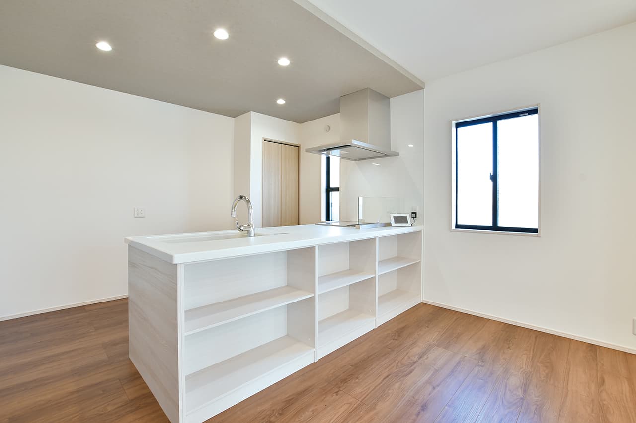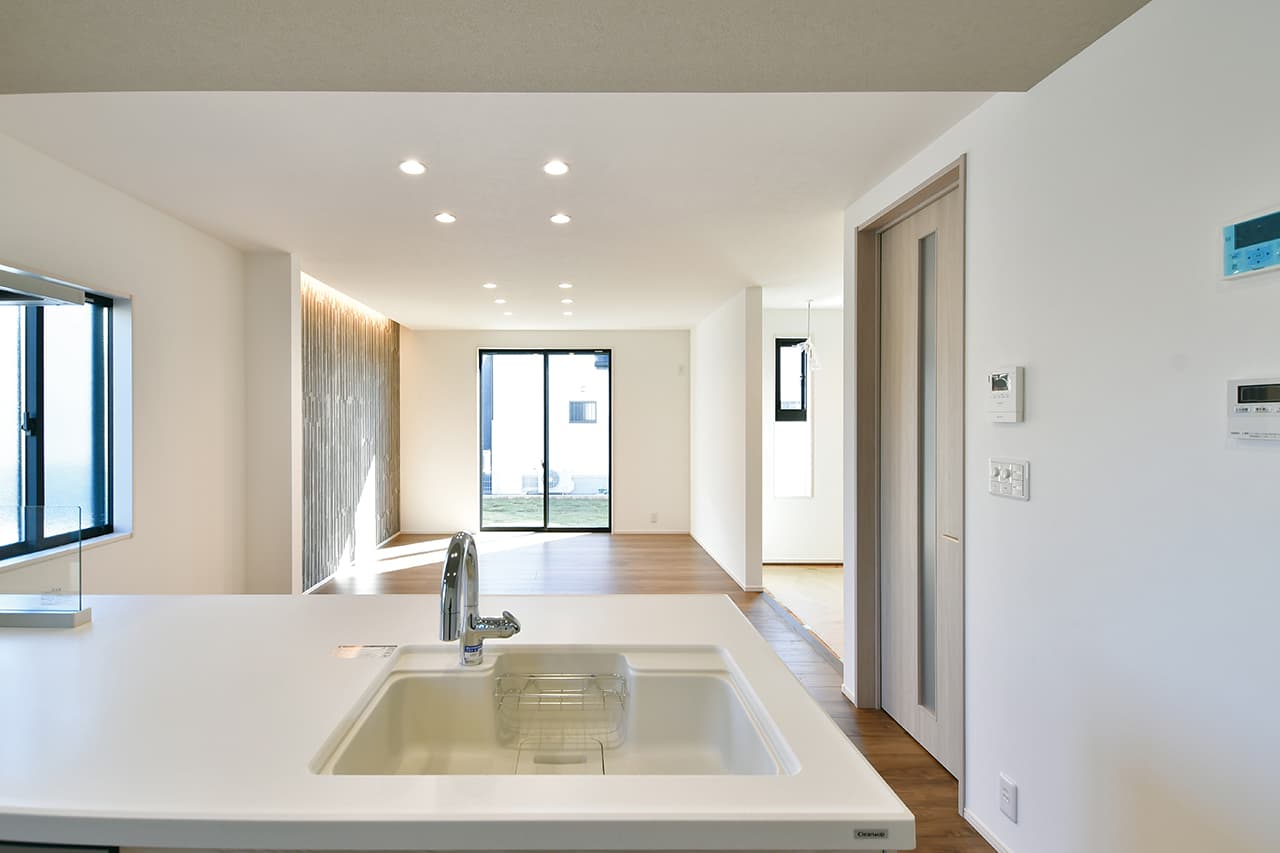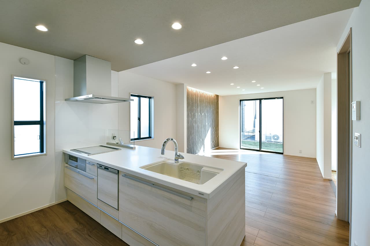 LDK空間の広さをより実感できるオープンキッチン。開放的で目線を遮るものがなくコミュニケーションが取りやすいため、料理をしながらの会話も弾み、お手伝いにも気軽に参加できます。