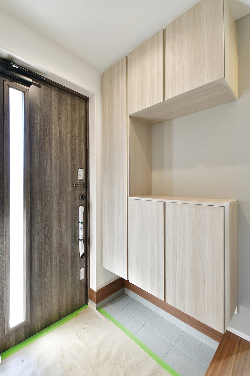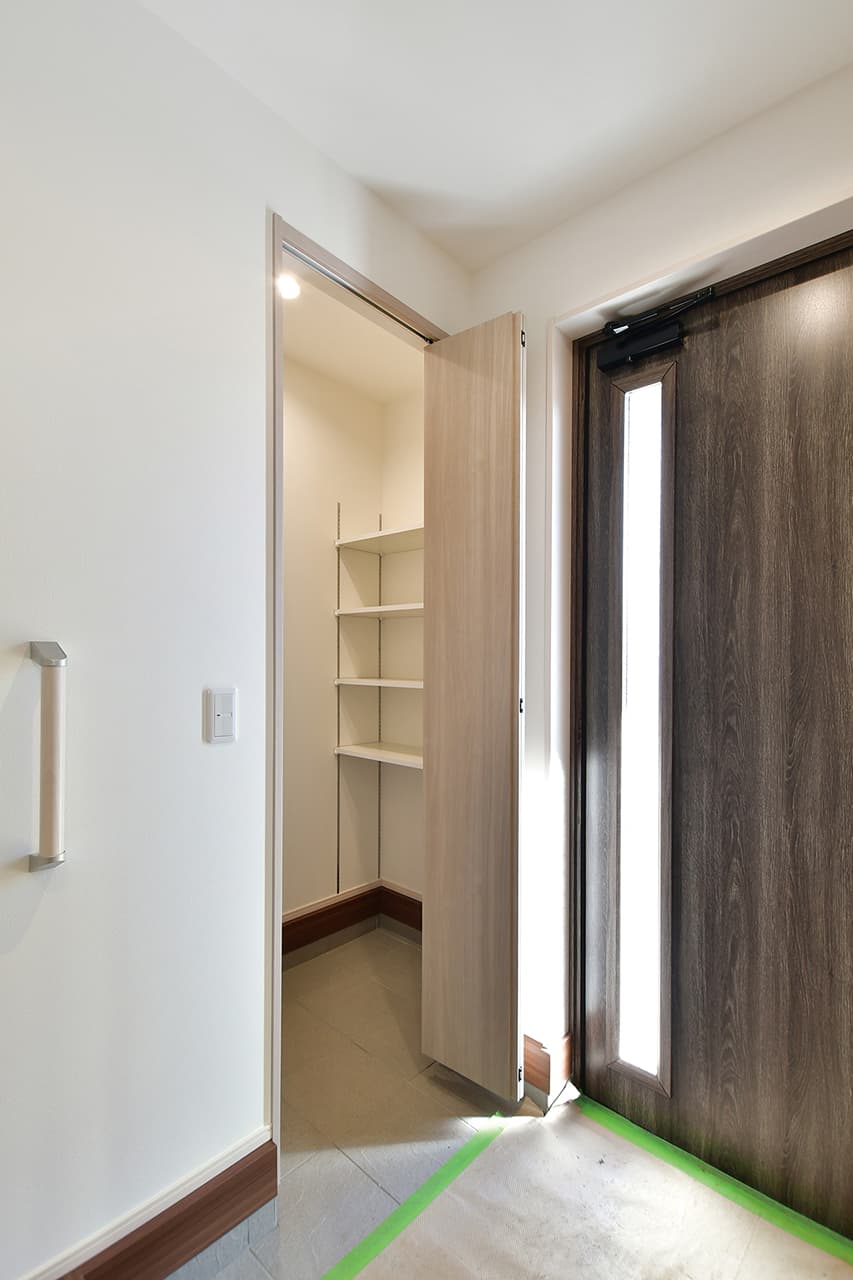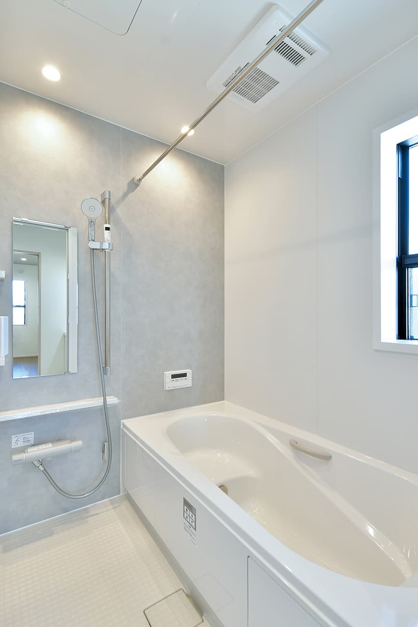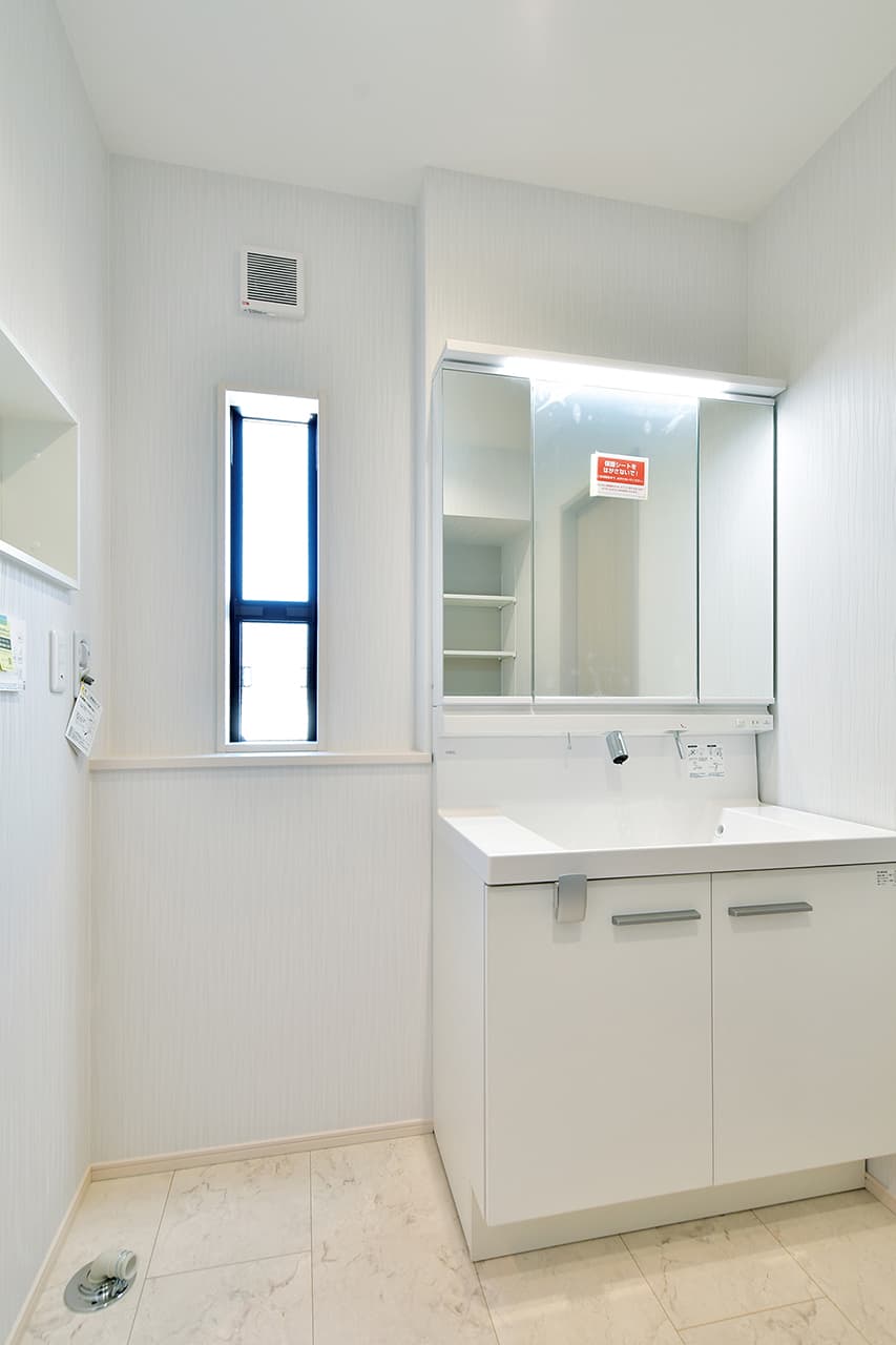 キッチンから洗面室・浴室までを最短距離で結んだ水回り動線設計。家事の移動距離を短縮するとともに、動線上には収納スペースなどをレイアウトし機能性も高めました。スマートな動線設計と時短設備が子育てにがんばるご家族をサポートします。