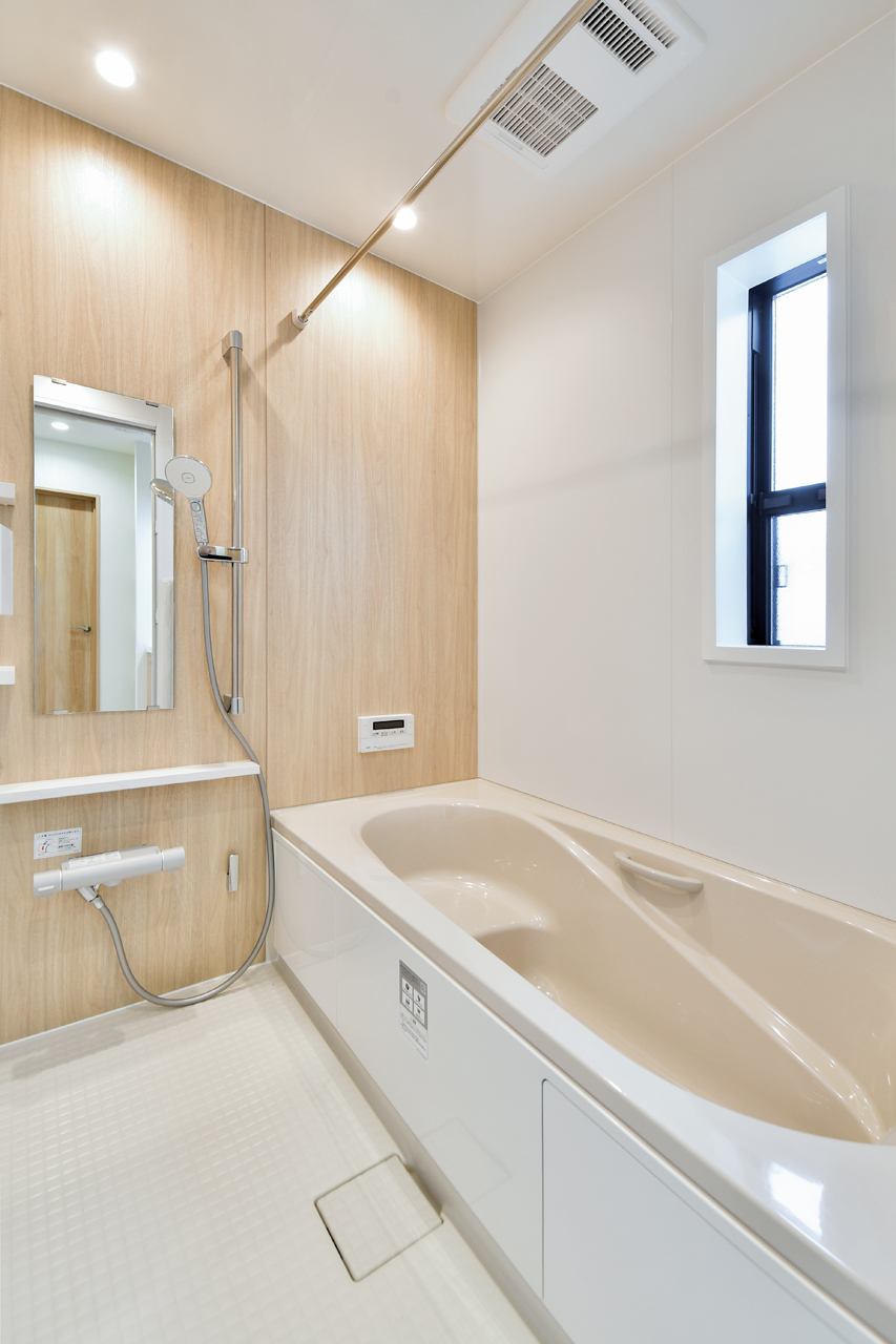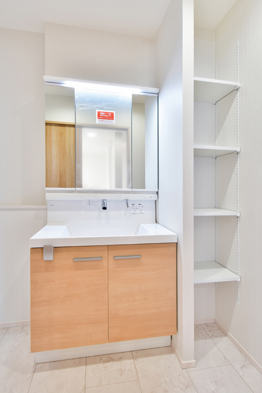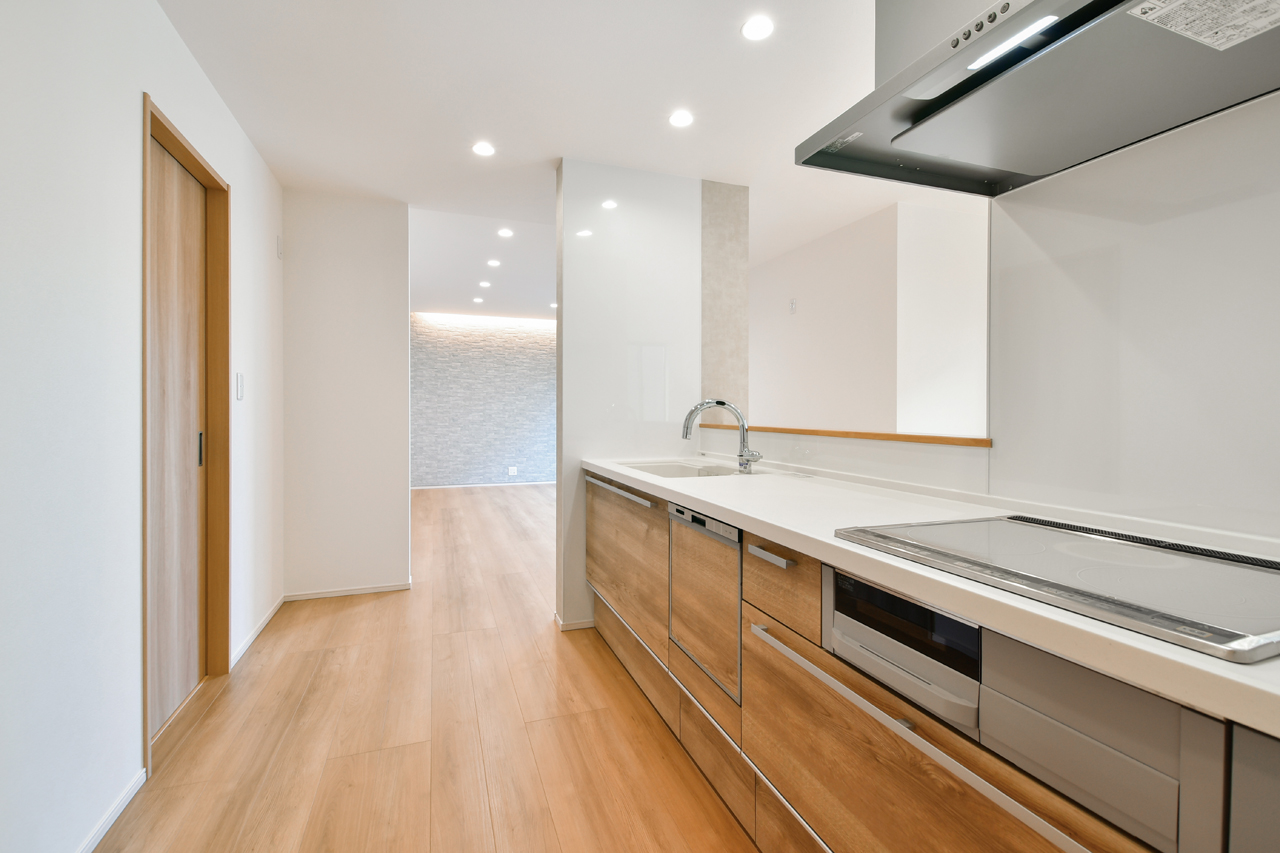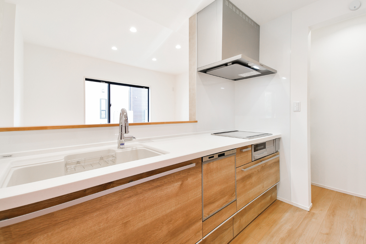 キッチンから洗面室・浴室までを最短距離で結んだ水回り動線設計。家事の移動距離を短縮するとともに、動線上には収納スペースなどをレイアウトし機能性も高めました。スマートな動線設計と時短設備が子育てにがんばるご家族をサポートします。