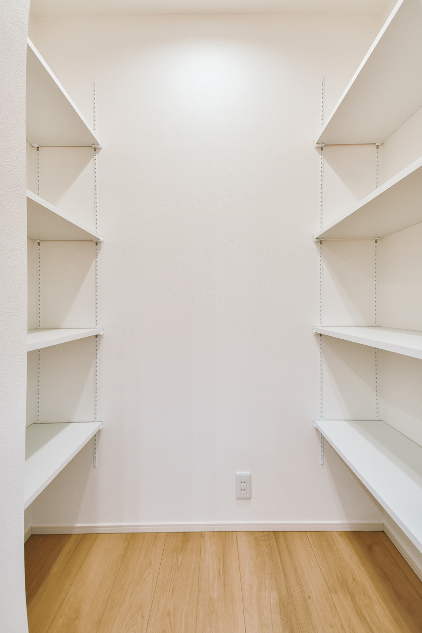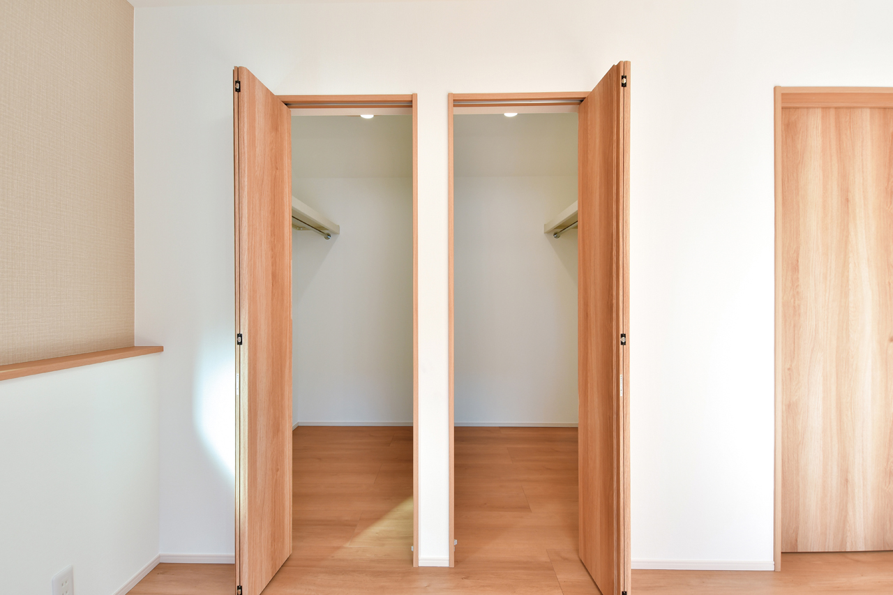 ご夫婦や子ども達の衣類をたっぷりしまえる大容量のウォークインクローゼット。季節の衣類から鞄や帽子などの小物までたっぷり保管可能。ウォークインタイプなので衣類の出し入れや整理整頓もスムーズに行えます。