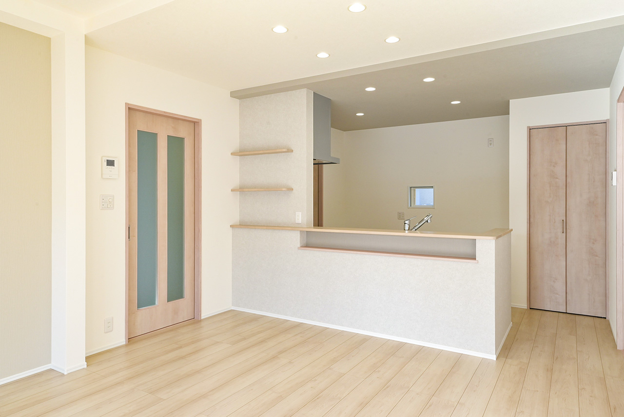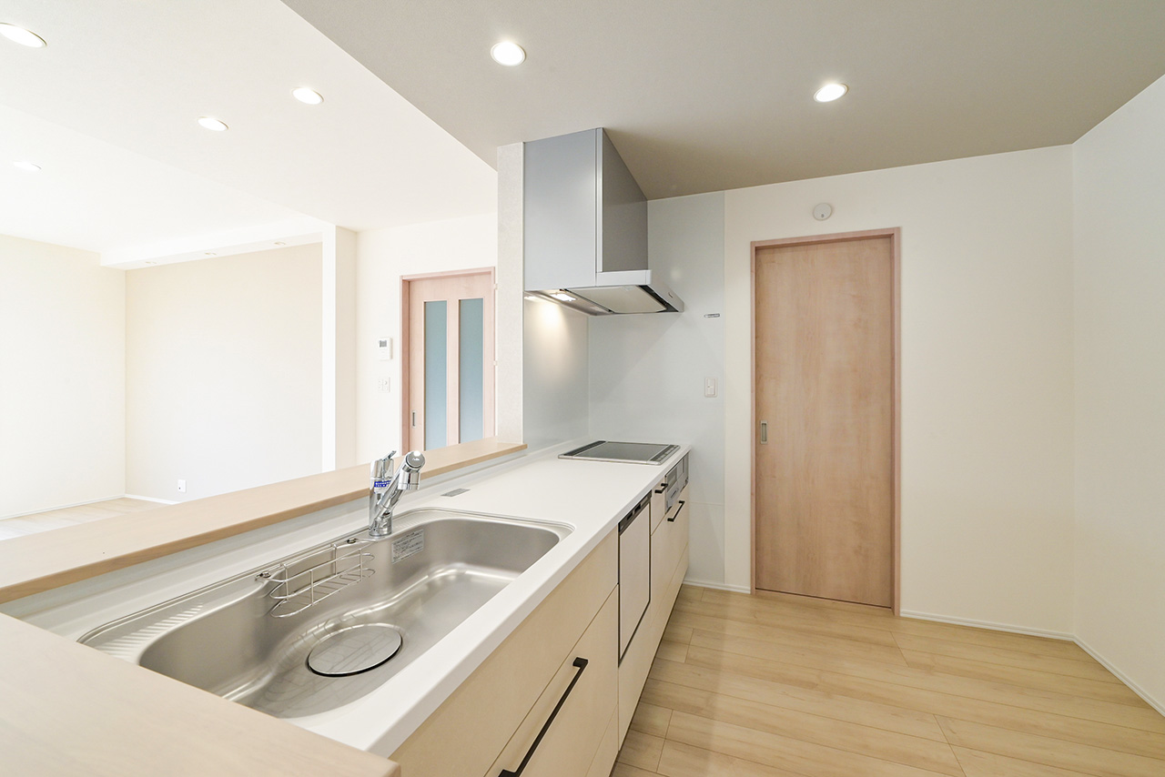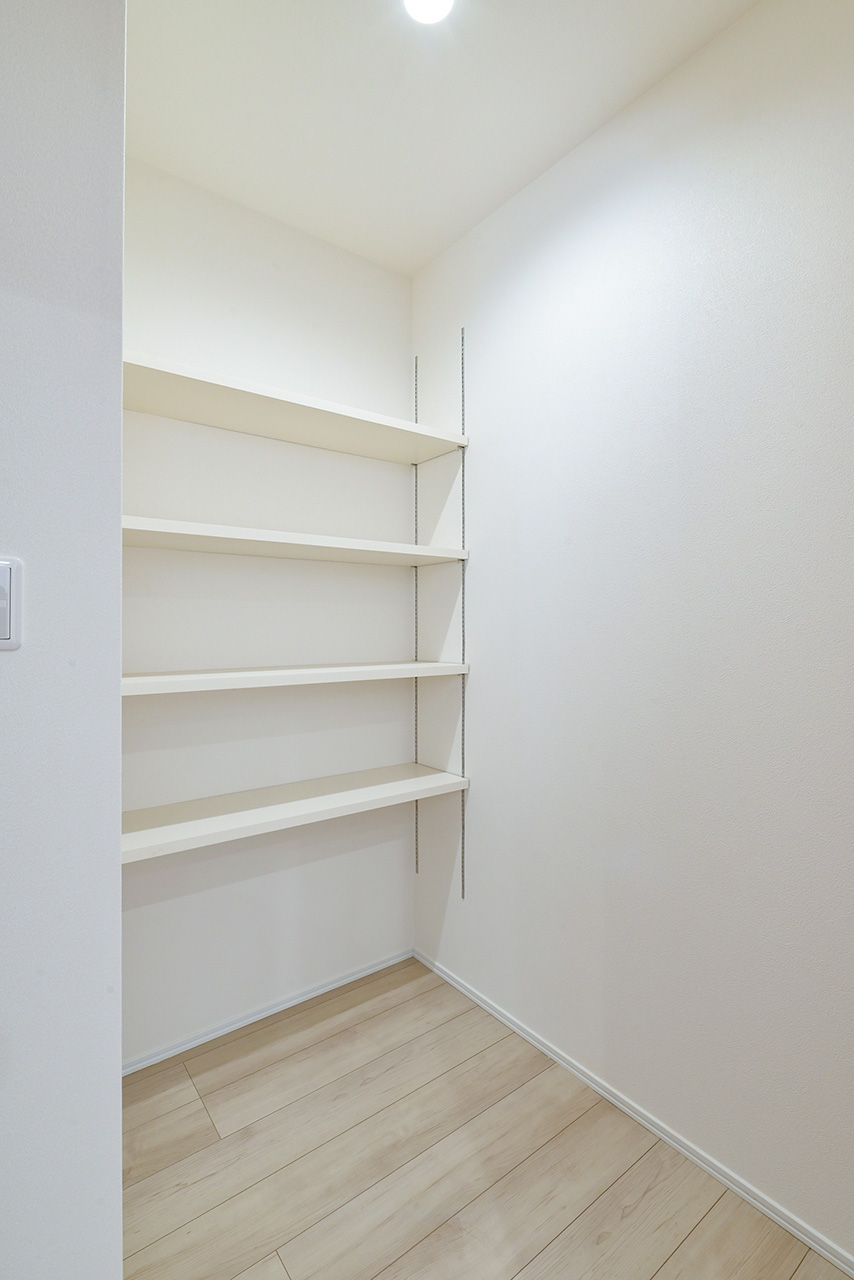 システムキッチンのすぐそばに配置したパントリー。ストック食品や調味料やお酒のほか、非常食や水のペットボトルなどの防災用品も収納できます。キッチンからすぐ手が届く場所にあるから、整理整頓もテキパキできて、キッチン空間をスッキリ保てます。