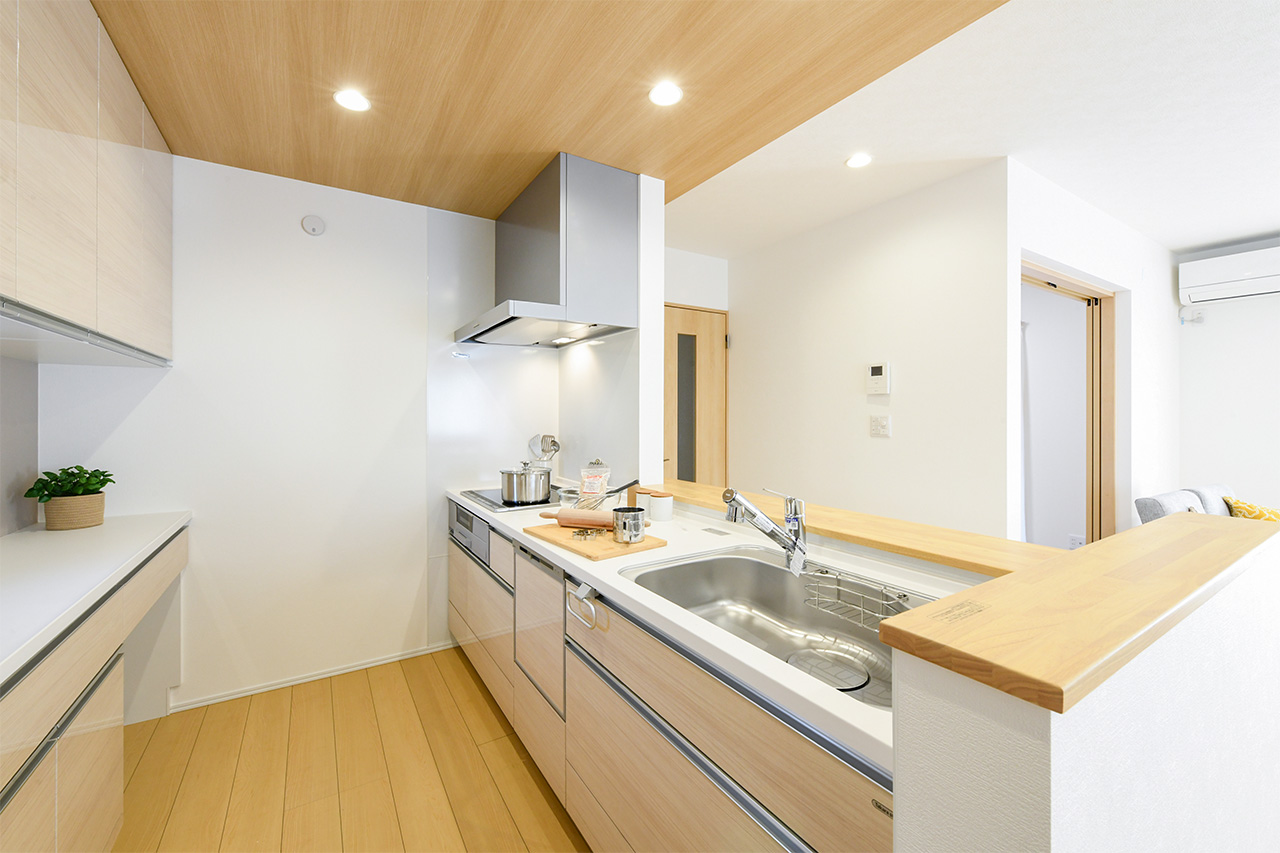 家族でのコミュニケーションがとれる対面型システムキッチン。横一列にシンクとコンロをまとめたシンプルな形です。動きやすさとスタイリッシュなデザインが魅力。