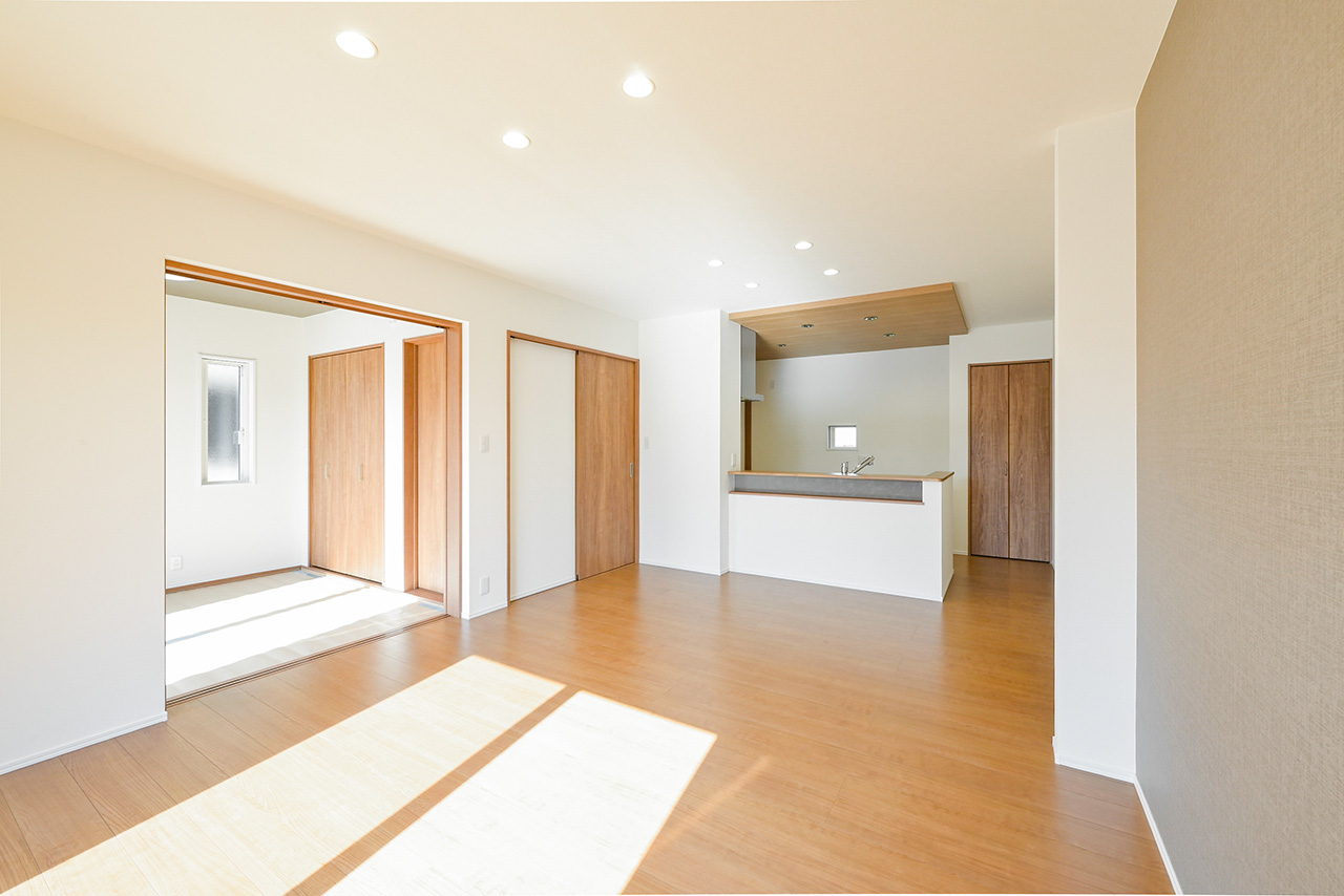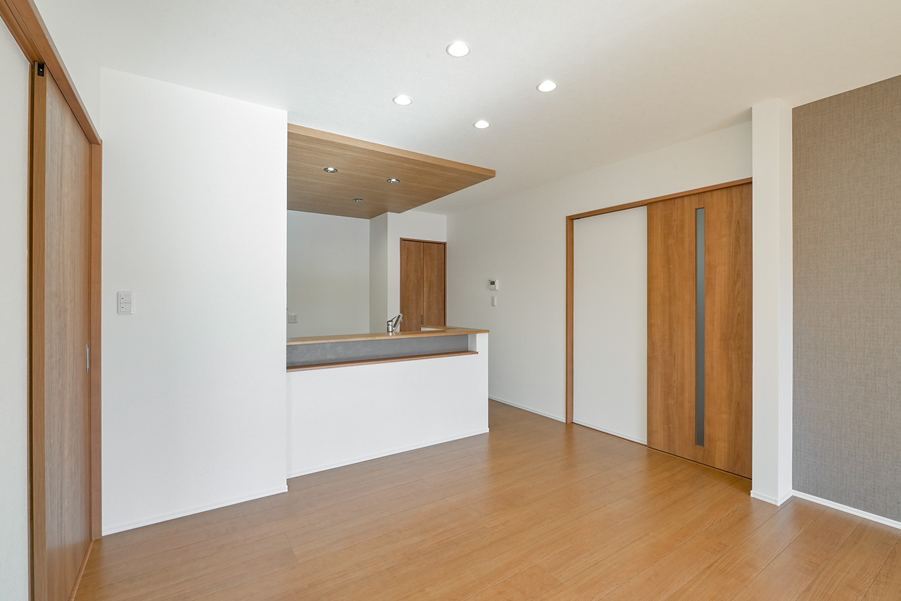 キッチンから洗面室・浴室までを最短距離で結んだ水回り動線設計。家事の移動距離を短縮するとともに、動線上には収納スペースなどをレイアウトし機能性も高めました。スマートな動線設計と時短設備が子育てにがんばるご家族をサポートします。