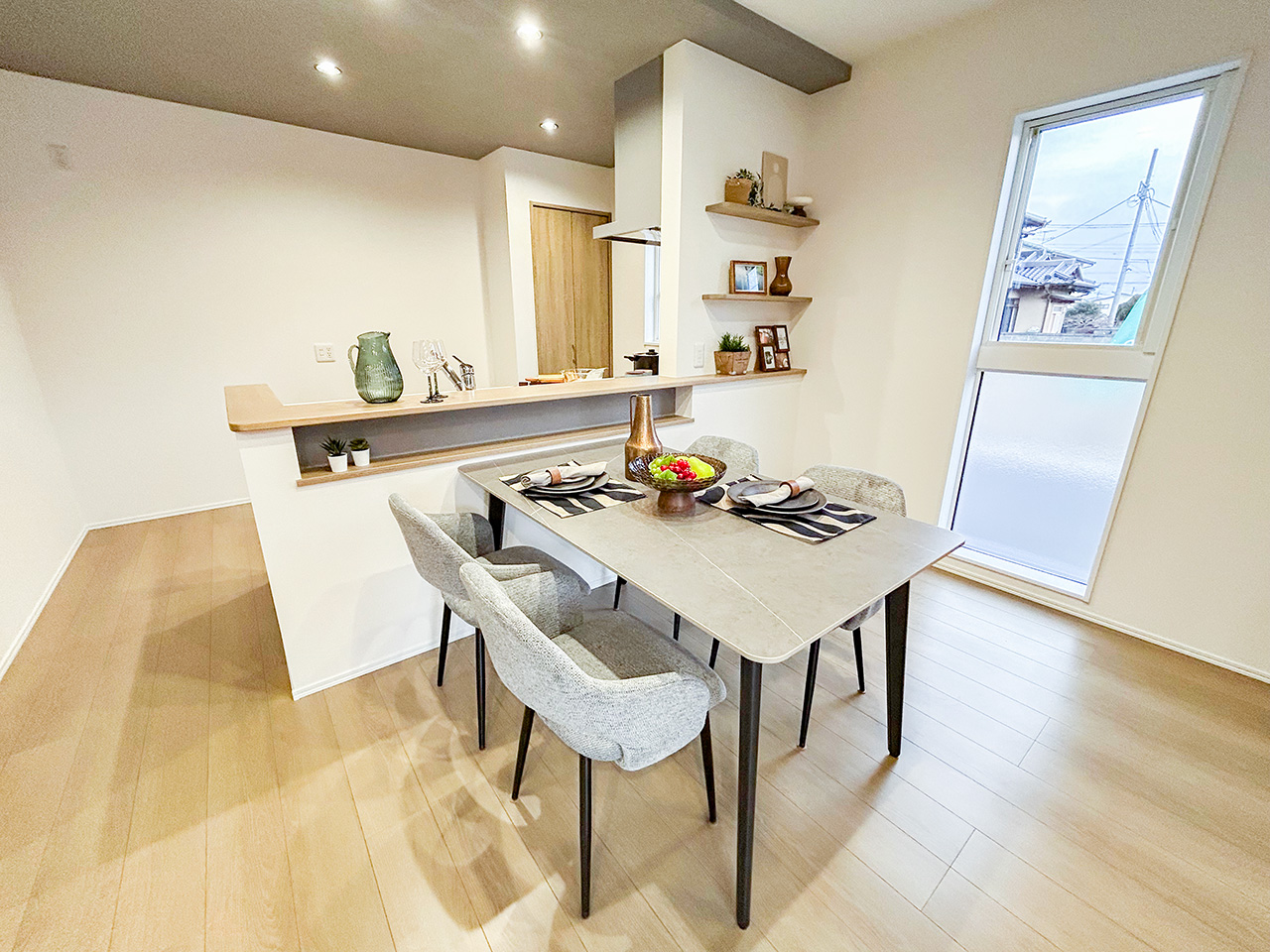 2階へ向かう際に、自然とリビングを通るよう設計された「リビングアクセス階段」。2階のプライベートな空間とパブリックなLDKを程よい距離感で結び、親子のコミュニケーションを優しく後押しします。