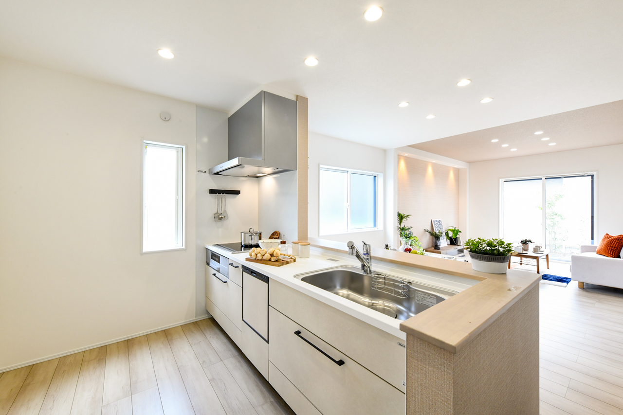 家族でのコミュニケーションがとれる対面型システムキッチン。横一列にシンクとコンロをまとめたシンプルな形です。動きやすさとスタイリッシュなデザインが魅力。