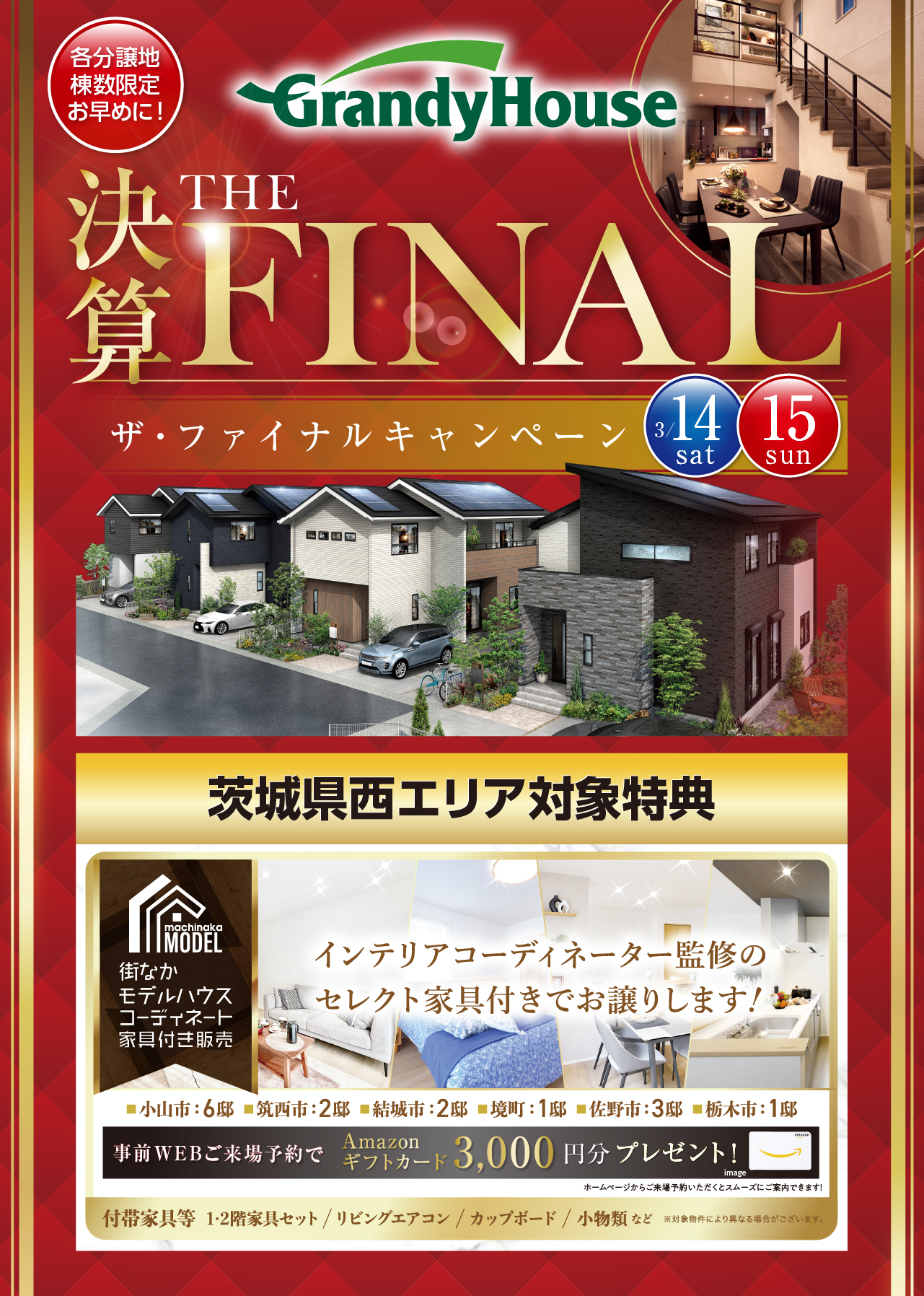 2026決算ザ・ファイナル【茨城県西】 8件の分譲地、27件のプランが見つかりました。 〈ご来場プレゼント〉2026年3月22日(日)までに下記掲載のいずれかの会場へお越しください。〈WEBご来場予約プレゼント〉2026年3月22日(日)までに当社ホームページより対象の会場へご来場予約いただいた方が対象。※WEBご来場予約プレゼントはグランディハウス(株)による提供です。本キャンペーンについてのお問い合わせはAmazonではお受けしておりません。グランディハウス事務局ad@grandy.co.jpまでお願いします。Amazon、Amazon.co.jpおよびそのロゴはAmazon.com.inc.またはその関連会社の商標です。〈ご来場プレゼント〉〈WEBご来場予約プレゼント〉とも、アンケートにご回答いただいた、グランディハウスの分譲地を初めてご見学された、住宅購入予定のある新規のご家族が対象。※プレゼント金券は授受トラブル防止のため手渡しのみとします。郵送または投函でのお渡しは行いません。※数に限りがありますので各プレゼントは1家族1回となります。※商品が無くなり次第終了となります。内容が変更となる場合がありますので予めご了承ください。〈ご成約プレゼント〉紙面に掲載の3月末までにお引き渡し可能な対象物件を2026年3月22日(日)までにご成約いただいたお客様が対象。※対象号棟は分譲地により異なります。※商品は当社指定品からお選びいただけます。※ご成約後に解約された場合は本プレゼントの適用対象外となります。※価格改定物件は対象外です。※各プレゼントともその他のサービスとの併用不可。※画像はイメージです。※詳しくは当社スタッフにお尋ねください。 エリア絞込: すべて 古河市 結城市 筑西市 猿島郡境町 すべての物件にチェックを入れる すべてチェック 物件をくらべる まとめて資料請求する 0件の分譲地 物件をくらべる(5件まで) まとめて資料請求する(5件まで) 古河市 女沼 ソラタウン古河市女沼11期 お気に入り登録人数4人 販売戸数: 2戸 販売価格: 3,300万円 (税込) 【長期優良住宅×K3制震ダンパー】 全棟太陽光搭載、「下辺見小学校」まで徒歩10分の好立地物件! ◆「下辺見小学校」まで徒歩10分 ◆長期優良住宅認定 ✕ K3制震ダンパー採用 ◆オール電化&ZEH+おひさまエコキュート採用の住まい 来場予約 資料請求(無料) 電話相談 お問い合わせ グランディハウス 古河支店 古河市古河517番6 0120485566(発信する) 閉じる 分譲地詳細を見る 結城市 逆井 グランエクセラ結城市逆井6期 お気に入り登録人数人 販売戸数: 6戸 販売価格: 2,688万円 (税込) 〜 1〜3・5号棟|子育てグリーン対象物件 【長期優良住宅 ✕ 制震ダンパー搭載】 「アクロスプラザ結城」徒歩9分、生活利便に優れた立地 ◆区画整理地内に誕生する全8邸 ◆子育て世帯を応援する、家族に寄り添ったスマートプラン ◆ZEH水準の断熱・省エネ性能 × オール電化 来場予約 資料請求(無料) 電話相談 お問い合わせ グランディハウス 筑西支店 筑西市乙385-1 0120036566(発信する) 閉じる 分譲地詳細を見る 新着 筑西市 市野辺 グランエクセラ筑西市市野辺4期 お気に入り登録人数人 販売戸数: 4戸 販売価格: 2,950万円 (税込) 〜 12・13号棟|子育てグリーン対象物件 【60年サポート×長期優良住宅×耐震ダンパー搭載】 全棟8か所以上の収納を採用 ◆長期優良住宅認定 ✕ K3制震ダンパー採用 ◆竹島小学校まで徒歩3分 ◆ヨークベニマルや道の駅も身近な利便性の高い住環境 ◆通り抜けのできない、街区内専用道路でつながる街並み 来場予約 資料請求(無料) 電話相談 お問い合わせ グランディハウス 筑西支店 筑西市乙385-1 0120036566(発信する) 閉じる 分譲地詳細を見る 猿島郡境町 陽光台1丁目 グランエクセラ境町陽光台1丁目5期 お気に入り登録人数人 販売戸数: 1戸 販売価格: 3,420万円 (税込) 3号棟|子育てグリーン対象物件 【長期優良住宅 × ZEH水準断熱 × オール電化】 子育て支援充実の「境町」&家事楽プラン ◆子育て支援が充実、生活利便も良好な茨城県境町 ◆国道354号線沿いの「サカイモール」まで車6分※実測 ◆ショッピング施設のほか、全天候型の公園などが近隣に充実 ◆圏央道「境古河IC」にも近く、各方面のアクセスも快適 ◆ZEH水準の断熱・省エネ性能×オール電化の住まい 来場予約 資料請求(無料) 電話相談 お問い合わせ グランディハウス 古河支店 古河市古河517番6 0120485566(発信する) 閉じる 分譲地詳細を見る モデルハウス 結城市 結城 グランクレスト結城市結城3期 お気に入り登録人数人 販売戸数: 1戸 販売価格: 3,015万円 (税込) 1号棟|子育てグリーン対象物件 【家具付き販売×60年サポート×長期優良住宅】 全棟南向きでゆったり駐車 ◆長期優良住宅認定 ✕ K3制震ダンパー採用 ◆陽当たり良好!敷地面積65坪超の全7邸 ◆クスリのアオキ 徒歩1〜2分|ヨークタウン・アクロスプラザ結城 車で5分 ◆ZEH水準の断熱・省エネ性能×オール電化の住まい 来場予約 資料請求(無料) 電話相談 お問い合わせ グランディハウス 筑西支店 筑西市乙385-1 0120036566(発信する) 閉じる 分譲地詳