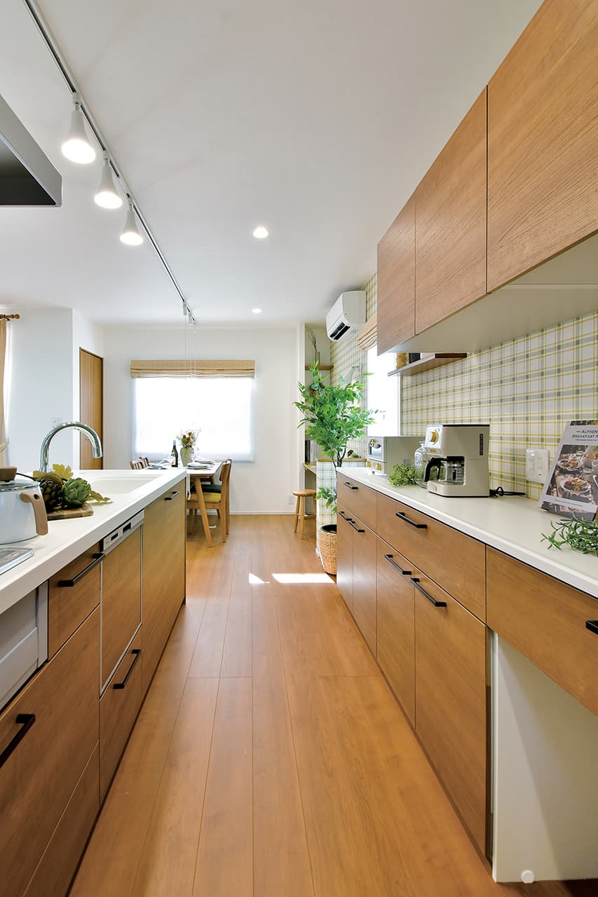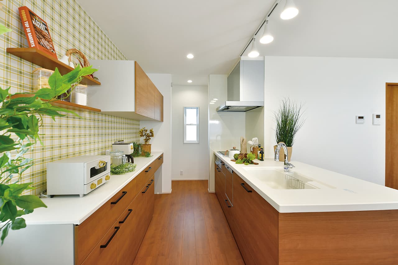 家族でのコミュニケーションがとれる対面型システムキッチンです。横一列にシンクとコンロをまとめたシンプルな形です。動きやすさとスタイリッシュなデザインが魅力です。