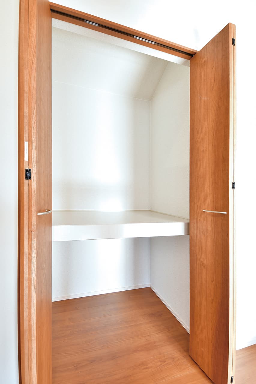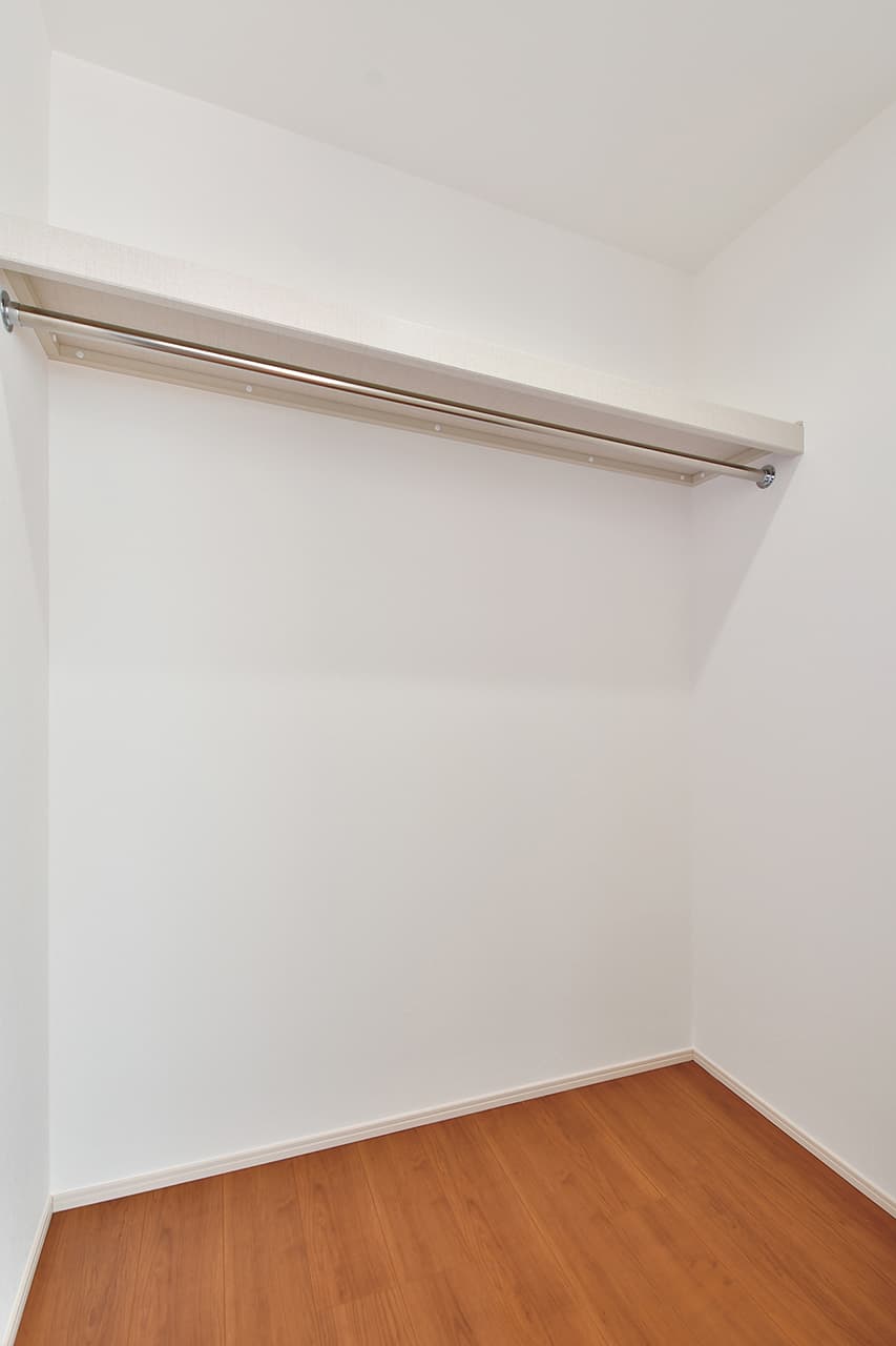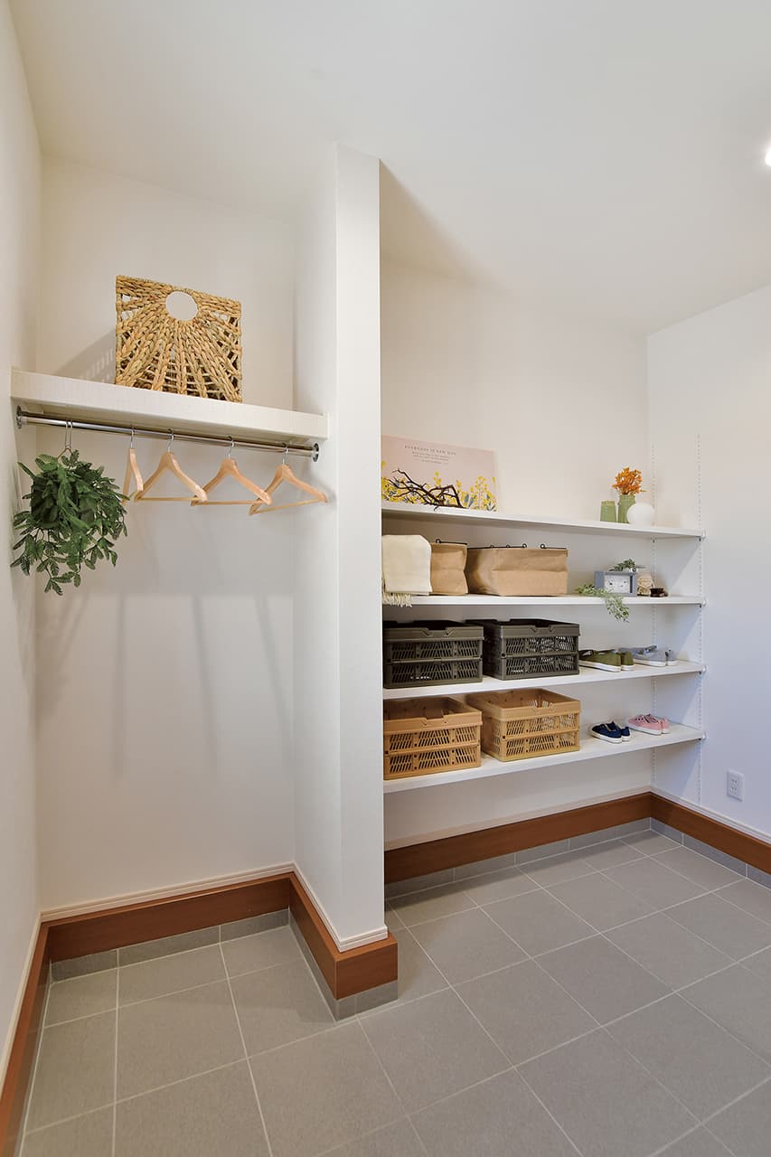 玄関ホールのそばに設けたクローゼットスペース。お出かけ用の上着やコート、レインウェアをはじめ、帽子や鞄などをまとめて収納できます。居住空間への花粉やウイルスなどの持ち込みを低減し、子ども達のお片付け習慣も自然と身につきます。
