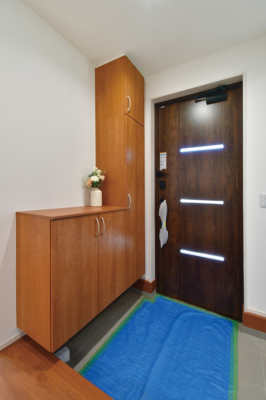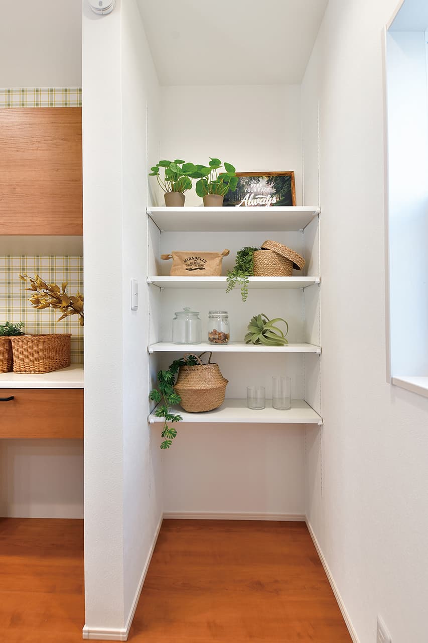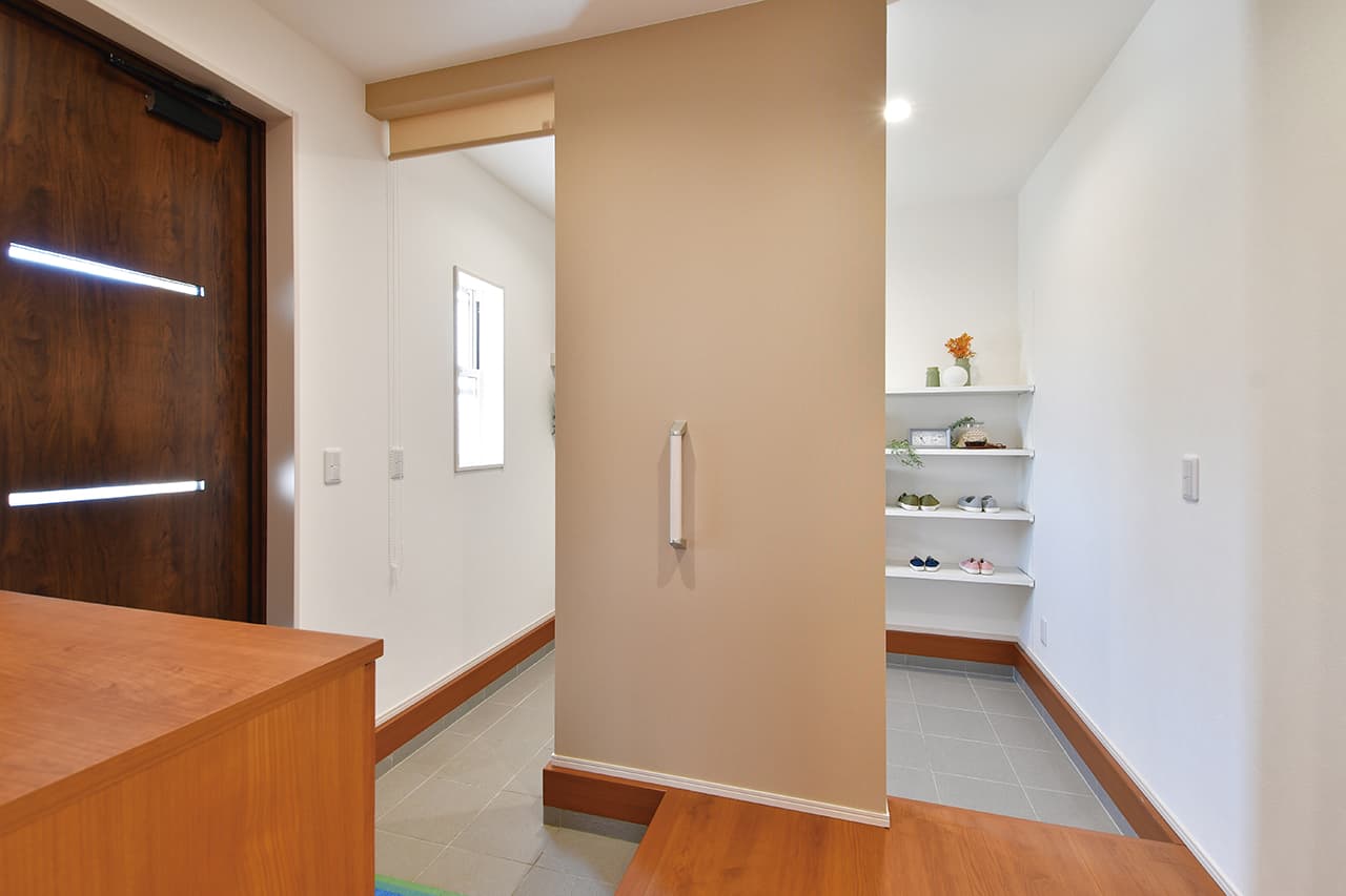 玄関ホールのそばに設けたクローゼットスペース。お出かけ用の上着やコート、レインウェアをはじめ、帽子や鞄などをまとめて収納できます。居住空間への花粉やウイルスなどの持ち込みを低減し、子ども達のお片付け習慣も自然と身につきます。