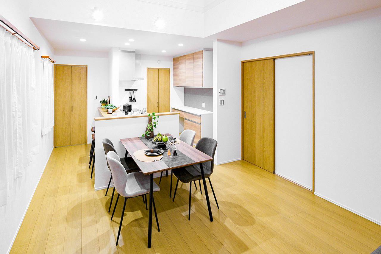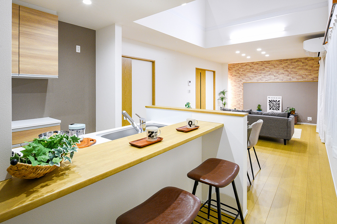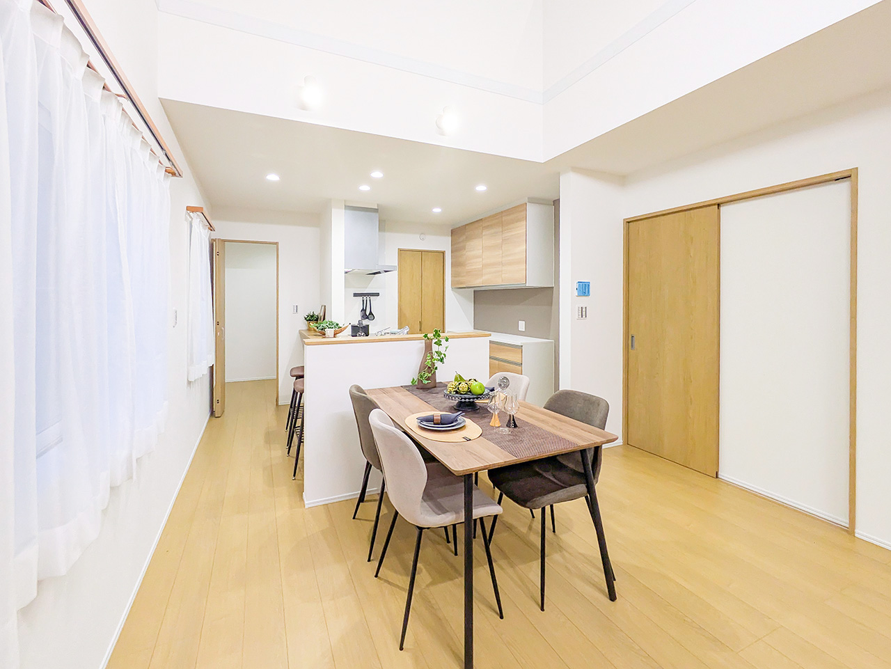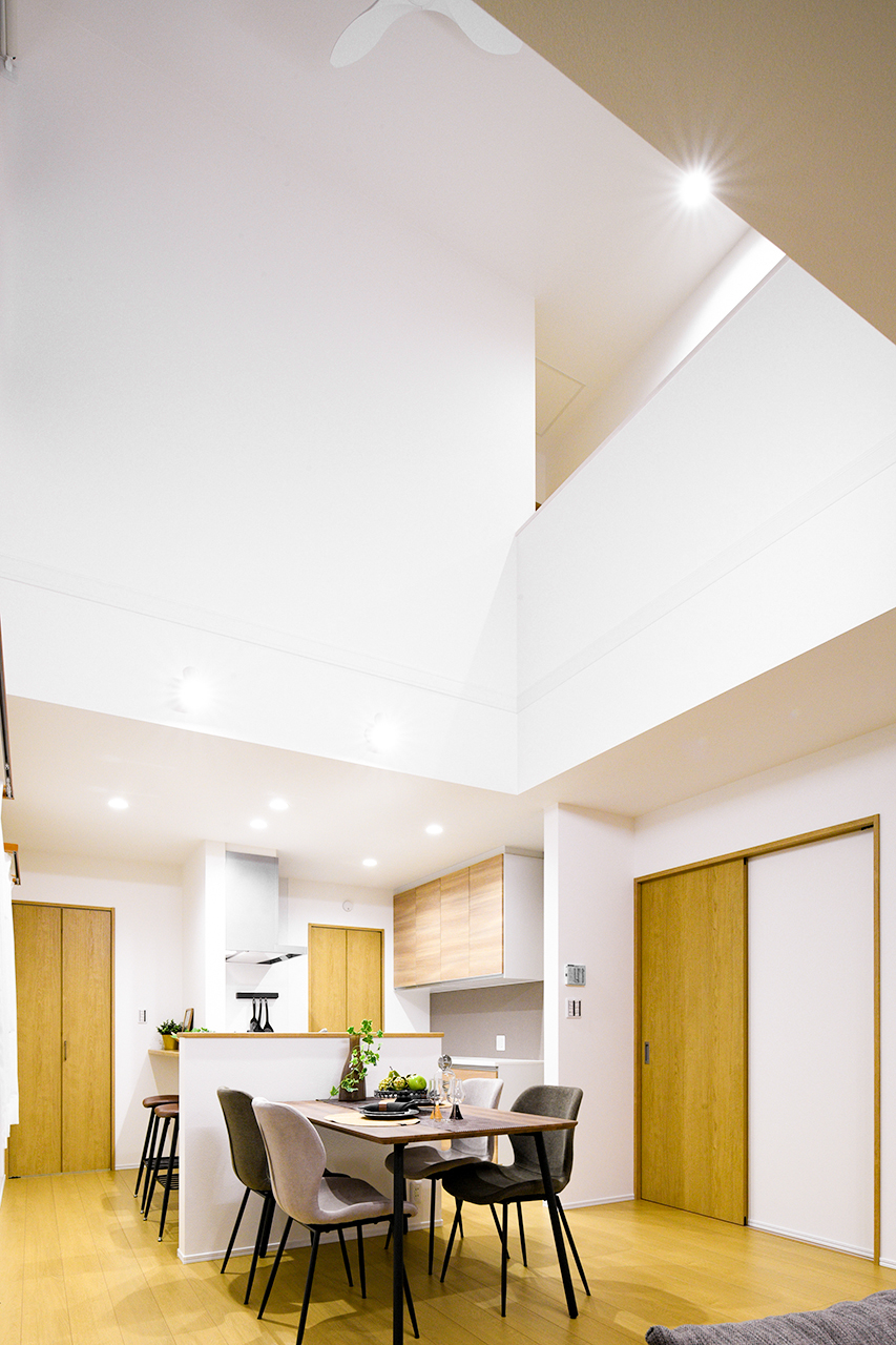 ご家族の団らんや寛ぎの中心となるリビング空間をさらに際立たせる吹抜け天井プラン。2階天井まで続くその圧倒的な存在感と広がりが訪れた方を驚きを持ってお迎えします。大切にしたいご家族やゲストをもてなす上質な空間です。
