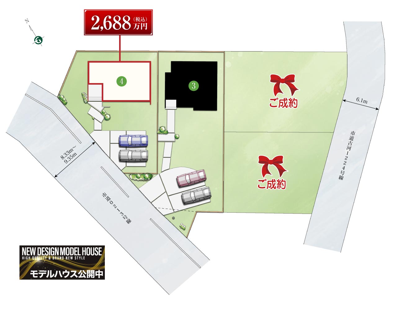 | 備考2 | ※各号地の上空を電線が通過します。 ※掲載の図面は計画段階の図面を基に描き起こしたもので、実際とは異なる場合がございます。また、施工上の理由及び改良のため変更することがございます。 ※価格改定/4号棟[公示日:2025年10月15日] ※[お支払いシミュレーション4号地の場合] 頭金0円、足利銀行(3年固定金利0.575%・40年)で2,688万円借入。 月々62,700円(元本2,688万円)。 金利等は2025年10月現在のものです。諸経費は別途となります。 |