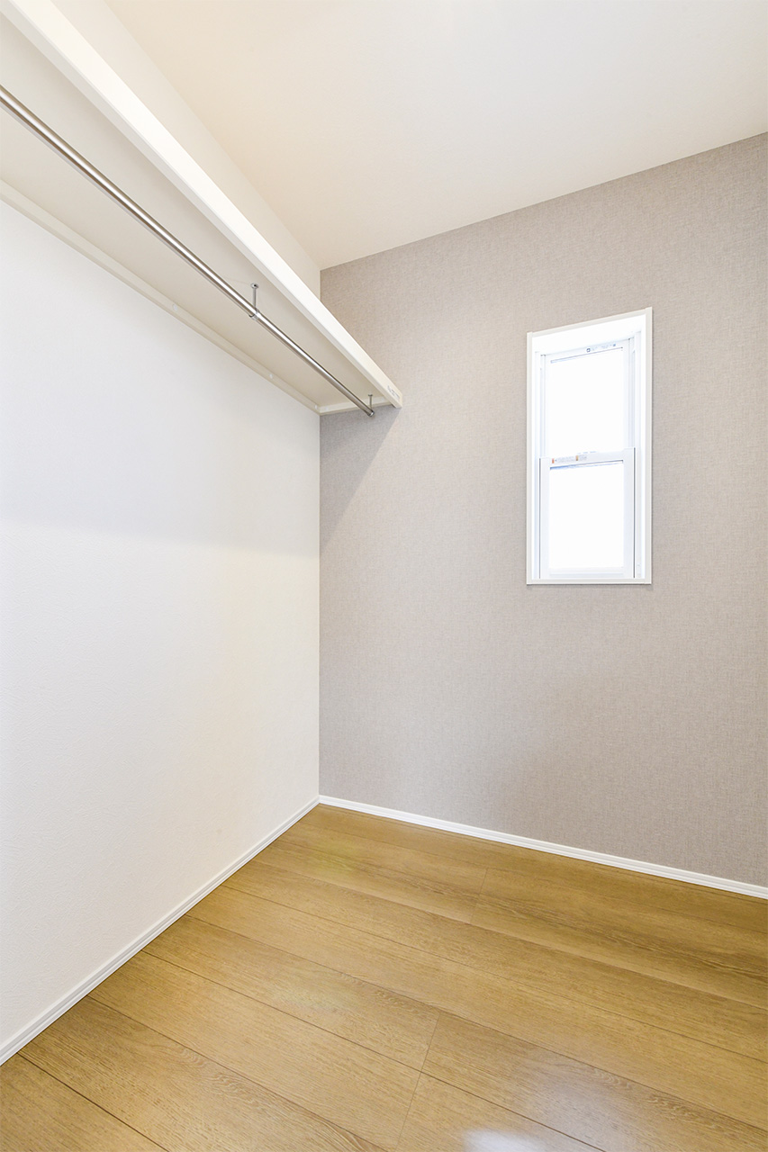 ご夫婦や子ども達の衣類をたっぷりしまえる大容量のウォークインクローゼット。季節の衣類から鞄や帽子などの小物までたっぷり保管可能。ウォークインタイプなので衣類の出し入れや整理整頓もスムーズに行えます。