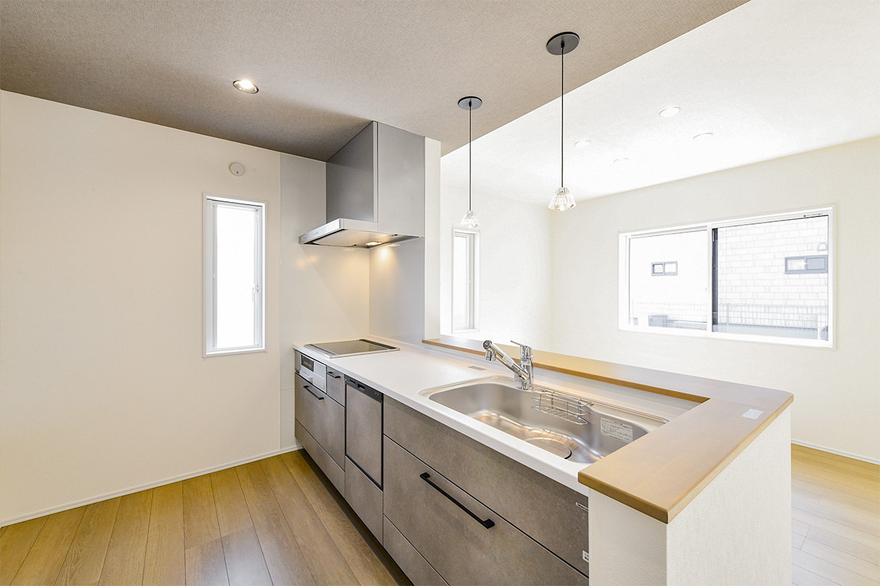システムキッチンのすぐそばに配置したパントリー。ストック食品や調味料やお酒のほか、非常食や水のペットボトルなどの防災用品も収納できます。キッチンからすぐ手が届く場所にあるから、整理整頓もテキパキできて、キッチン空間をスッキリ保てます。