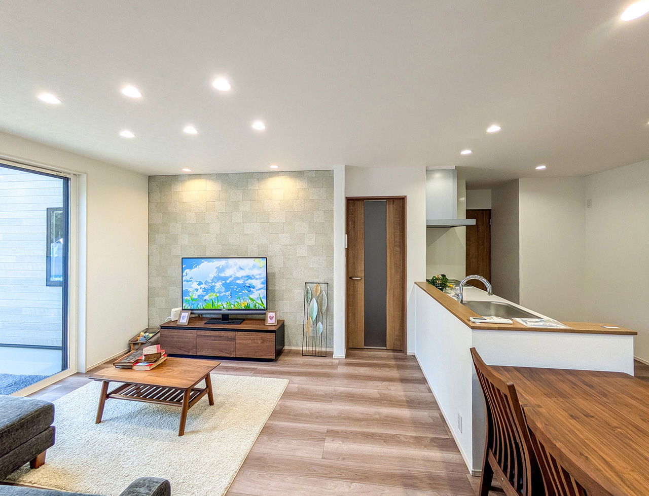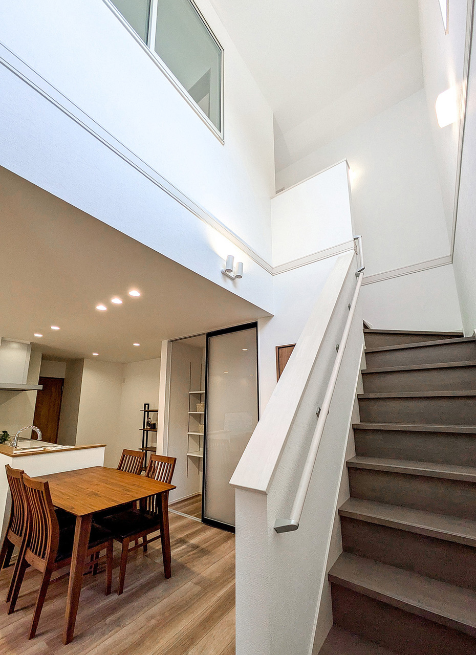 ご家族の団らんや寛ぎの中心となるリビング空間をさらに際立たせる吹抜天井プラン。2階天井まで続くその圧倒的な存在感と広がりが訪れた方を驚きを持ってお迎えします。大切にしたいご家族やゲストをもてなす上質な空間です。
