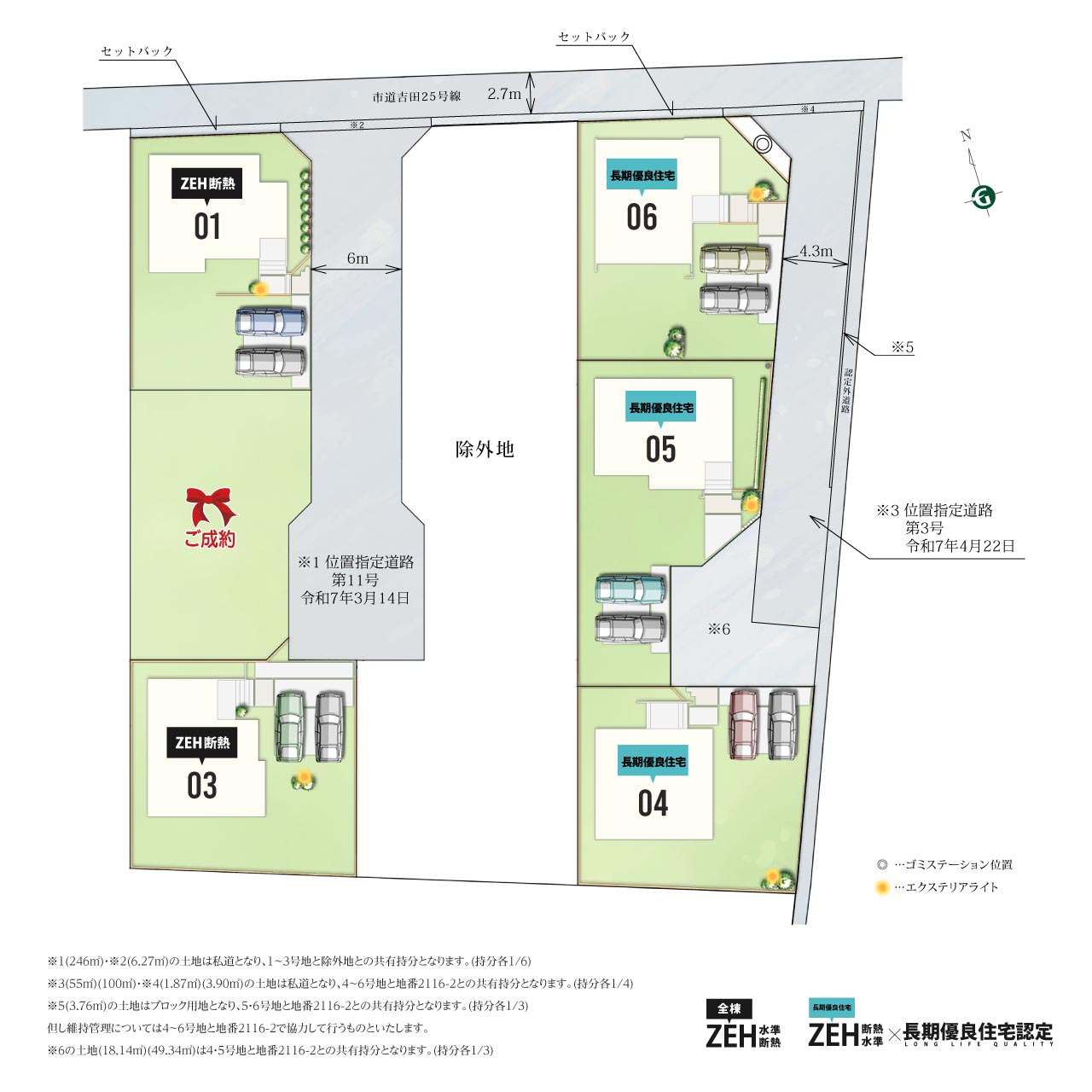 | 備考2 | ※各号地の上空を電線が通過します。 ※掲載の図面は計画段階の図面を基に描き起こしたもので、実際とは異なる場合がございます。また、施工上の理由及び改良のため変更することがございます。 ※その他共有持分/有 「販売区画図※5:3.76㎡持分各1/3(5、6号地及び地番2116-2)」 「販売区画図※6:18.14㎡・49.34㎡持分各1/3(4、5号地及び地番2116-2)」 |