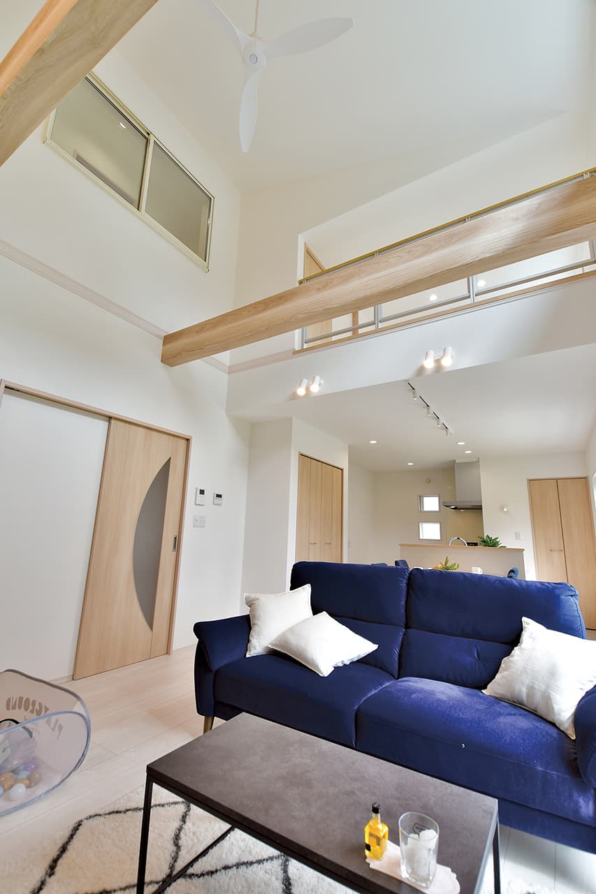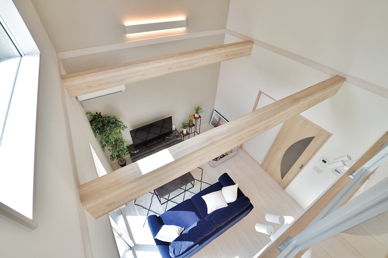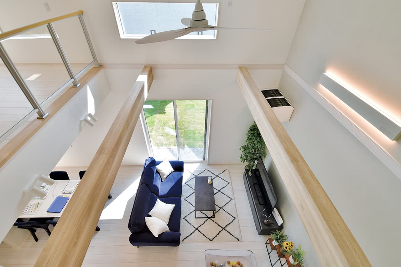 ご家族の団らんや寛ぎの中心となるリビング空間をさらに際立たせる吹抜け天井プラン。2階天井まで続くその圧倒的な存在感と広がりが訪れた方を驚きを持ってお迎えします。大切にしたいご家族やゲストをもてなす上質な空間です。