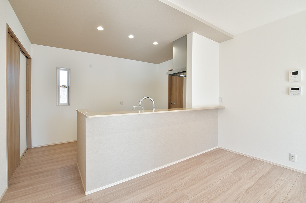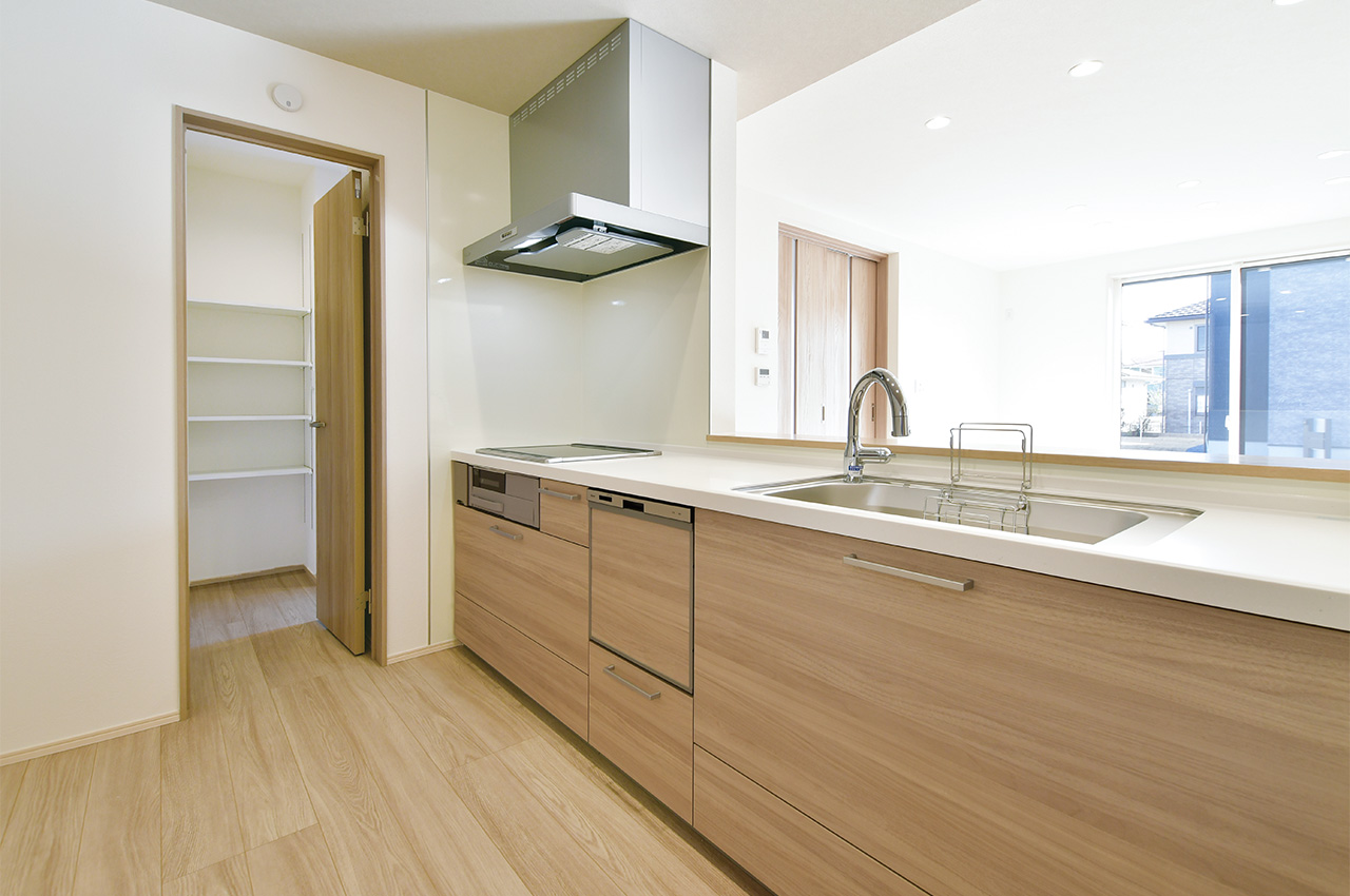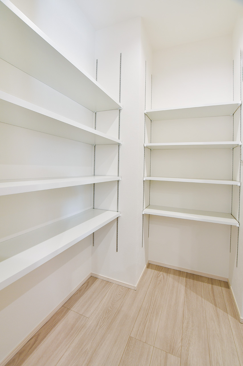 システムキッチンのすぐそばに配置したパントリー。ストック食品や調味料やお酒のほか、非常食や水のペットボトルなどの防災用品も収納できます。キッチンからすぐ手が届く場所にあるから、整理整頓もテキパキできて、キッチン空間をスッキリ保てます。