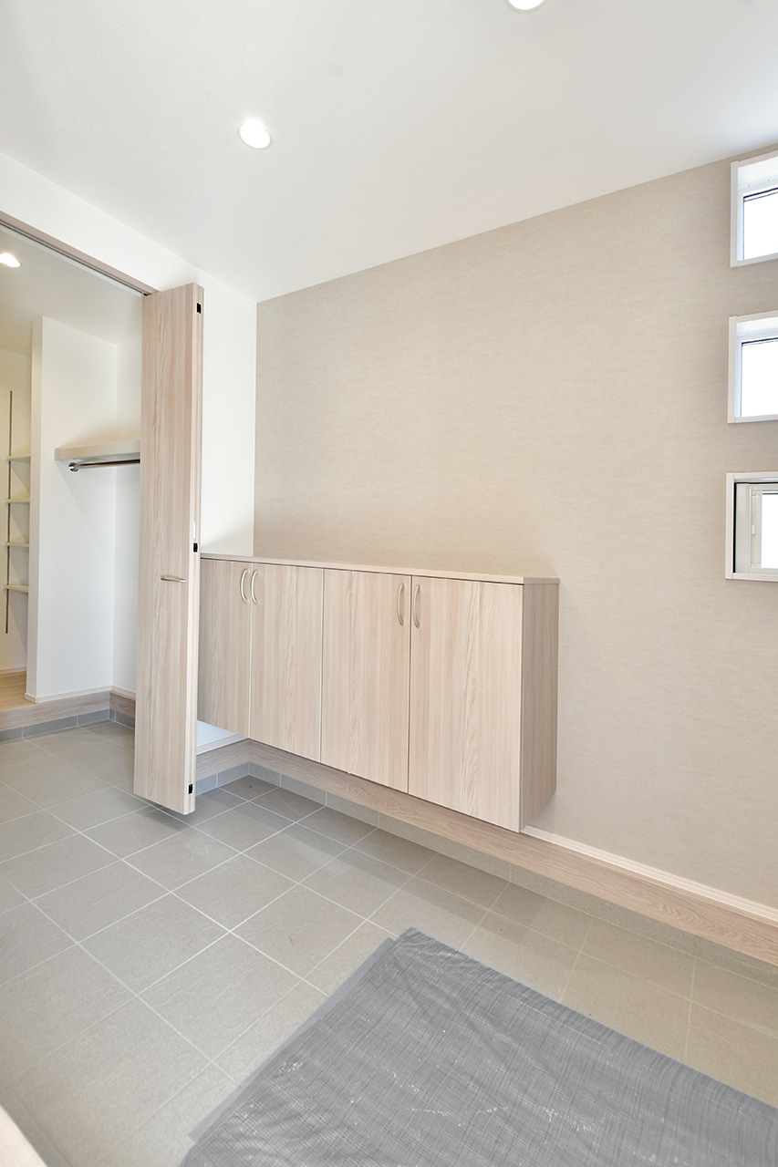家族の分だけ必要な靴や傘は、玄関を我が物顔で占領しがちなアイテム。靴のまま出入りできるシューズクロークなら外で使う物もしっかり収納!また、玄関先は防災グッズの収納にも最適。もしもの時もすぐに持ち出すことが出来ます。