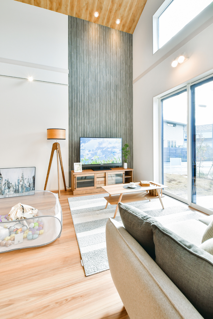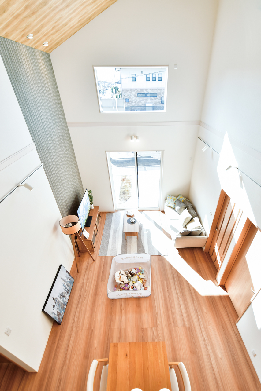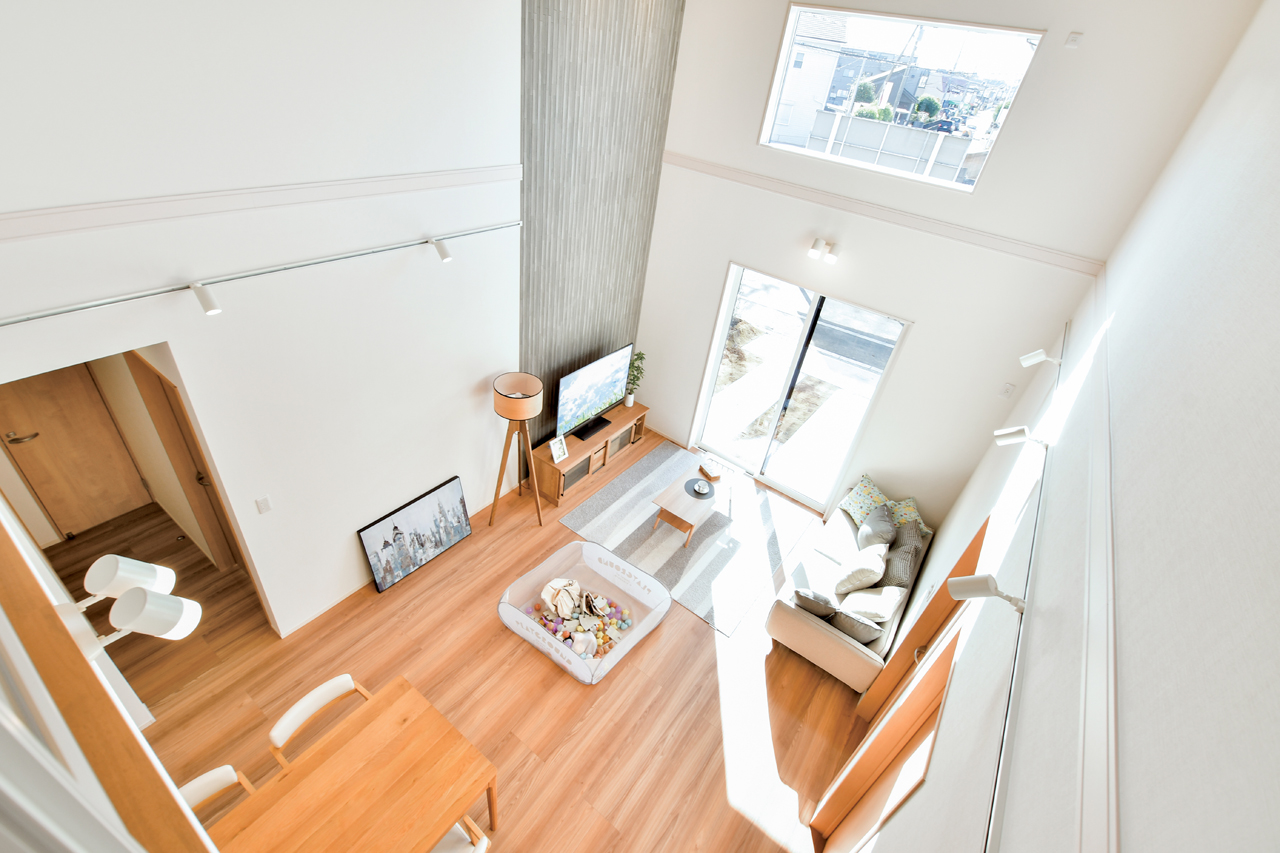 ご家族の団らんや寛ぎの中心となるリビング空間をさらに際立たせる吹抜け天井プラン。2階天井まで続くその圧倒的な存在感と広がりが訪れた方を驚きを持ってお迎えします。大切にしたいご家族やゲストをもてなす上質な空間です。