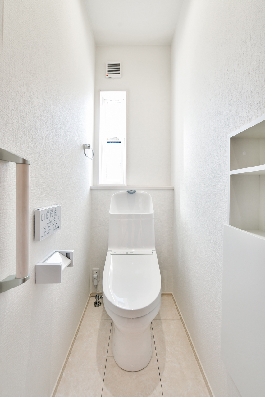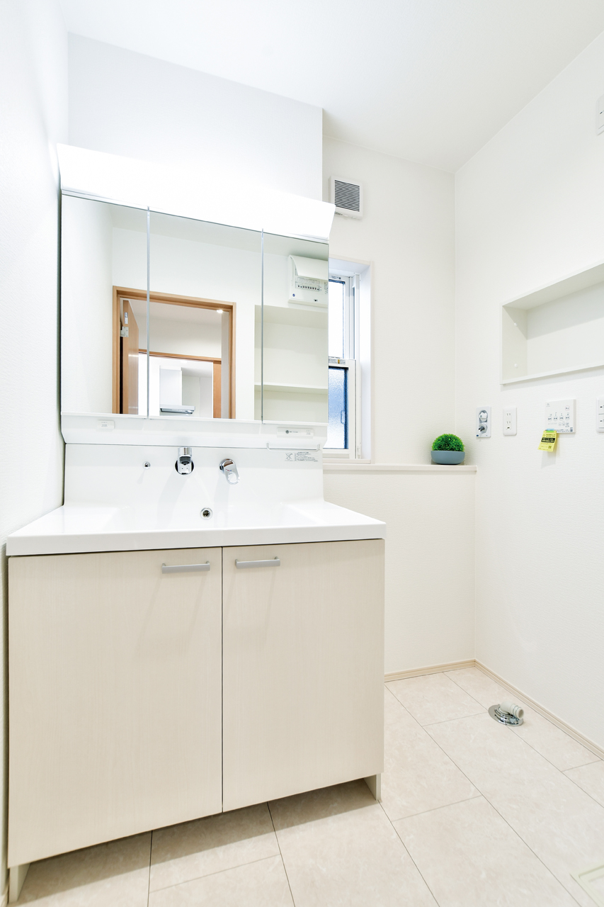 洗面室そばや2階ホールにランドリースペースを採用しました。天井には洗濯物の室内干しができるように吊り下げ式の物干金物をご用意。雨天に左右されずに洗濯ができて、花粉が付着する心配もありません。