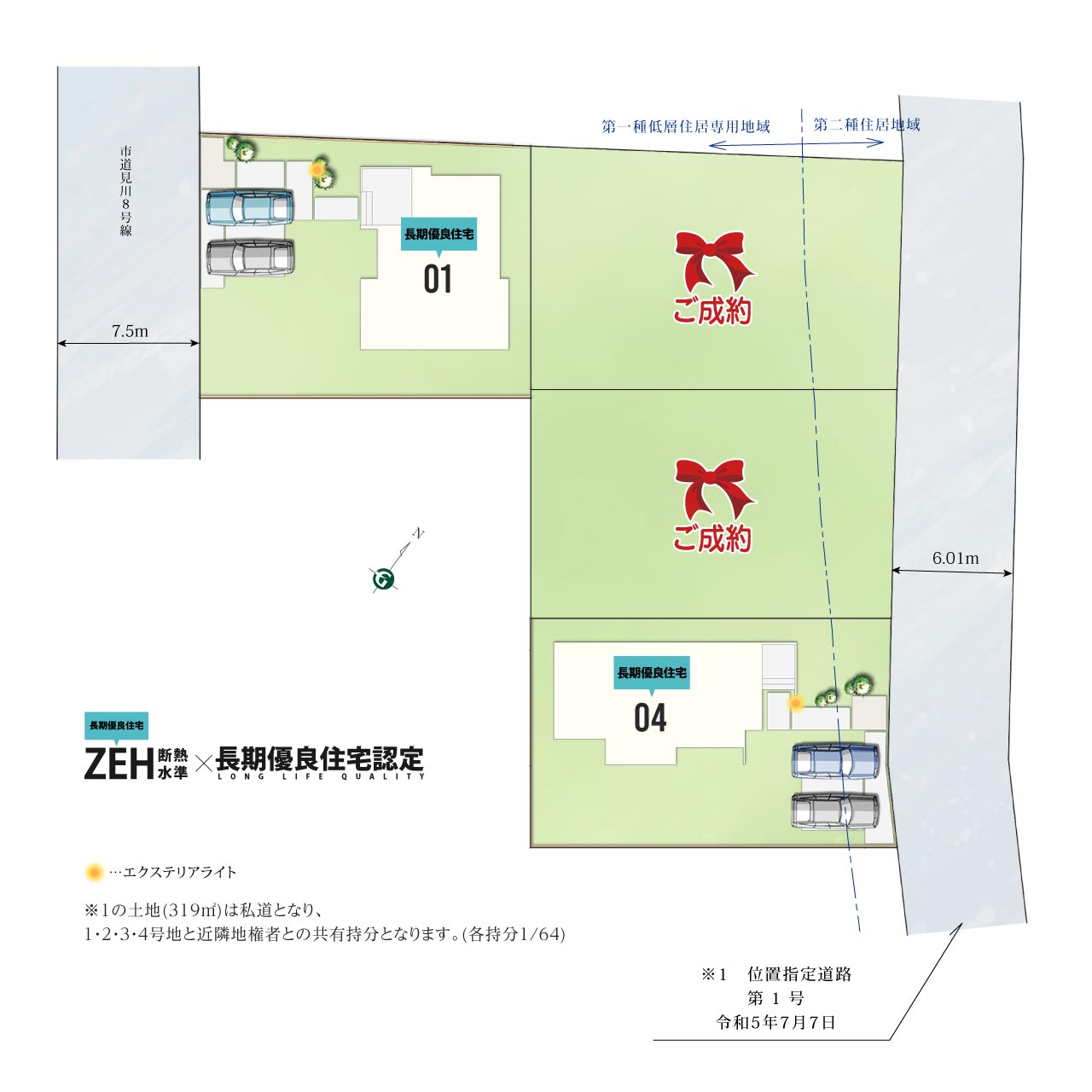 | 備考2 | ※各号地の上空を電線が通過します。 ※掲載の図面は計画段階の図面を基に描き起こしたもので、実際とは異なる場合がございます。また、施工上の理由及び改良のため変更することがございます。 ※その他共有持分/有「地番487-10(ゴミ置場)/15㎡ 持分各1/64(1,2,3,4号地、近隣地権者)」 |