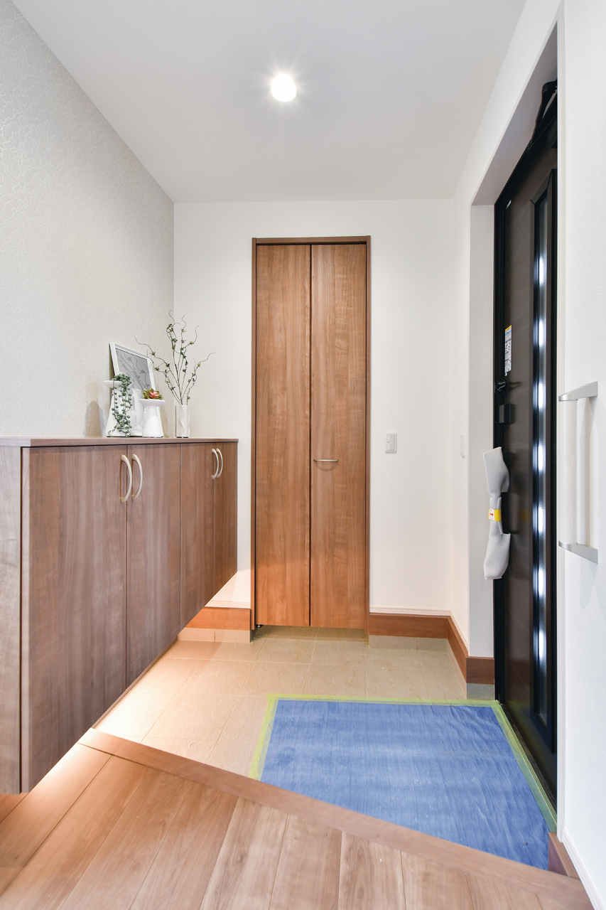 玄関ホールのそばに設けたクローゼットスペース。お出かけ用の上着やコート、レインウェアをはじめ、帽子や鞄などをまとめて収納できます。居住空間への花粉やウイルスなどの持ち込みを低減し、子ども達のお片付け習慣も自然と身につきます。