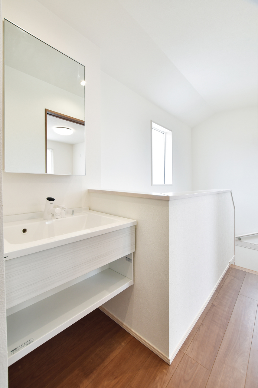 LDKにレイアウトしたカウンタースペース。子ども達の学習スペースやパパのSOHOスペース、ママのワーキングスペースなど、用途やスタイルに応じて多彩に活躍。家族のそばでみんなが利用できるライブラリー空間です。