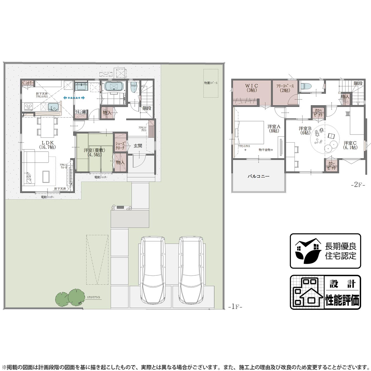 通勤やレジャーなど、ライフスタイルを広げてくれるカースペースを2台分確保しました。来客用の駐車スペースとしても最適です。