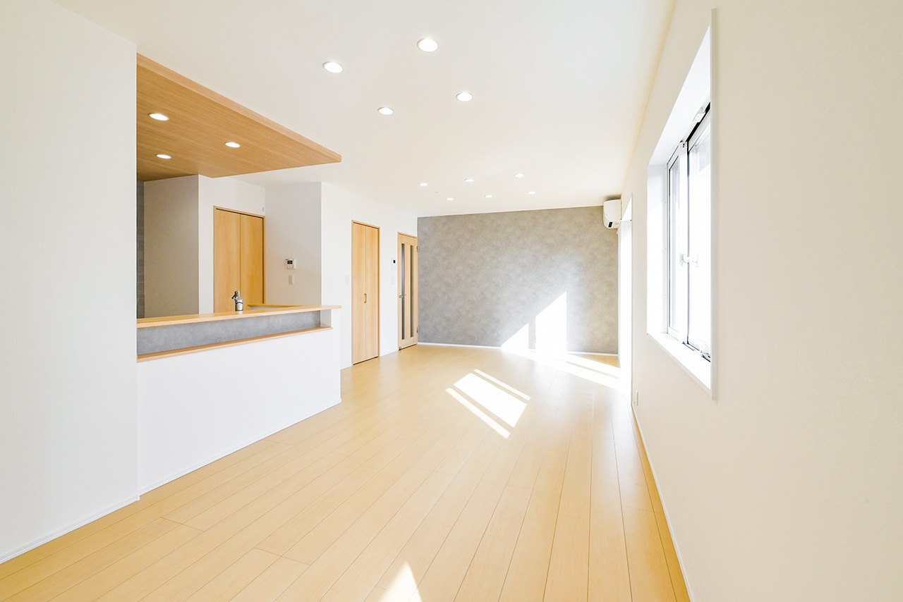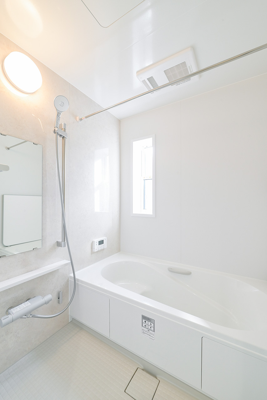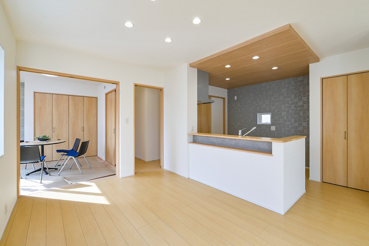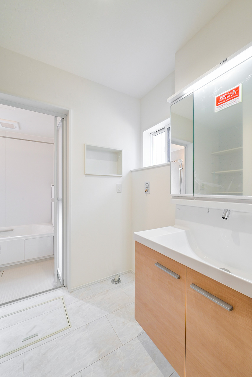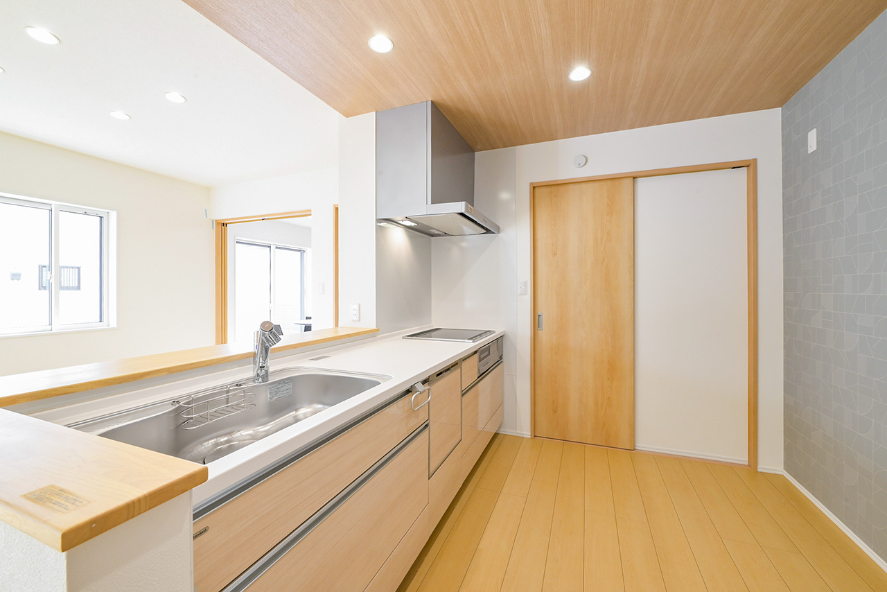 キッチンから洗面室・浴室までを最短距離で結んだ水回り動線設計。家事の移動距離を短縮するとともに、動線上には収納スペースなどをレイアウトし機能性も高めました。スマートな動線設計と時短設備が子育てにがんばるご家族をサポートします。