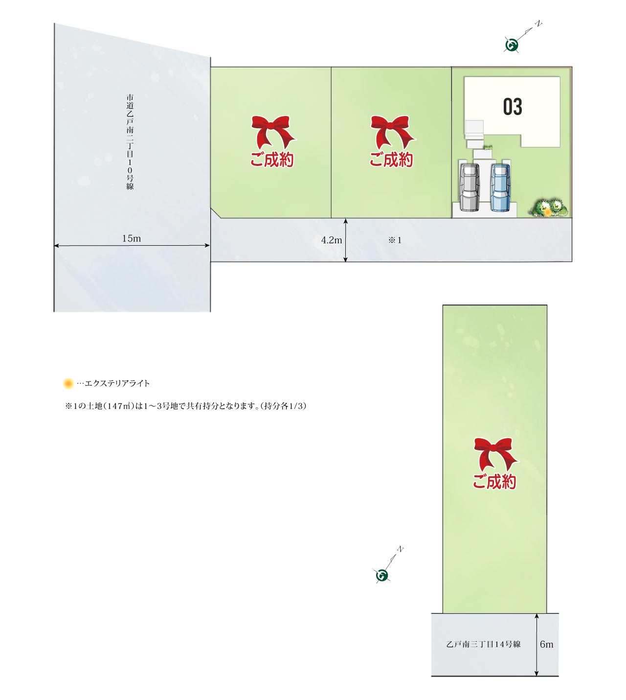 有「販売区画図※1/147m2持分各1/3」(1〜3号地)用途地域 第1種中高層住居専用地域 地域指定 有「建築基準法 第22条区域」「景観法」 地域区分 市街化区域 総戸数 全4戸 取引態様 売主( 茨城グランディハウス株式会社 ) 販売支店 茨城グランディハウス 県南支店 更新日 2025年10月30日 次回更新予定日 2025年11月13日 備考1 ※更新・メンテナンス中に予約・売約済の場合はご容赦願います。