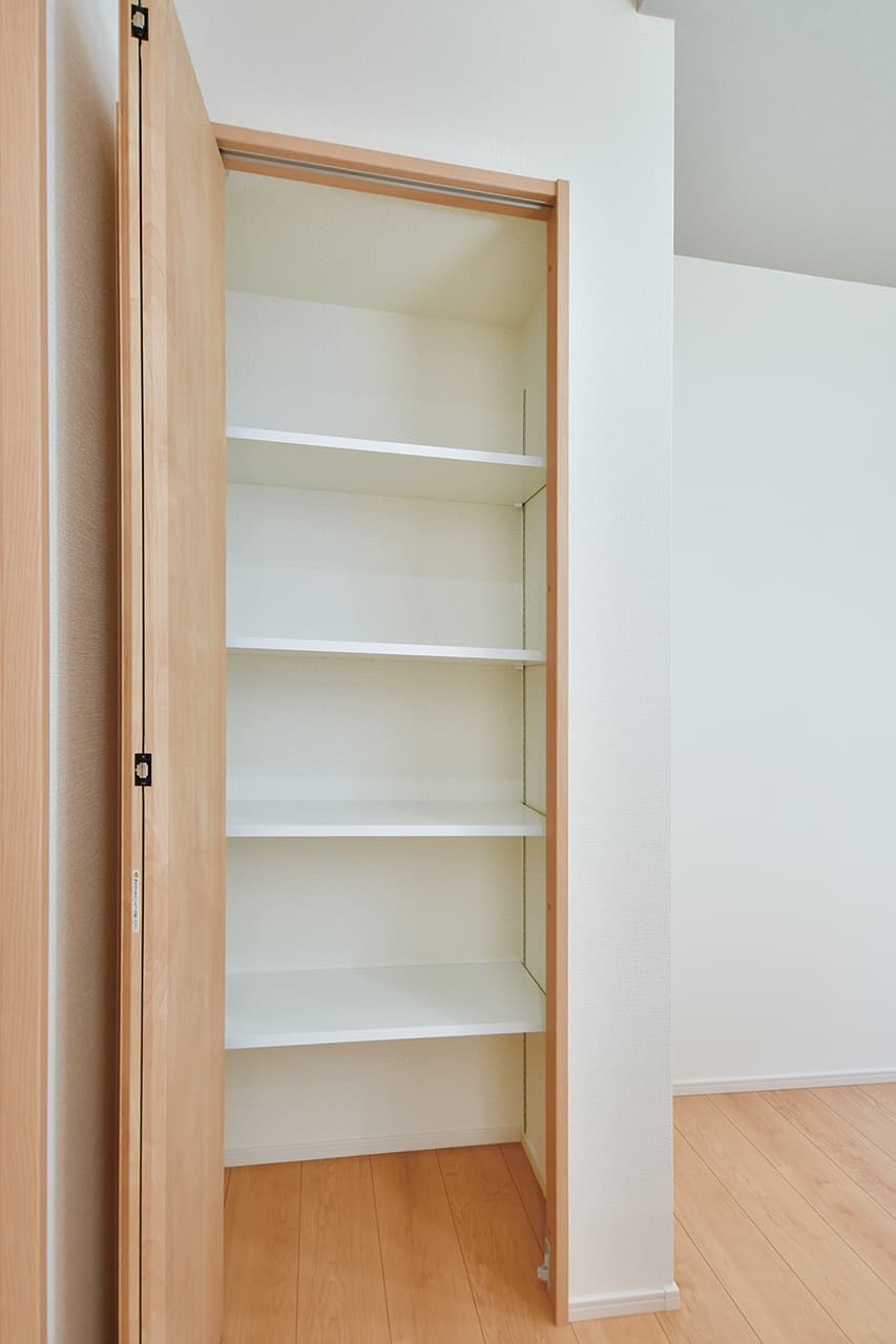 1階・2階のホールやリビングのそばに、用途やライフスタイルに合わせて自由にお使いいただける大容量の収納スペースをご用意しました。季節の衣類から鞄などの小物まで、たっぷりまとめて収納できます。