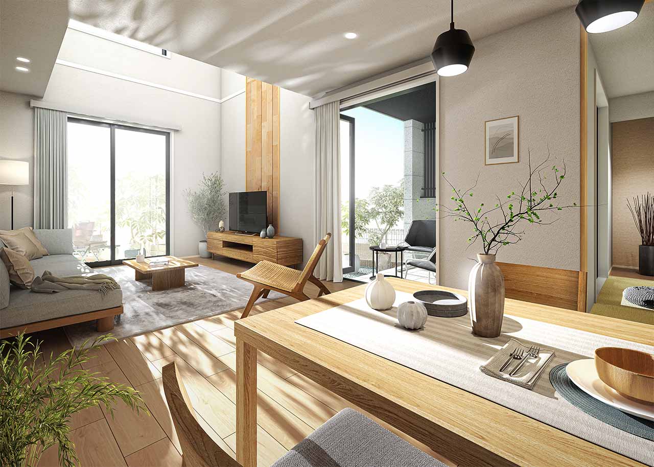 ご家族の団らんや寛ぎの中心となるリビング空間をさらに際立たせる吹抜け天井プラン。2階天井まで続くその圧倒的な存在感と広がりが訪れた方を驚きを持ってお迎えします。大切にしたいご家族やゲストをもてなす上質な空間です。