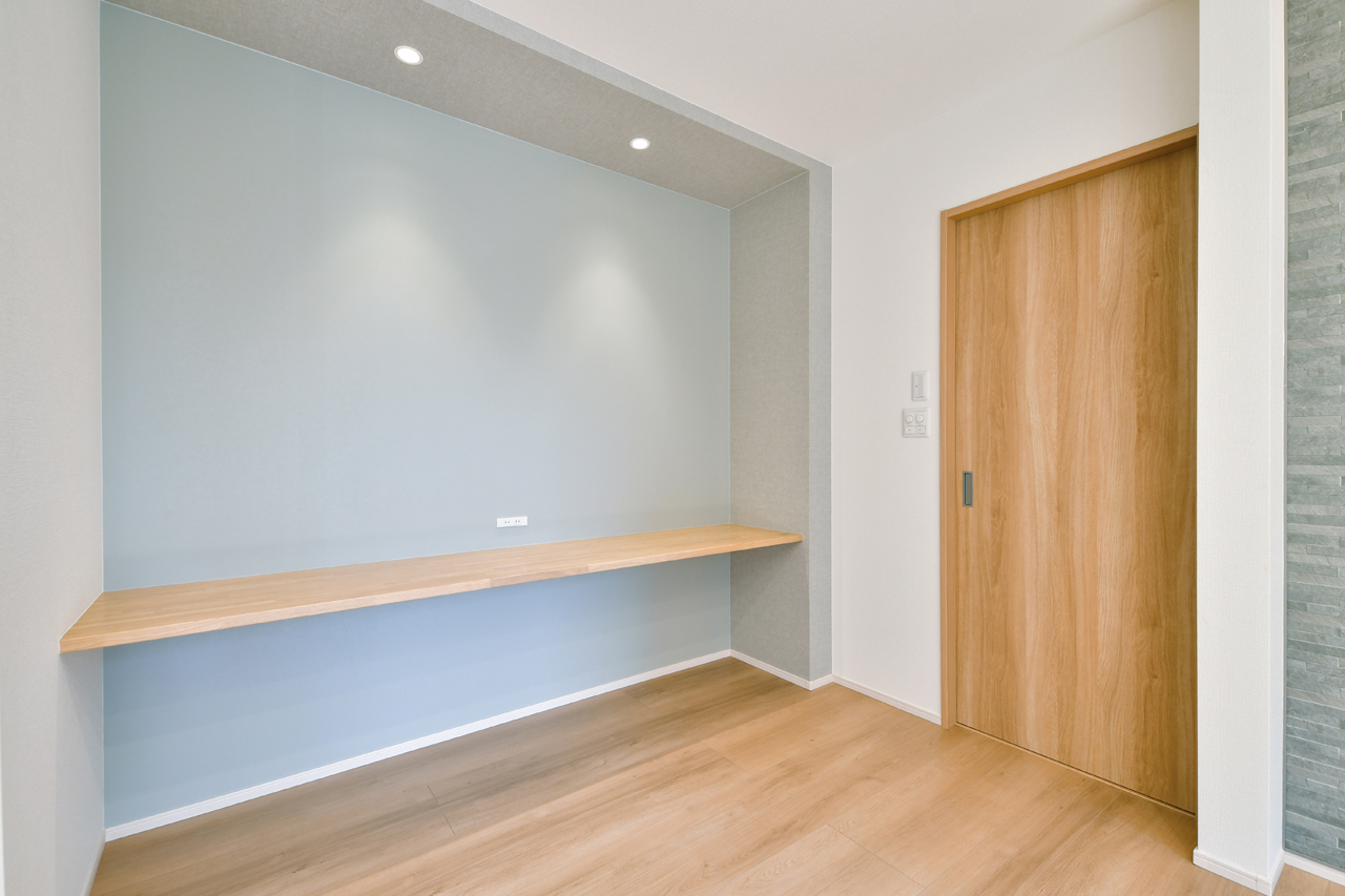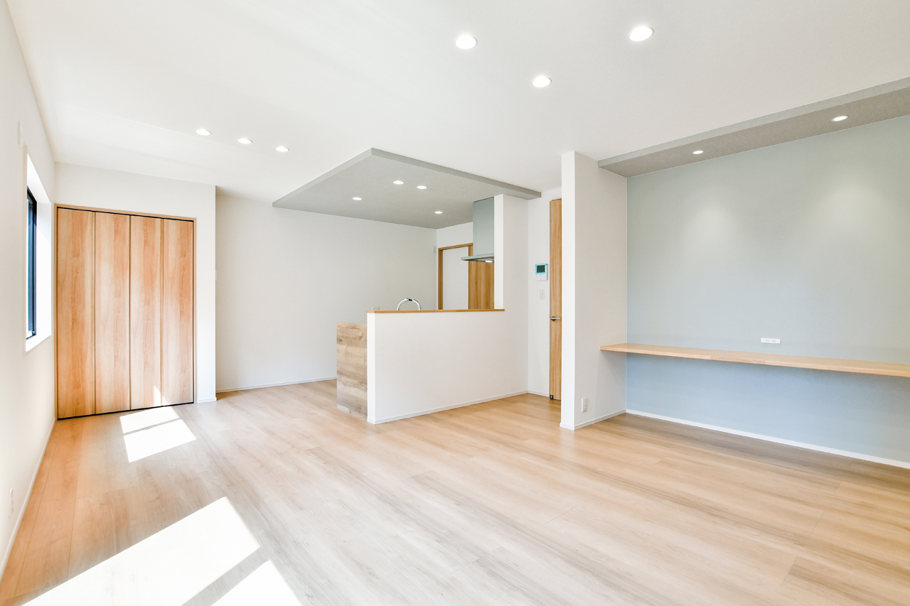LDKにレイアウトしたカウンタースペース。子ども達の学習スペースやパパのSOHOスペース、ママのワーキングスペースなど、用途やスタイルに応じて多彩に活躍。家族のそばでみんなが利用できるライブラリー空間です。