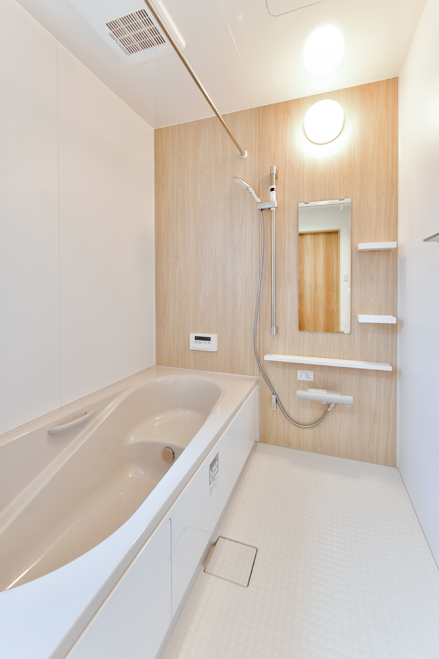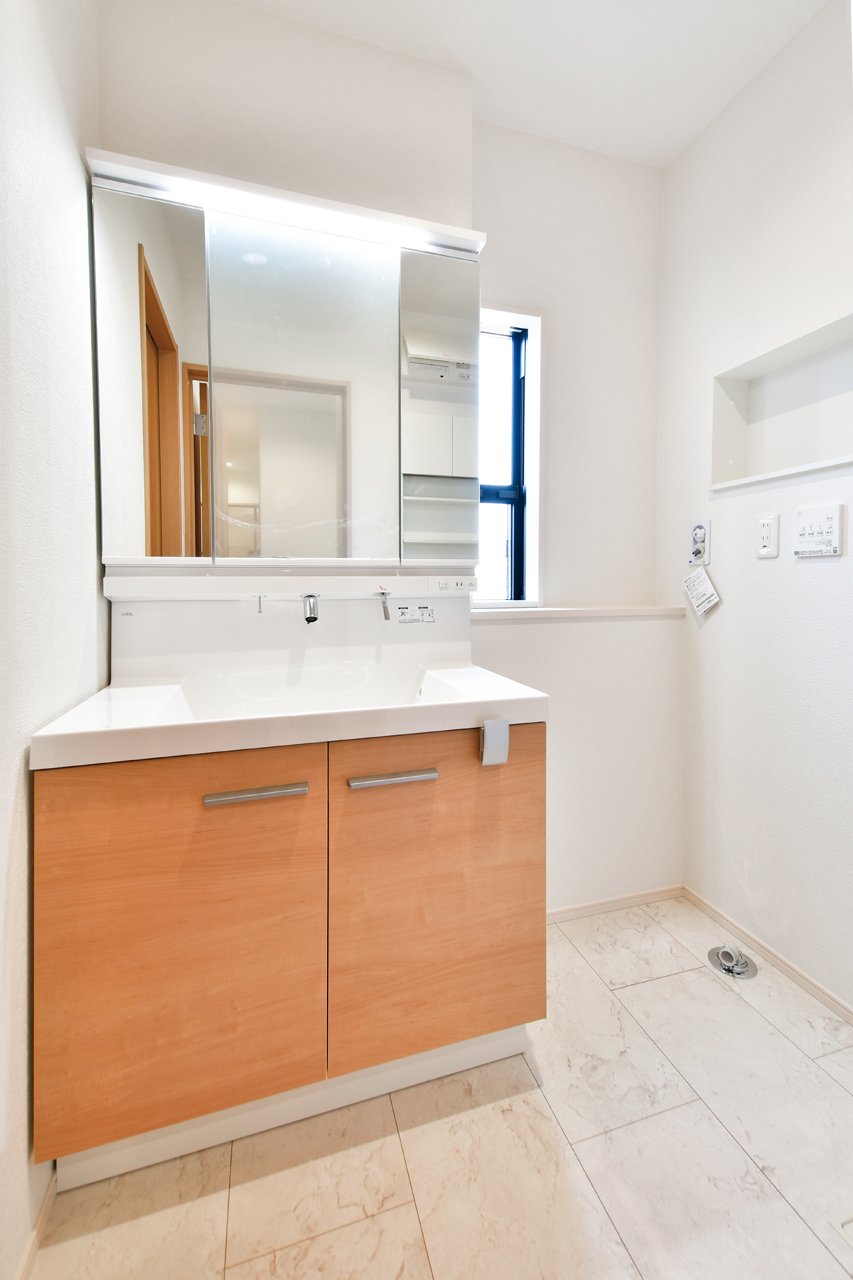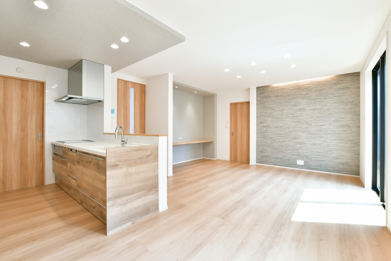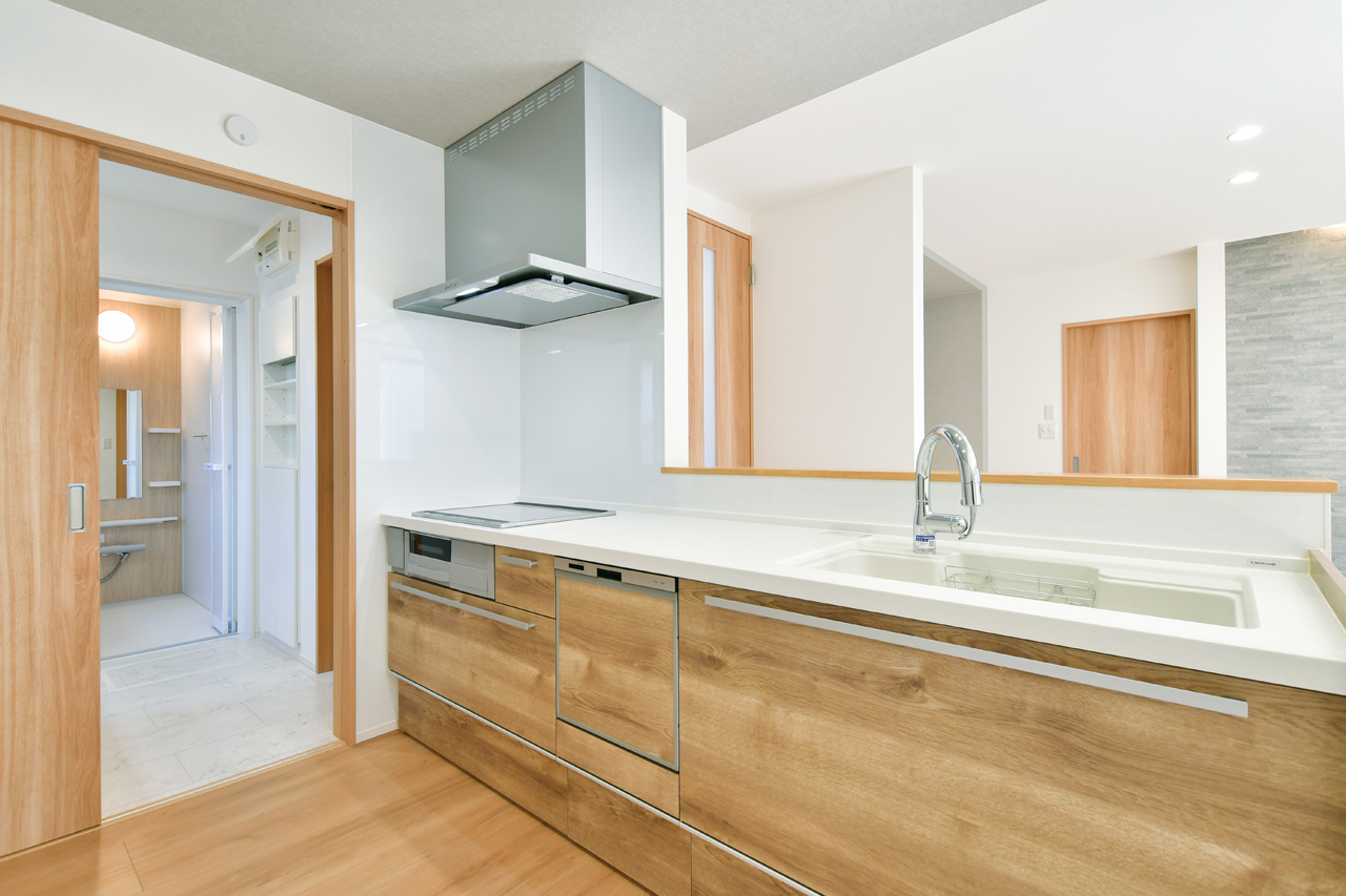 キッチンから洗面室・浴室までを最短距離で結んだ水回り動線設計。家事の移動距離を短縮するとともに、動線上には収納スペースなどをレイアウトし機能性も高めました。スマートな動線設計と時短設備が子育てにがんばるご家族をサポートします。