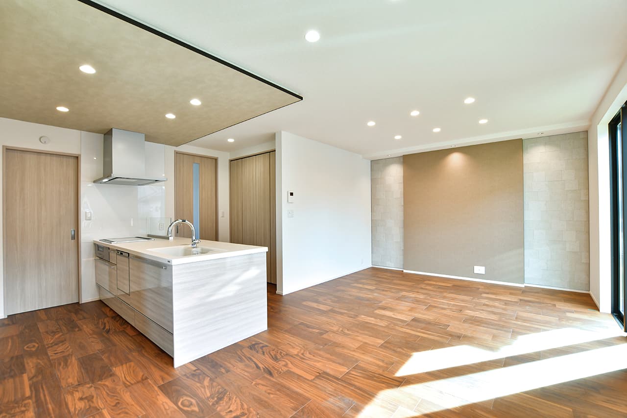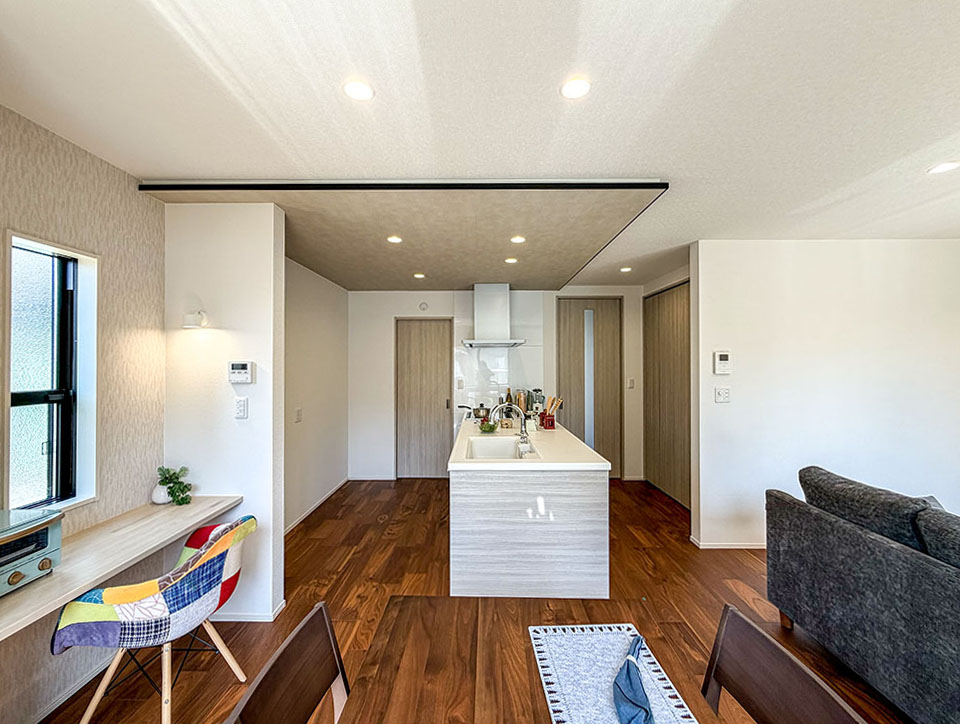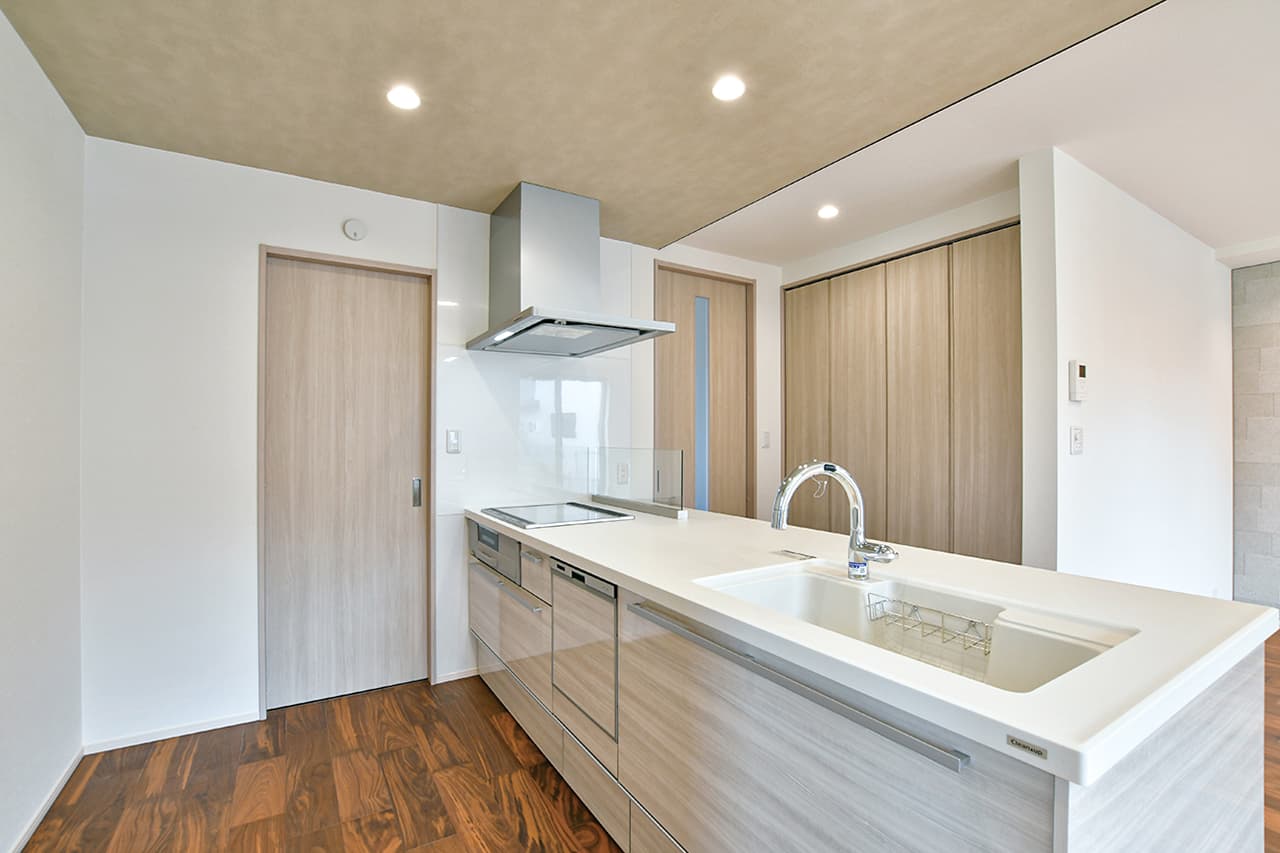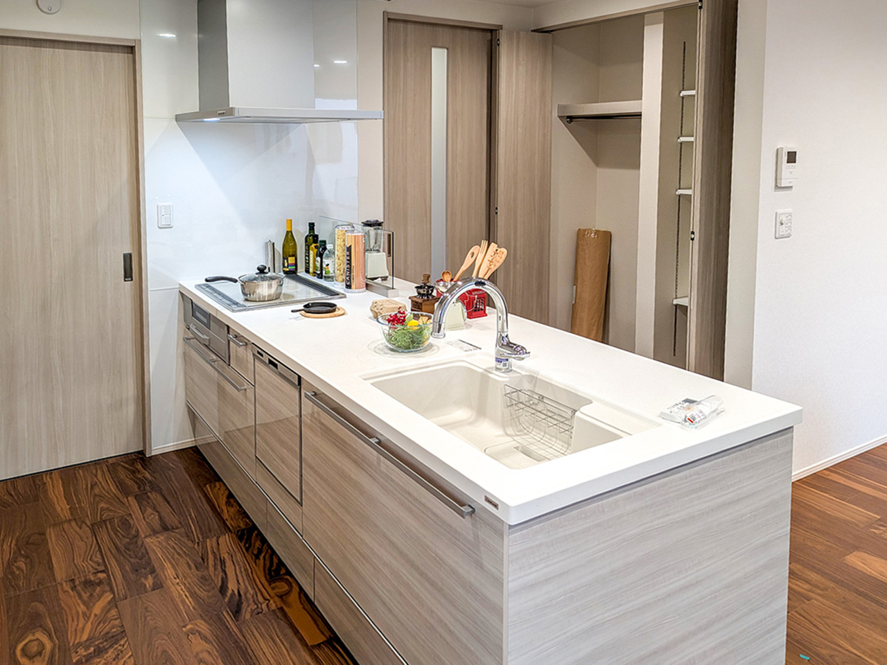 LDK空間の広さをより実感できるオープンキッチン。開放的で目線を遮るものがなくコミュニケーションが取りやすいため、料理をしながらの会話も弾み、お手伝いにも気軽に参加できます。