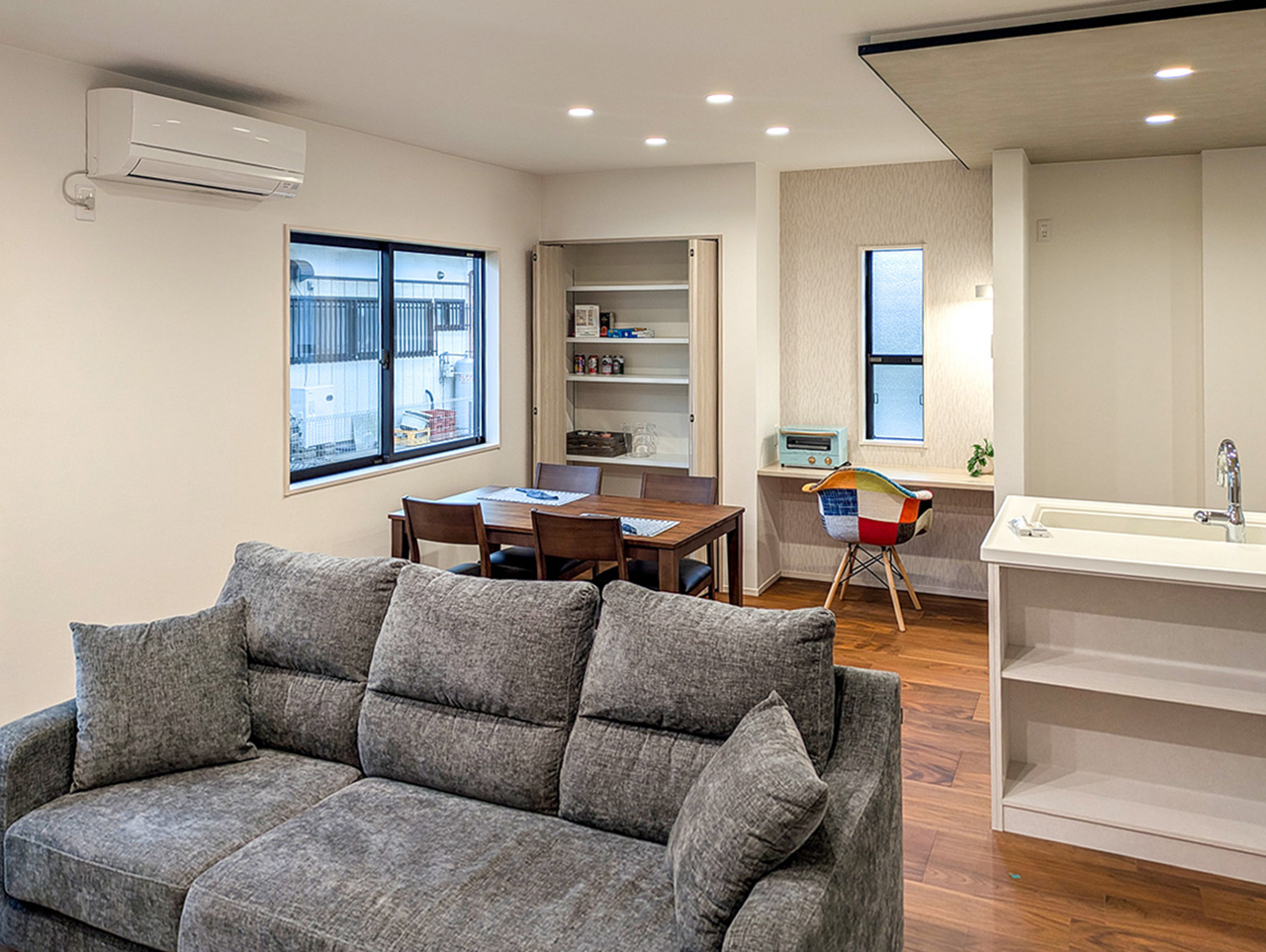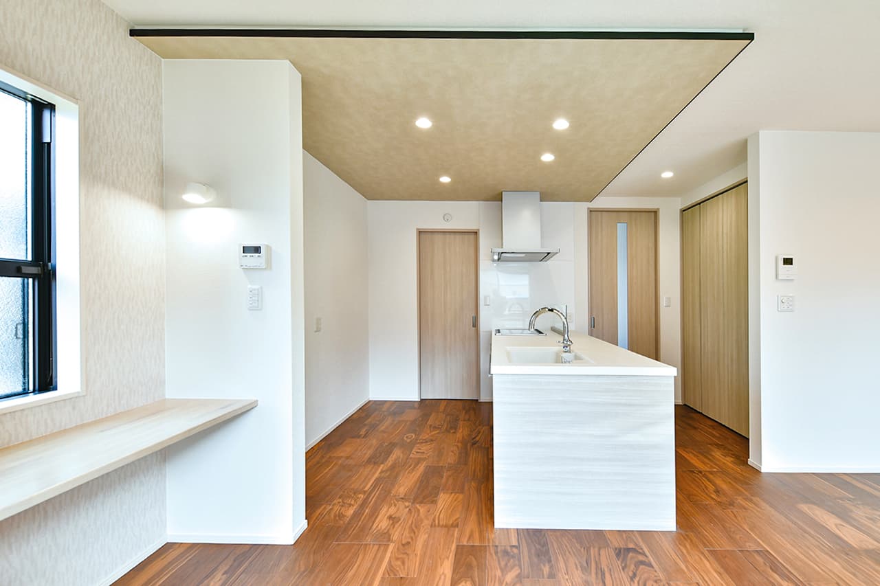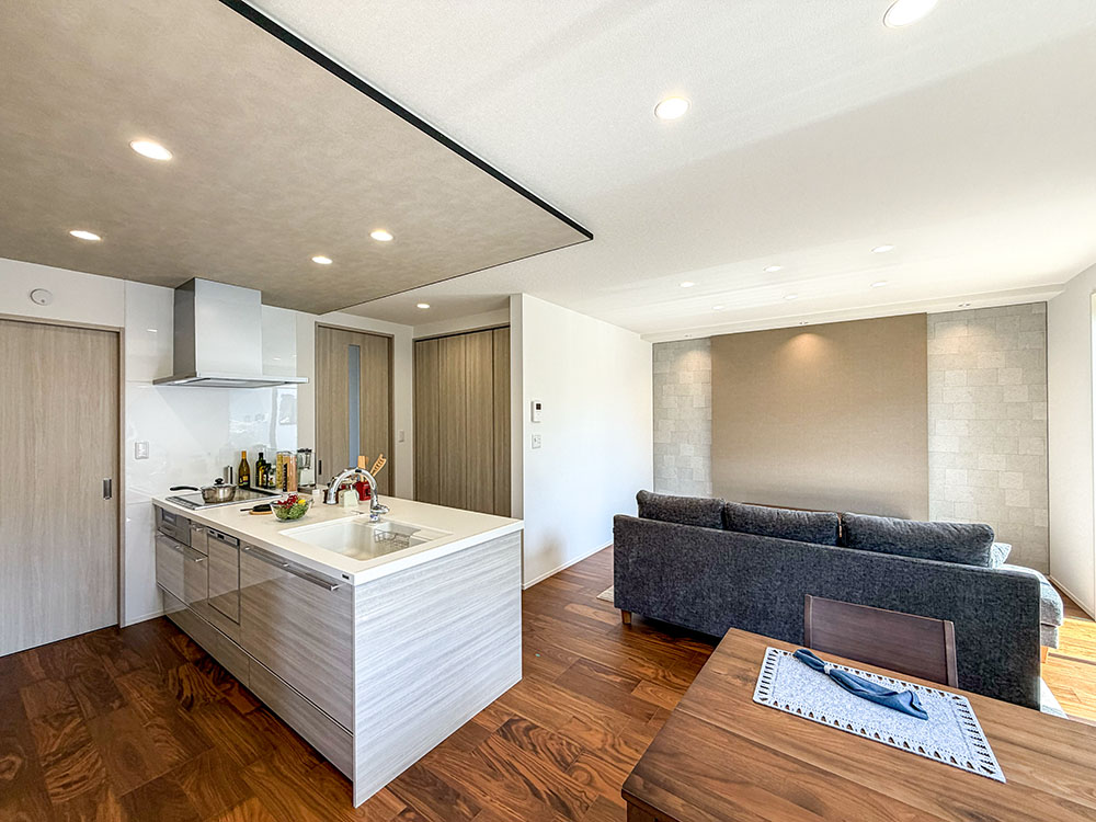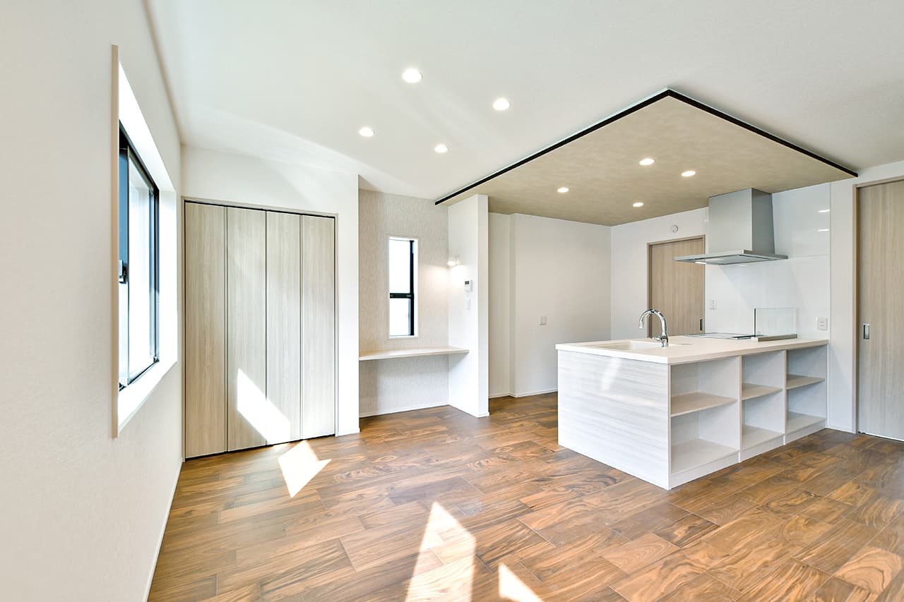 LDK空間の広さをより実感できるオープンキッチン。開放的で目線を遮るものがなくコミュニケーションが取りやすいため、料理をしながらの会話も弾み、お手伝いにも気軽に参加できます。