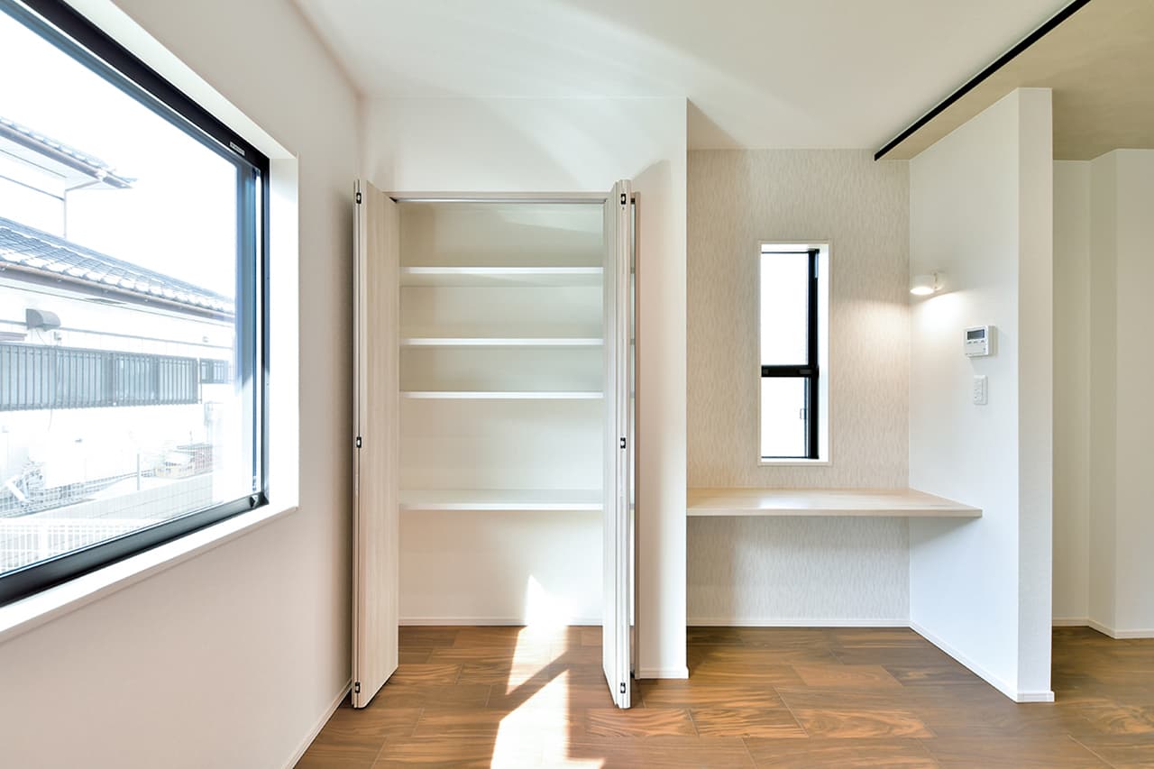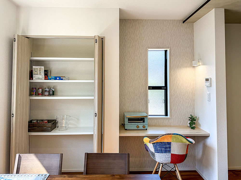 LDKにレイアウトしたカウンタースペース。子ども達の学習スペースやパパのSOHOスペース、ママのワーキングスペースなど、用途やスタイルに応じて多彩に活躍。家族のそばでみんなが利用できるライブラリー空間です。