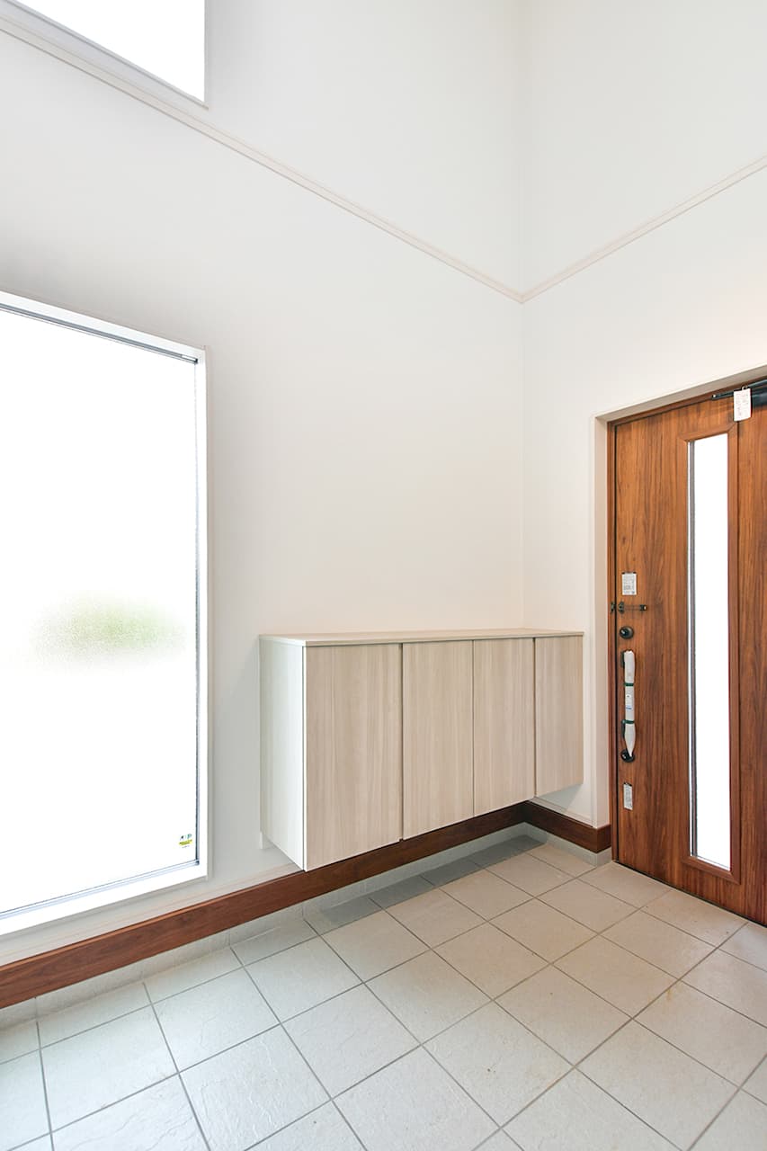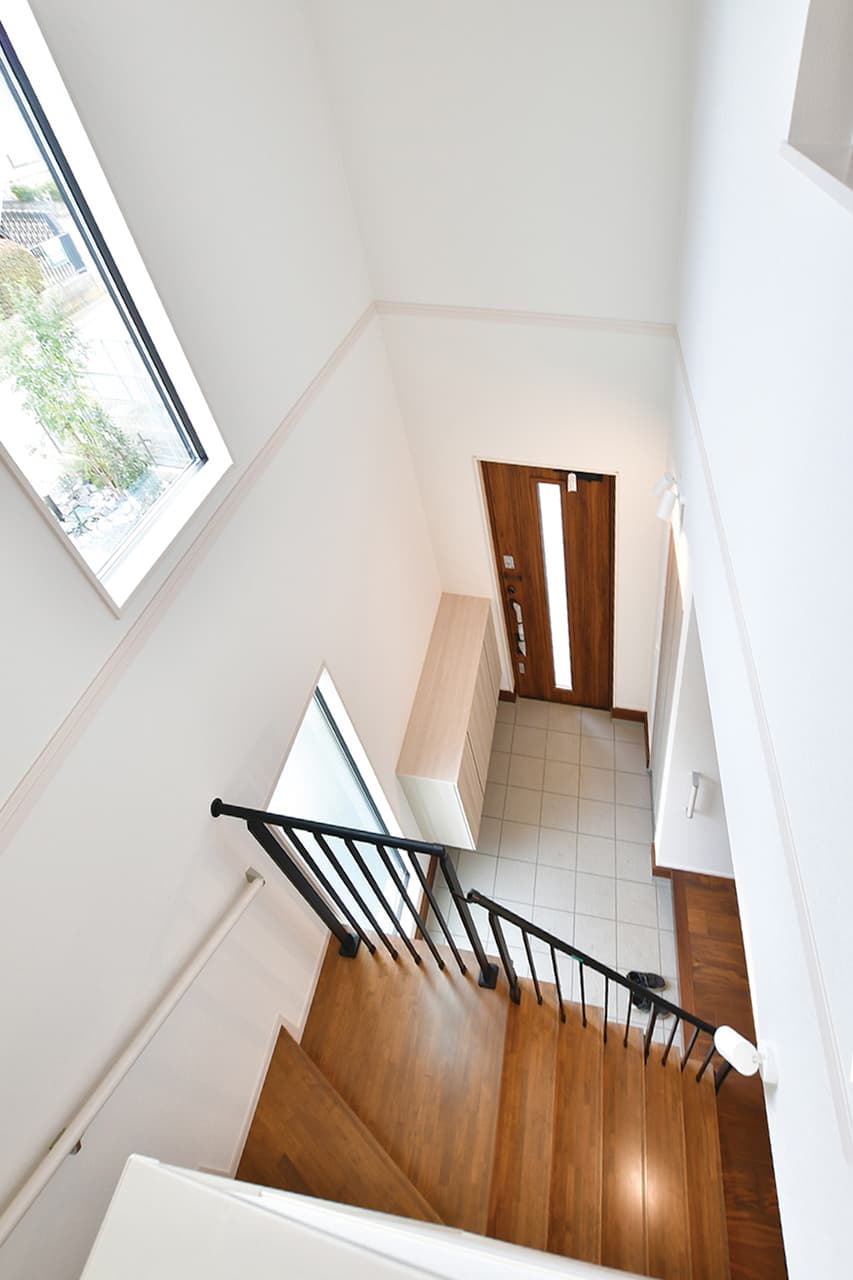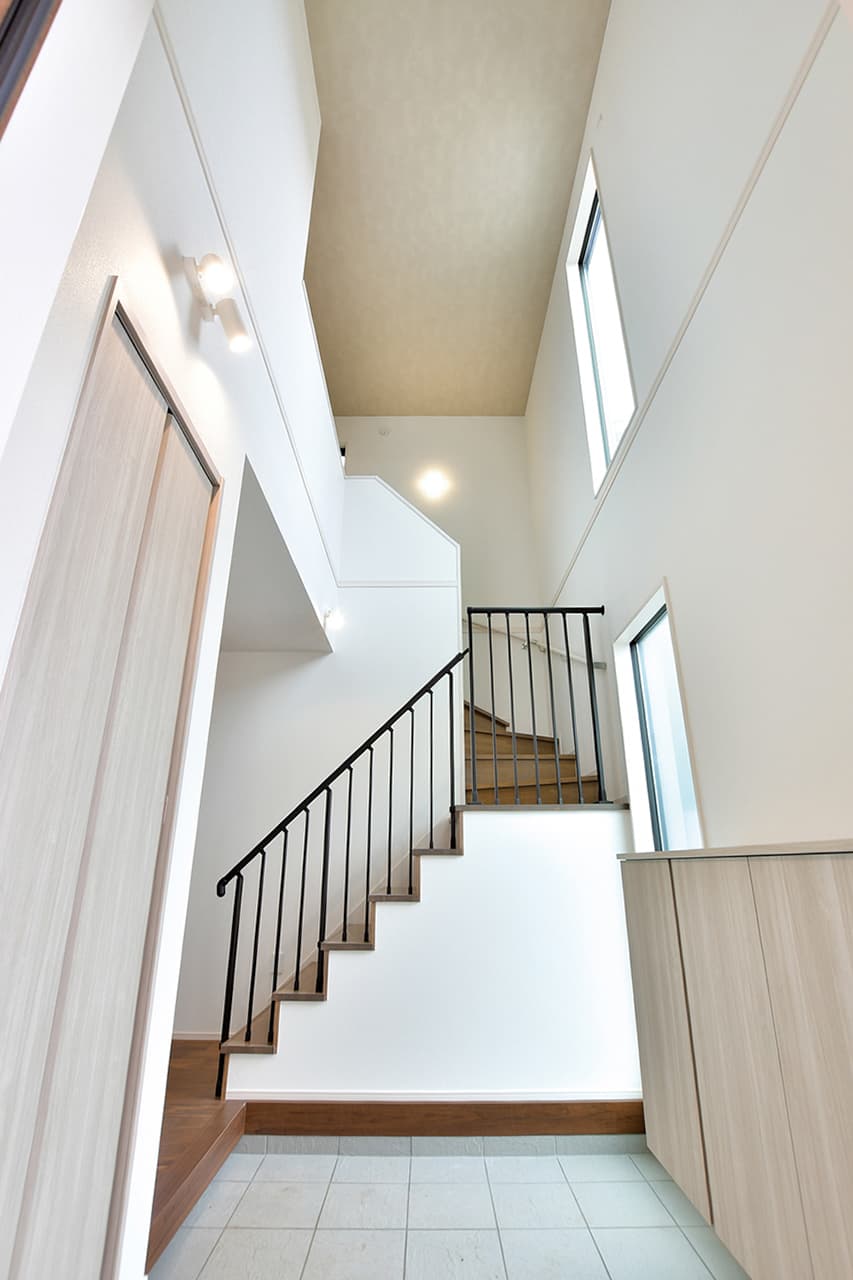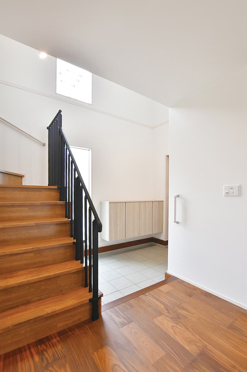 のびのびとした心地よさを生み出す玄関ホールの吹き抜け。縦へと伸びる空間の変化と、上部から導かれた光が、ご家族や訪れるゲストをあふれる開放感とともにお迎えします。