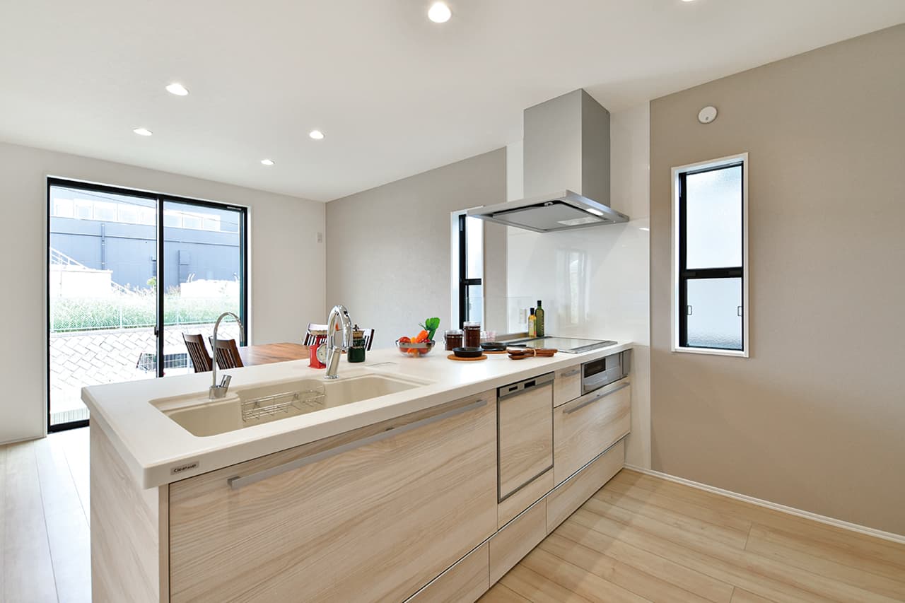 家族でのコミュニケーションがとれる対面型システムキッチンです。横一列にシンクとコンロをまとめたシンプルな形です。動きやすさとスタイリッシュなデザインが魅力です。