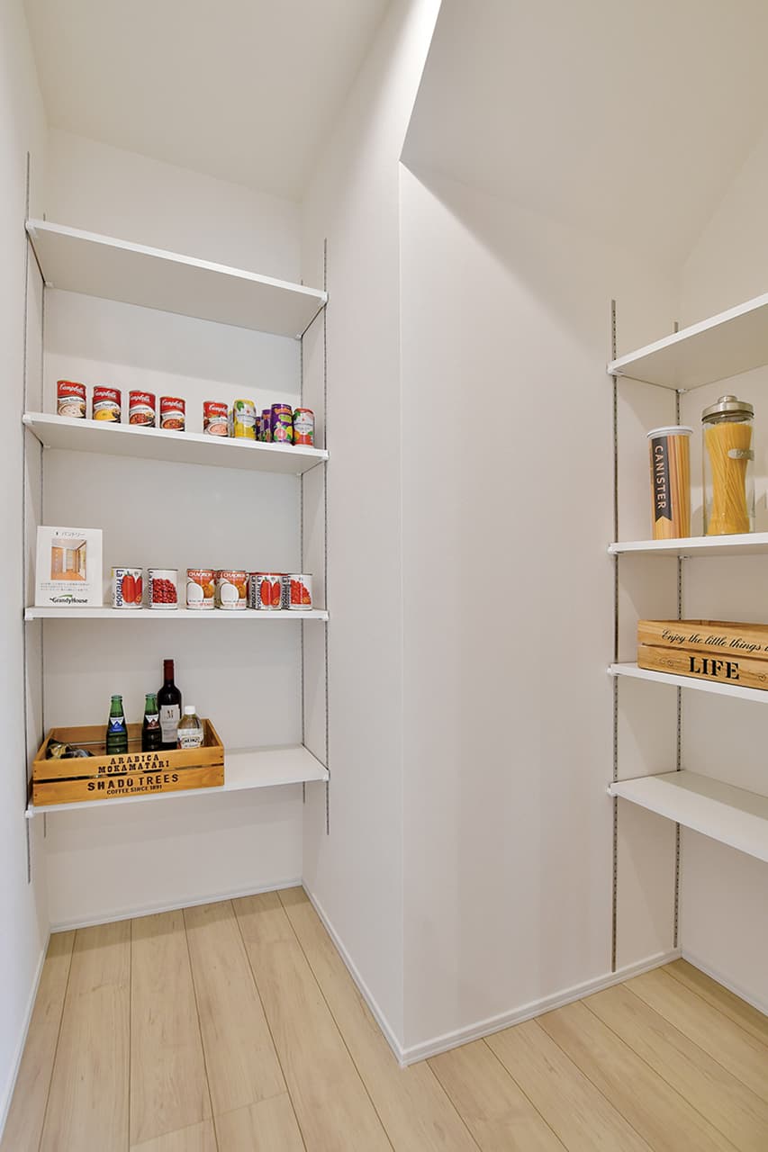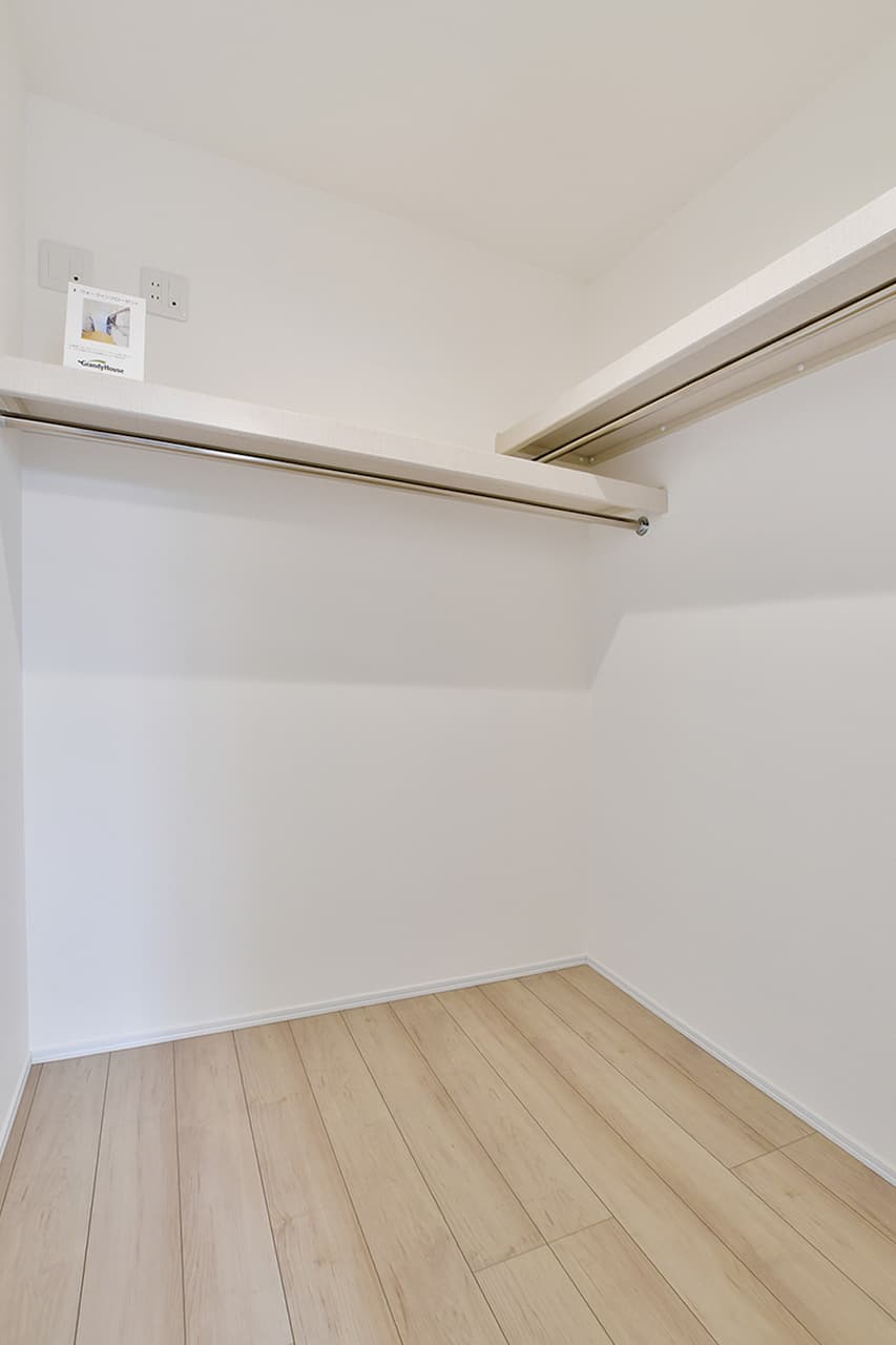 ご夫婦や子ども達の衣類をたっぷりしまえる大容量のウォークインクローゼット。季節の衣類から鞄や帽子などの小物までたっぷり保管可能。ウォークインタイプなので衣類の出し入れや整理整頓もスムーズに行えます。