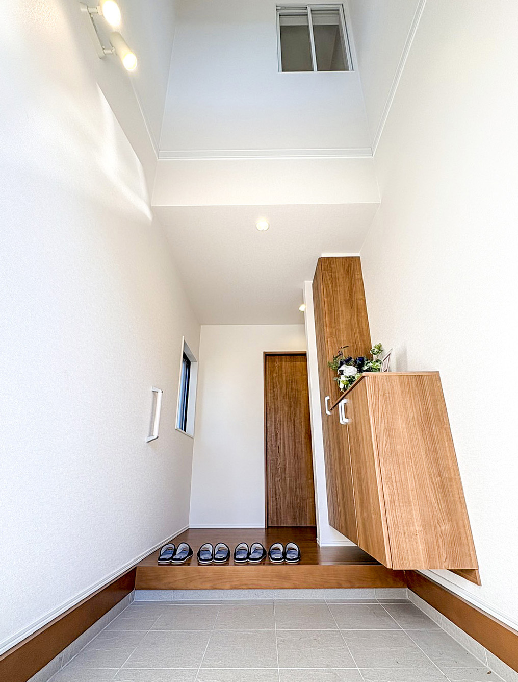 のびのびとした心地よさを生み出す玄関ホールの吹き抜け。縦へと伸びる空間の変化と、上部から導かれた光が、ご家族や訪れるゲストをあふれる開放感とともにお迎えします。
