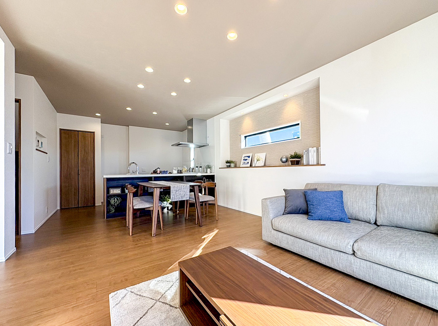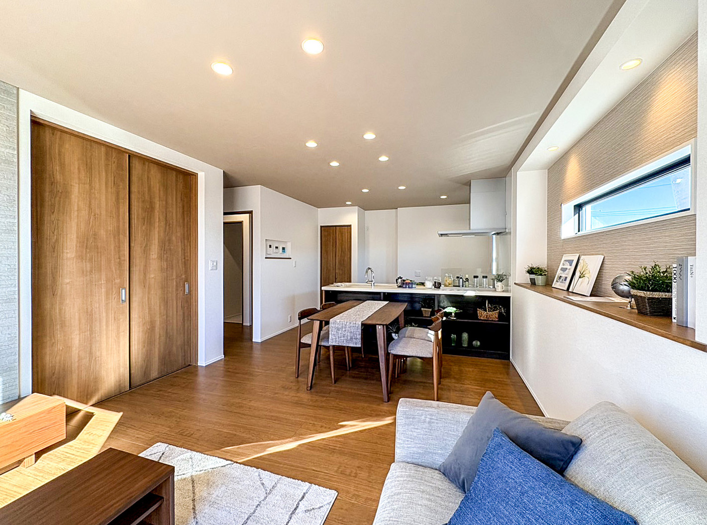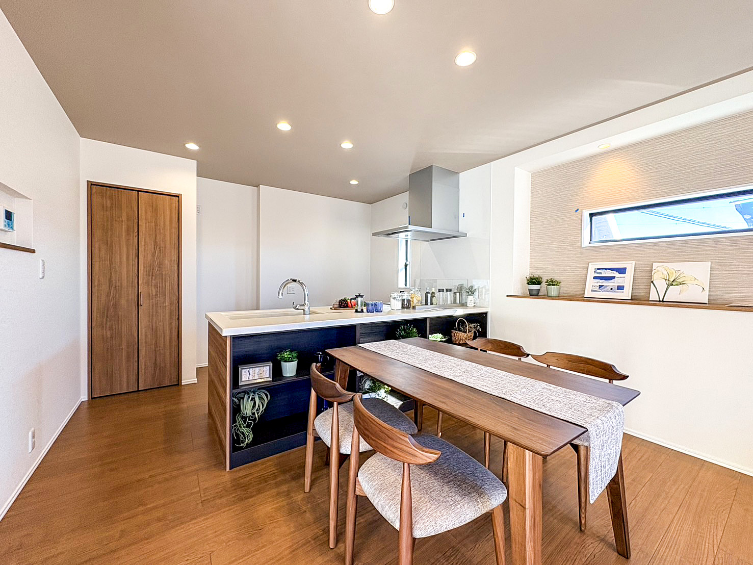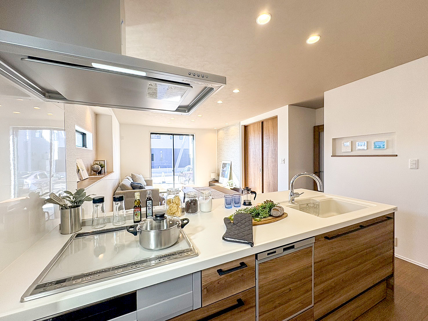 LDK空間の広さをより実感できるオープンキッチン。開放的で目線を遮るものがなくコミュニケーションが取りやすいため、料理をしながらの会話も弾み、お手伝いにも気軽に参加できます。