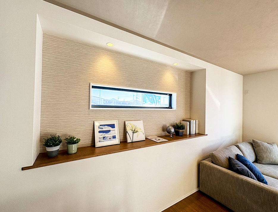趣味や家事に利用できるデスクや飾り棚、収納スペースとしてなど、多目的に使えるカウンターを設けました。